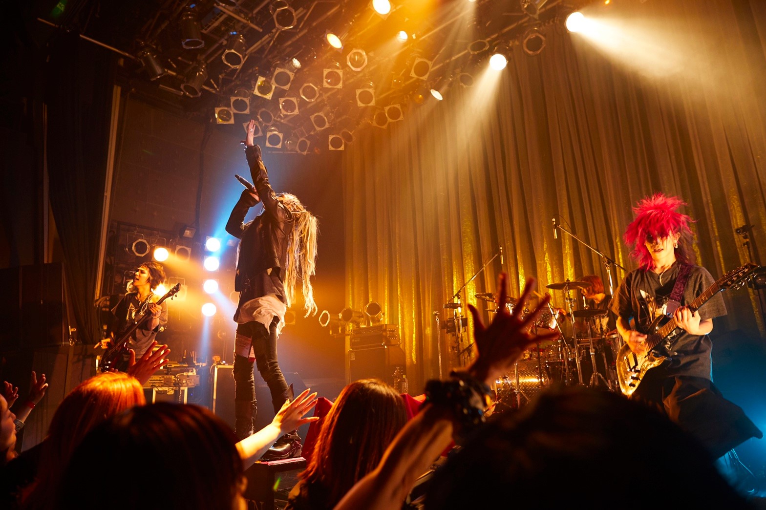 独特な美しさと世界観を放つSEの音色に乗せ、舞台へ姿を現したメンバーたち。息を呑むようにステージを見つめる観客席へ向けて放たれた最初の一音はヴァイオリンの音色だ。ライブはヒカリトの奏でる艶やかなヴァイオリンの調べに重厚な音を塗り重ねてゆく『Antithese』から幕を開けた。麗しくも憂いを持った歌声と豪快な音の交じり合う楽曲が、触れた人たちの意識を黒い奈落の底へ引きずり込む。祈りのように胸に堕ちるヒカリトの歌声。誰もが彼らに導かれるまま、熱い音のうねりの中へ心地好く身を浸していた。