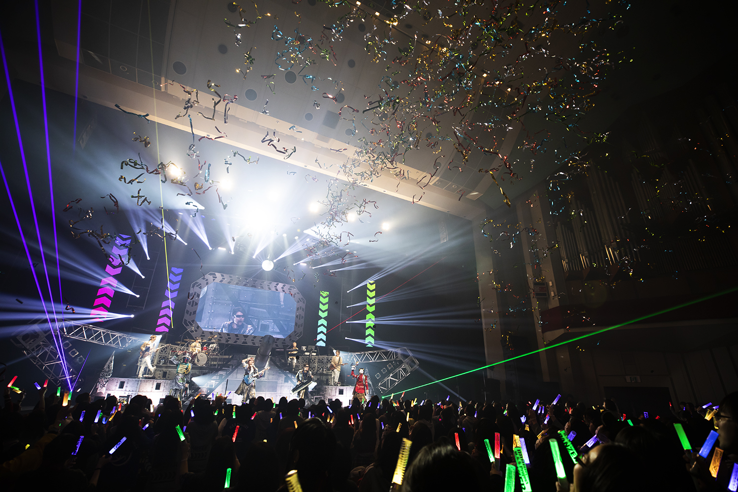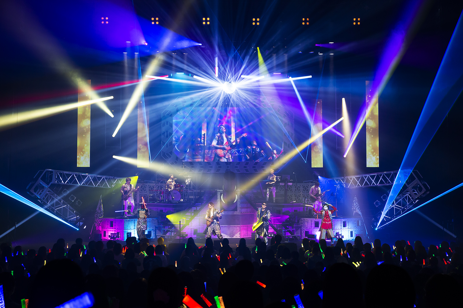 きっくん(=KIKKUN-MK-・)の華麗なギターが炸裂するハードなロックチューンで、FB(=FB777)もショルダーキーボードで熱演。あろまほっととeoheohは息の合ったダンスで場内を沸かせていく。