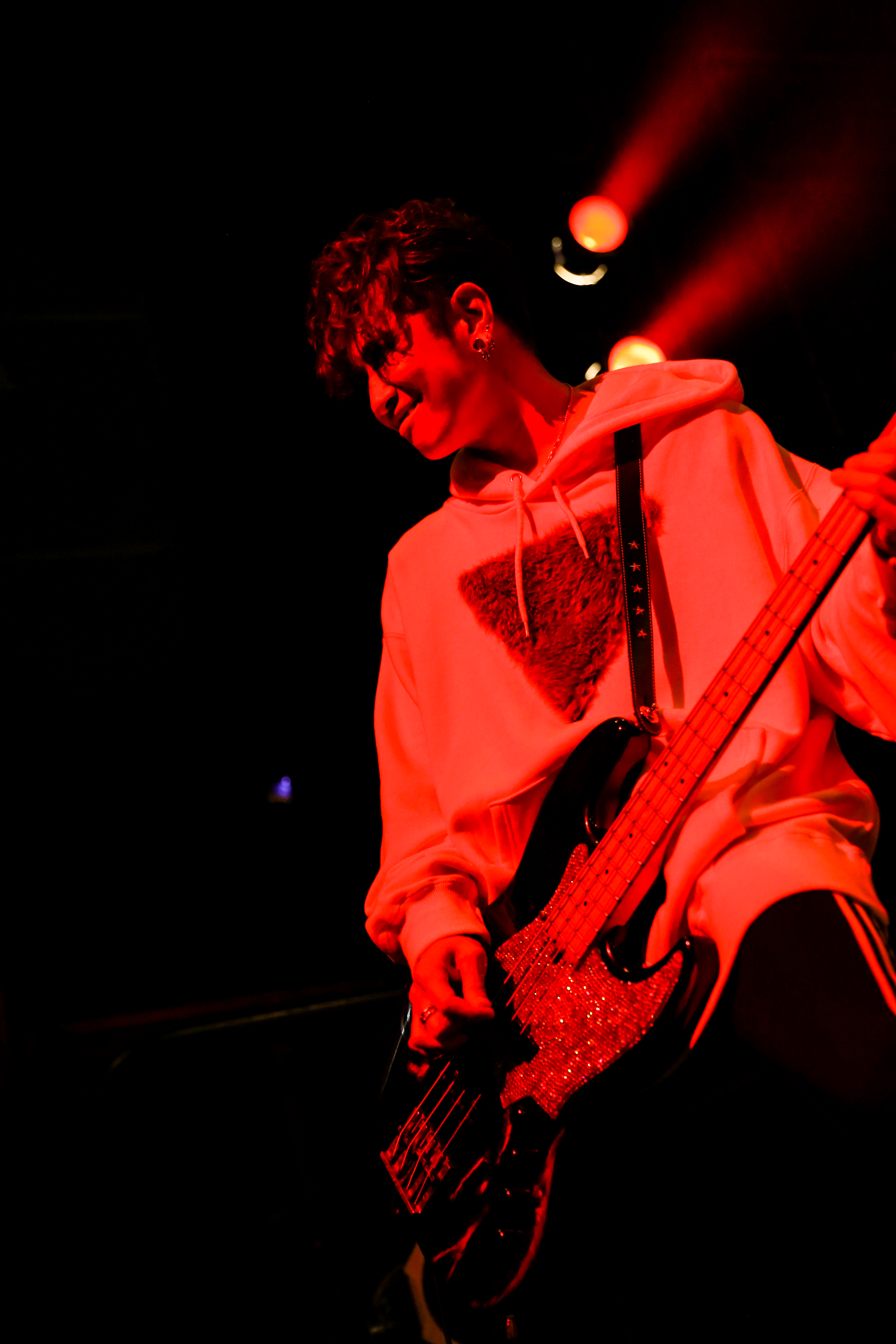JINが拳を振りまわすのを合図に飛びだしたのが、『ドラマ』。スリリングな演奏と温かな歌が交錯。SANAの冴え渡るギターの上で、JINが儚さを抱いた歌声を響かせる。身体は熱を求めながら、心は、緩急巧みに色を変えてゆく感情的なJINの歌に惹かれていた。『会いたくて』を通し第2期MASKが描いたのは、今にも壊れそうな弱さと切なさ。痛い気持ちが募るほど、繊細ながらも力強い演奏が嘆く気持ちを後押ししてゆく。切ない物語へ色を差してゆく手腕は、流石だ。切なさへ想いを塗り重ねるように、第2期MASKは『C』を演奏。なんて哀愁を抱いた歌だろう。改めて哀切なドラマを描き出すJINのヴォーカリストとしての表現力の高さに心が引き込まれていた。