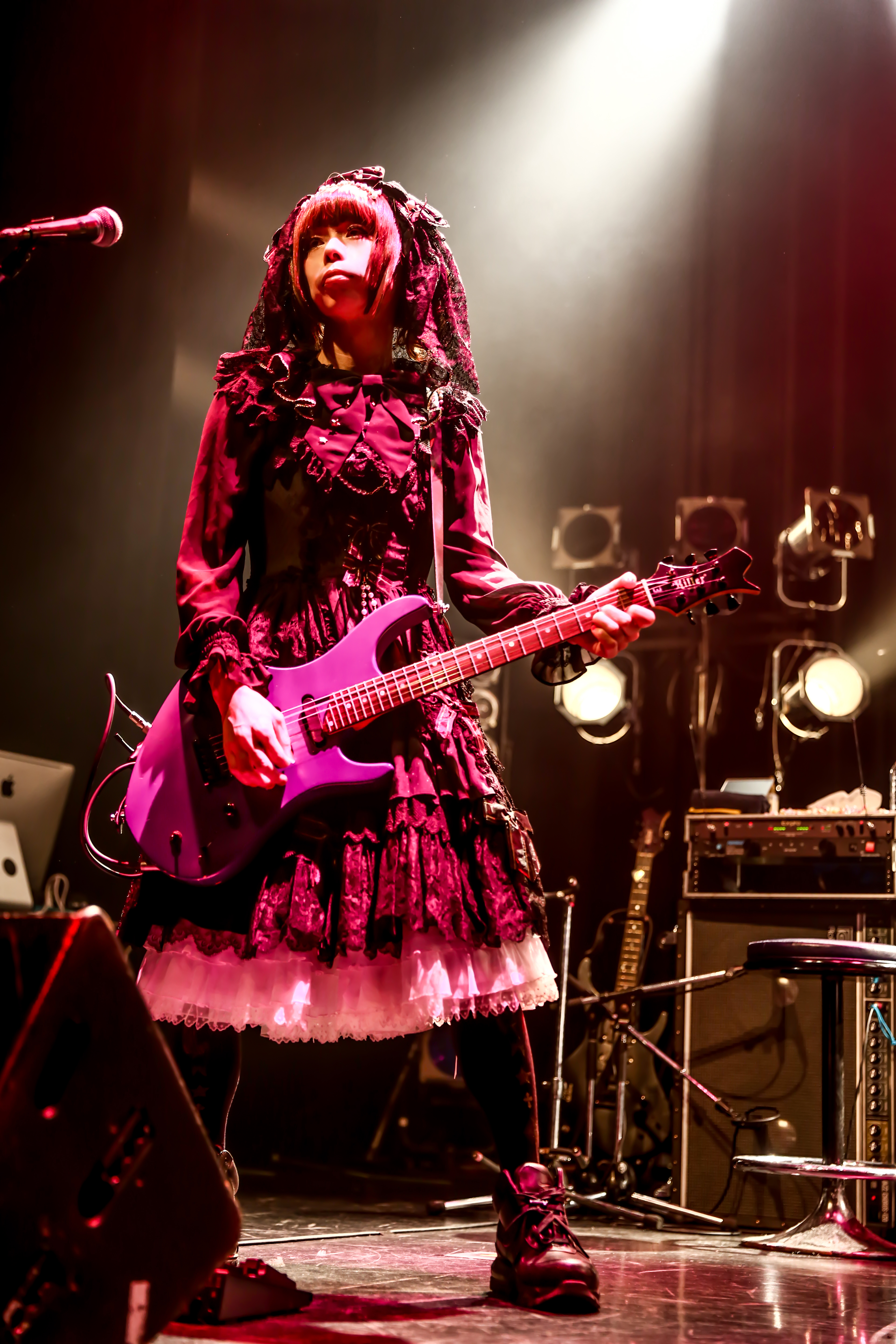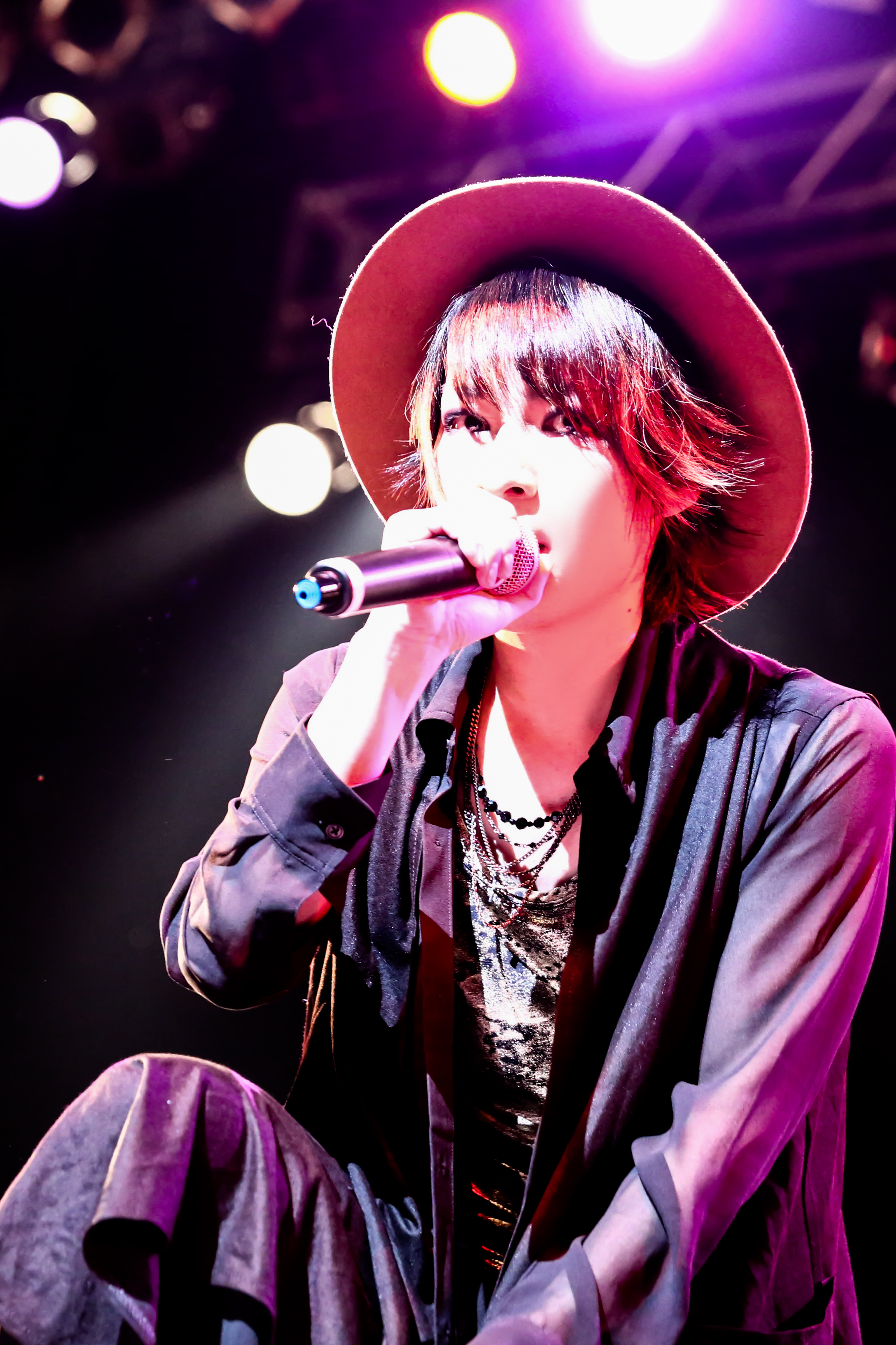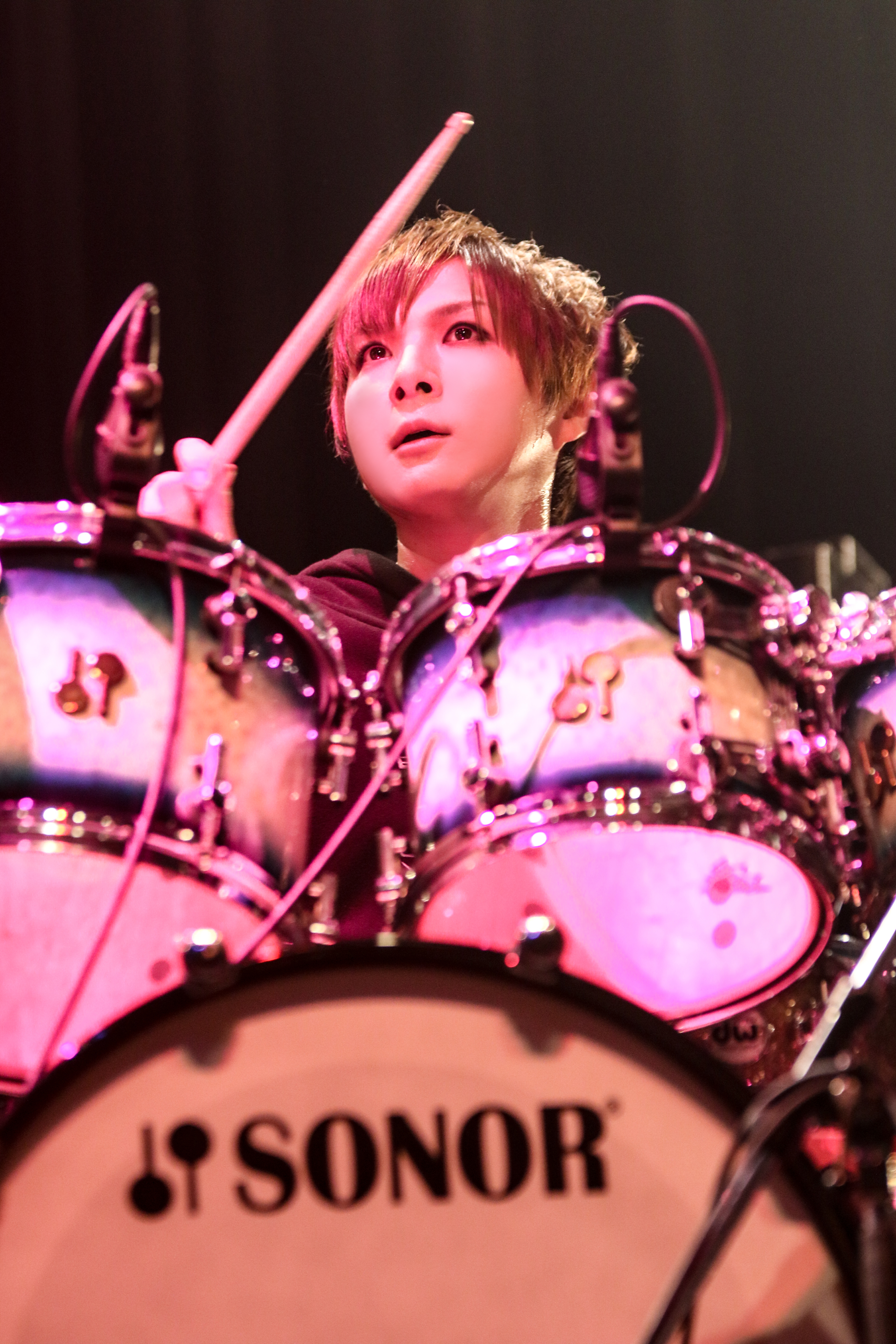 天高く突き上がる無数の拳。AOIは、指先に結んだ赤い糸を垂らしながら『赫い盲目』を歌いだした。AOIを先導者に、意識を妖しく魅了する音を通し、第1期MASKは満員の観客たちを激しさと甘美が交錯する宴の中へ連れ出した。その赤い糸の先を繋ぐように、誰もが心の手を舞台へと伸ばしていた。SANAの猛り狂うギターの演奏を合図に、楽曲は狂気を秘めた美しさと浪漫を携えた『ためらい自殺信号』へ。短いブロックごとに第1期MASKは、自身が持っている黒い狂気の美学を、いろんな視点から描き出していった。