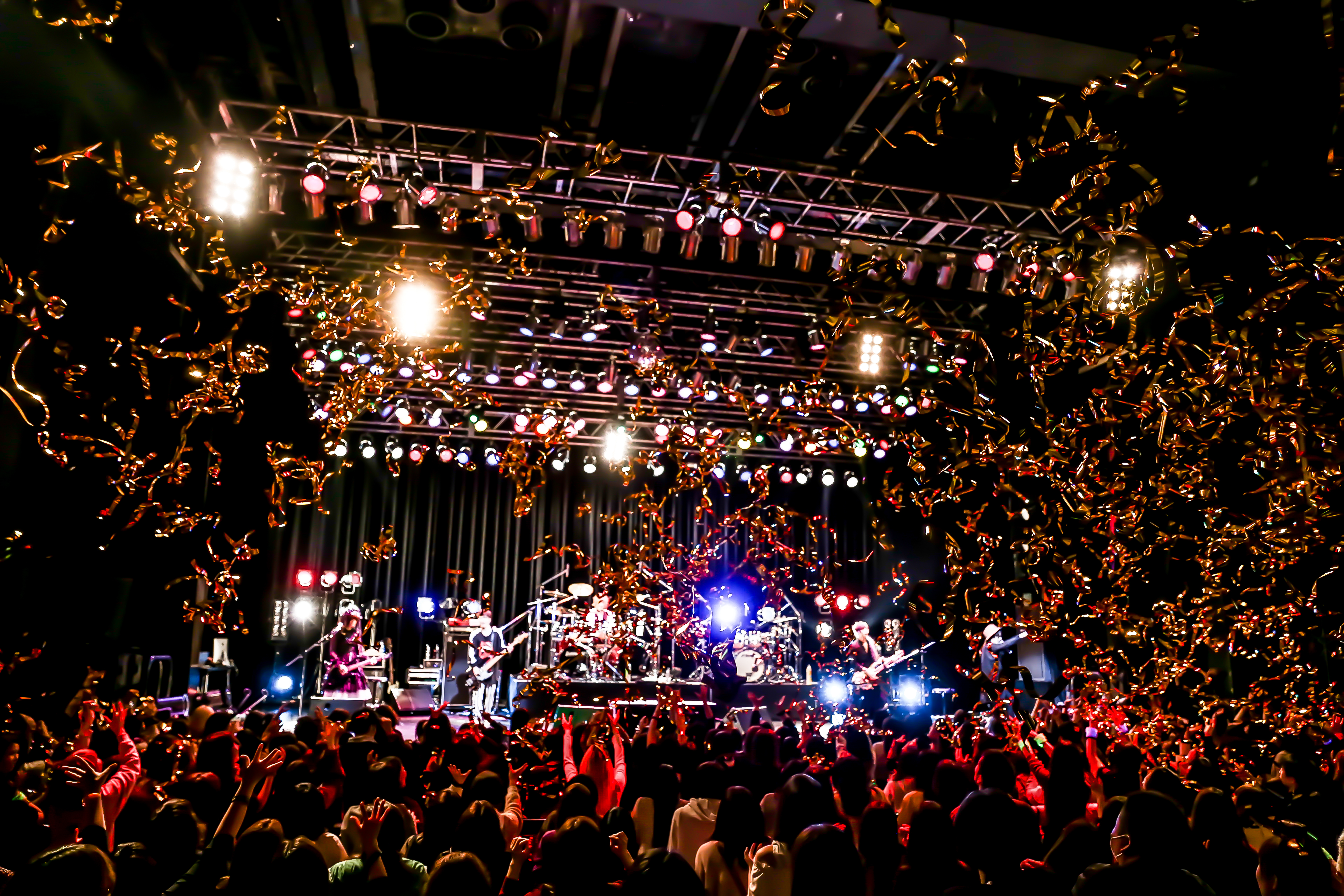 演奏終わりに、メンバーから嬉しいサプライズが。2日後に誕生日を迎えるMICHIRUのため、JINが、会場中の人たちが「HAPPY BIRTHDAY」を歌いだした。その歌に合わせAOIとNANAが花束を持って登場。そのサプライズに、MICHIRUの頬からは温かい涙が流れていた。