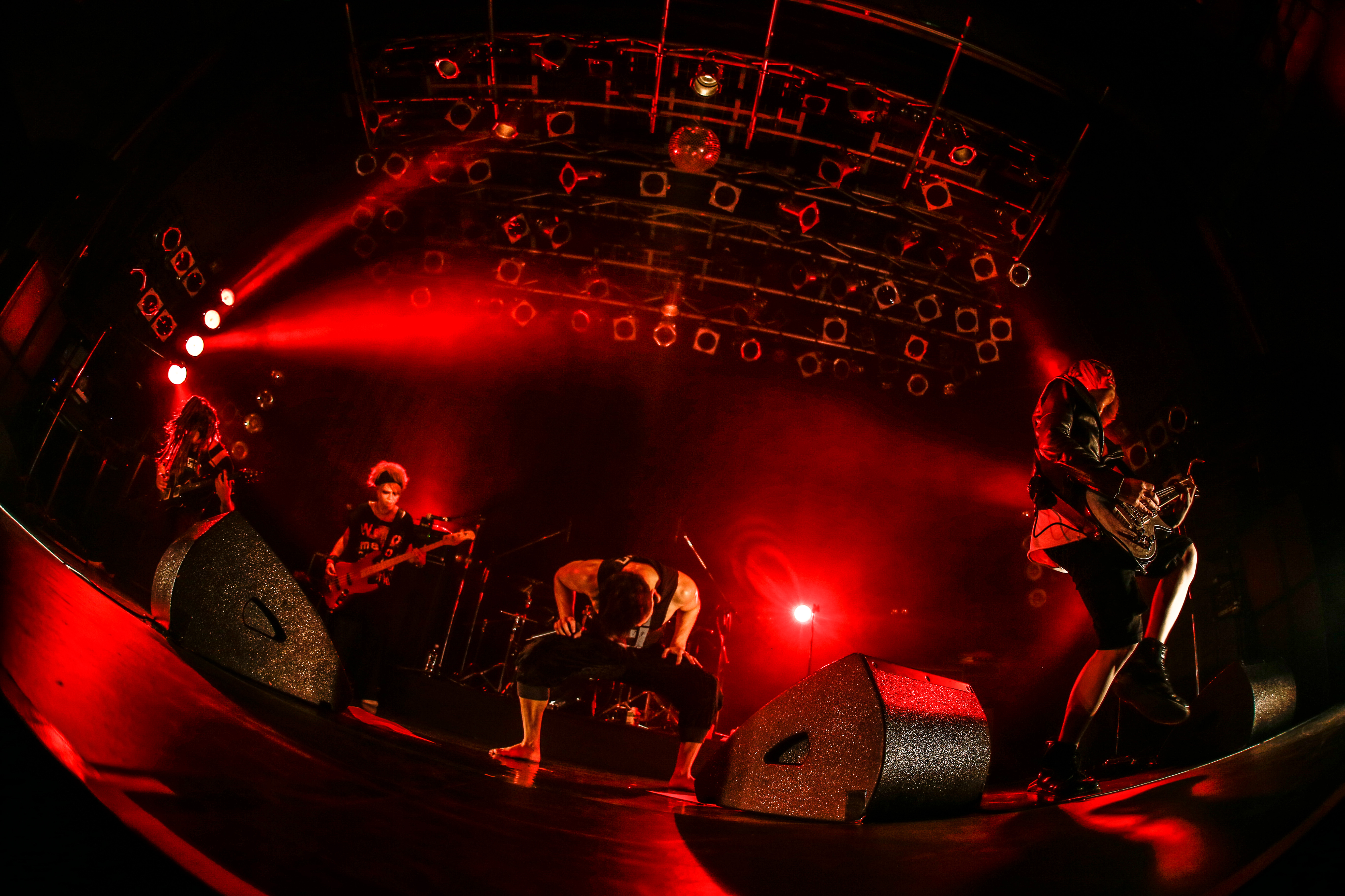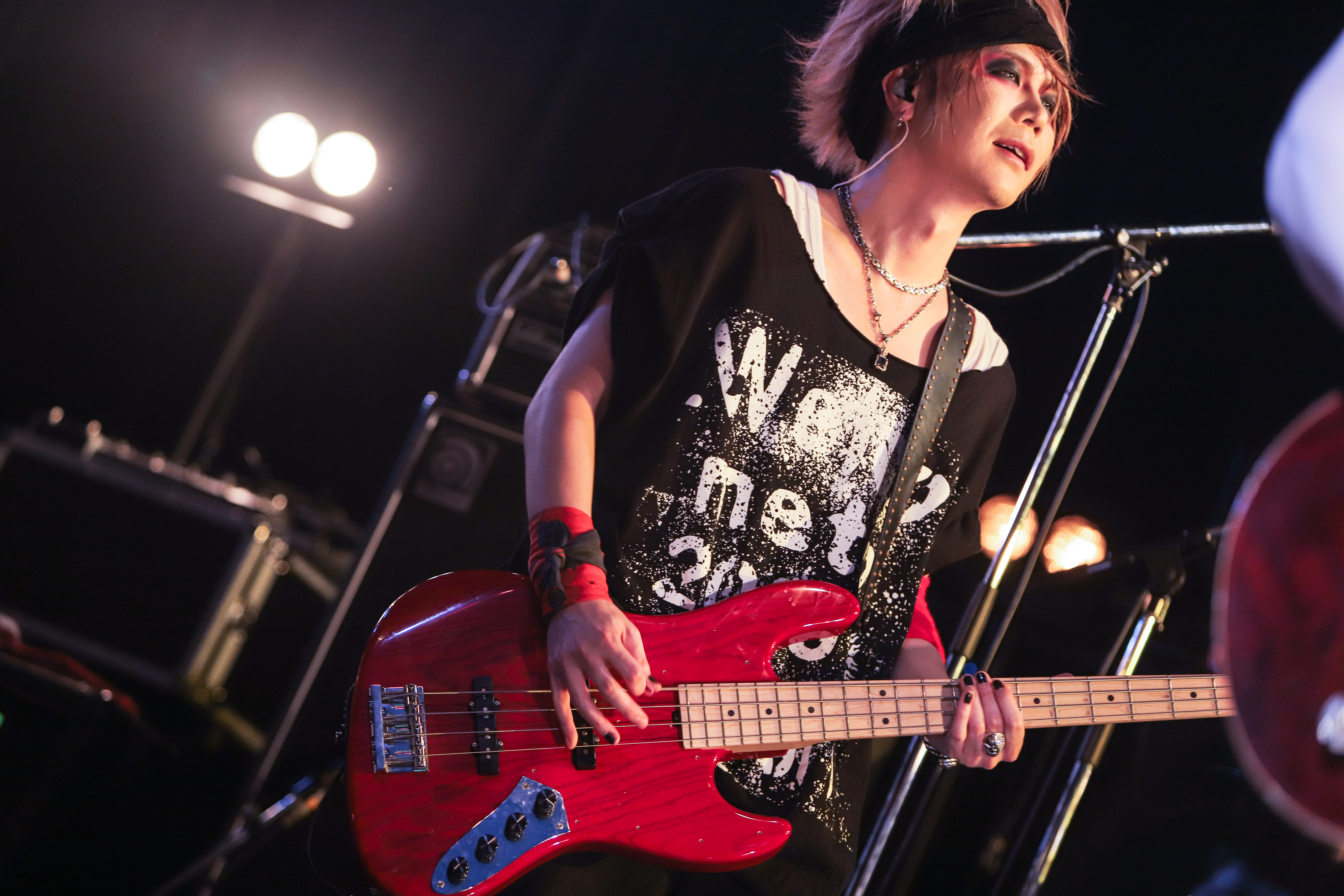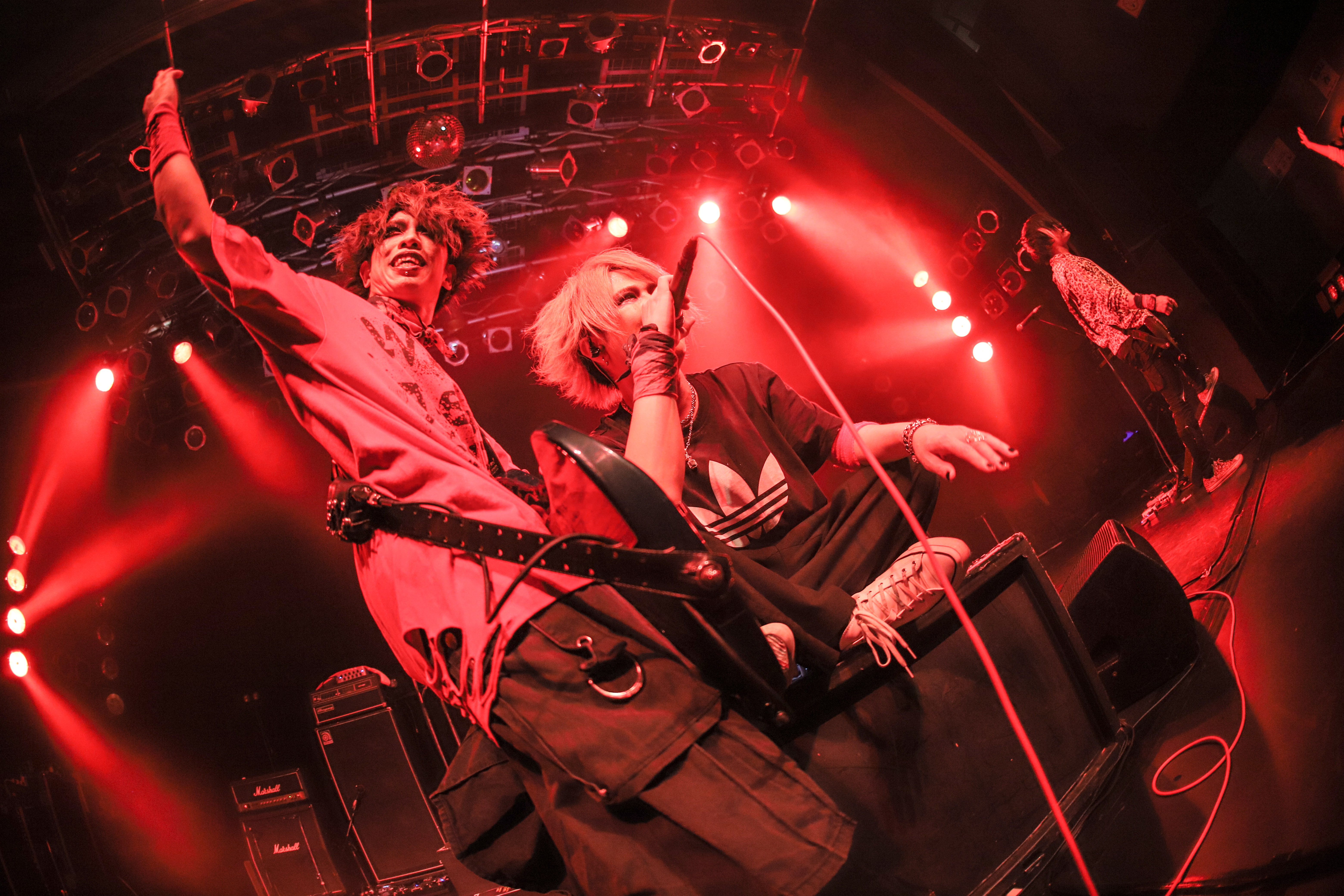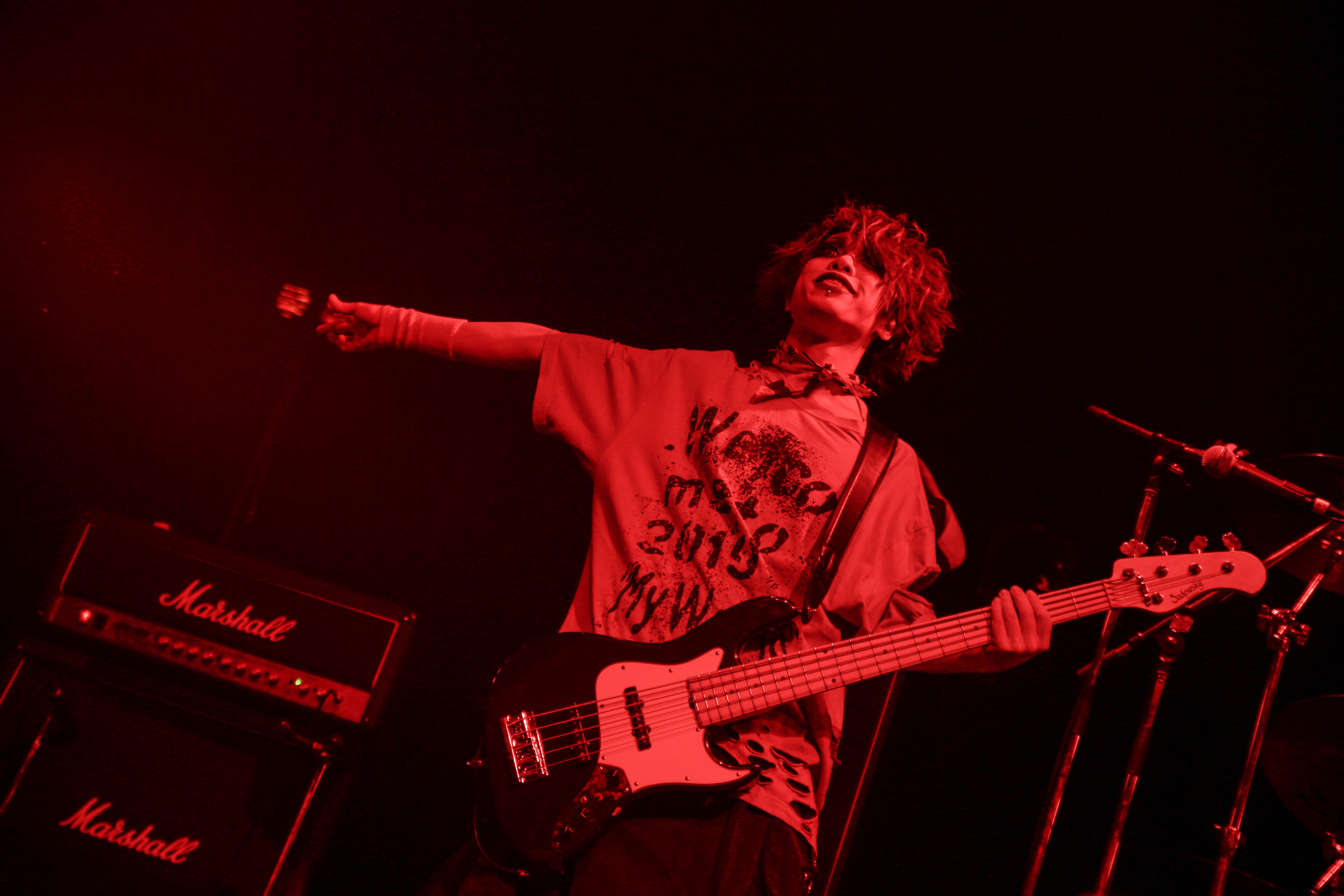 続く『シミ』では、重厚なラウドロックと疾走するハードコアな要素をミックス。祐弥の歌声の微妙さも、むしろ、彼らしい味となって見えていた。もちろん演奏はこのメンツだもの、壮絶な迫力で押し迫れば、観客たちも無邪気に暴れながら4人のセッションを楽しんでいた。フロント陣が暴れる中、一人Kだけが、意外と冷静にベースを弾いていたこともお伝えしておこう。