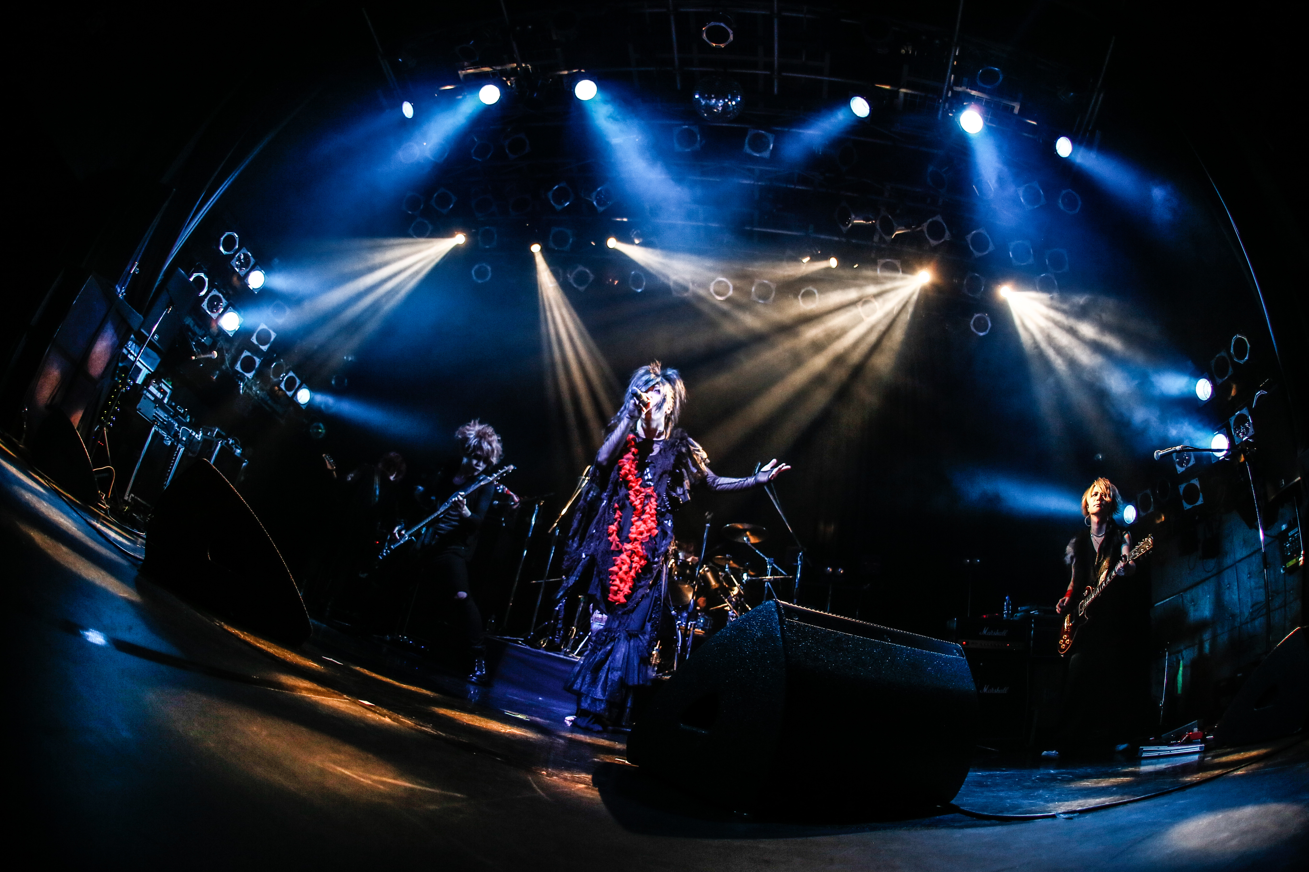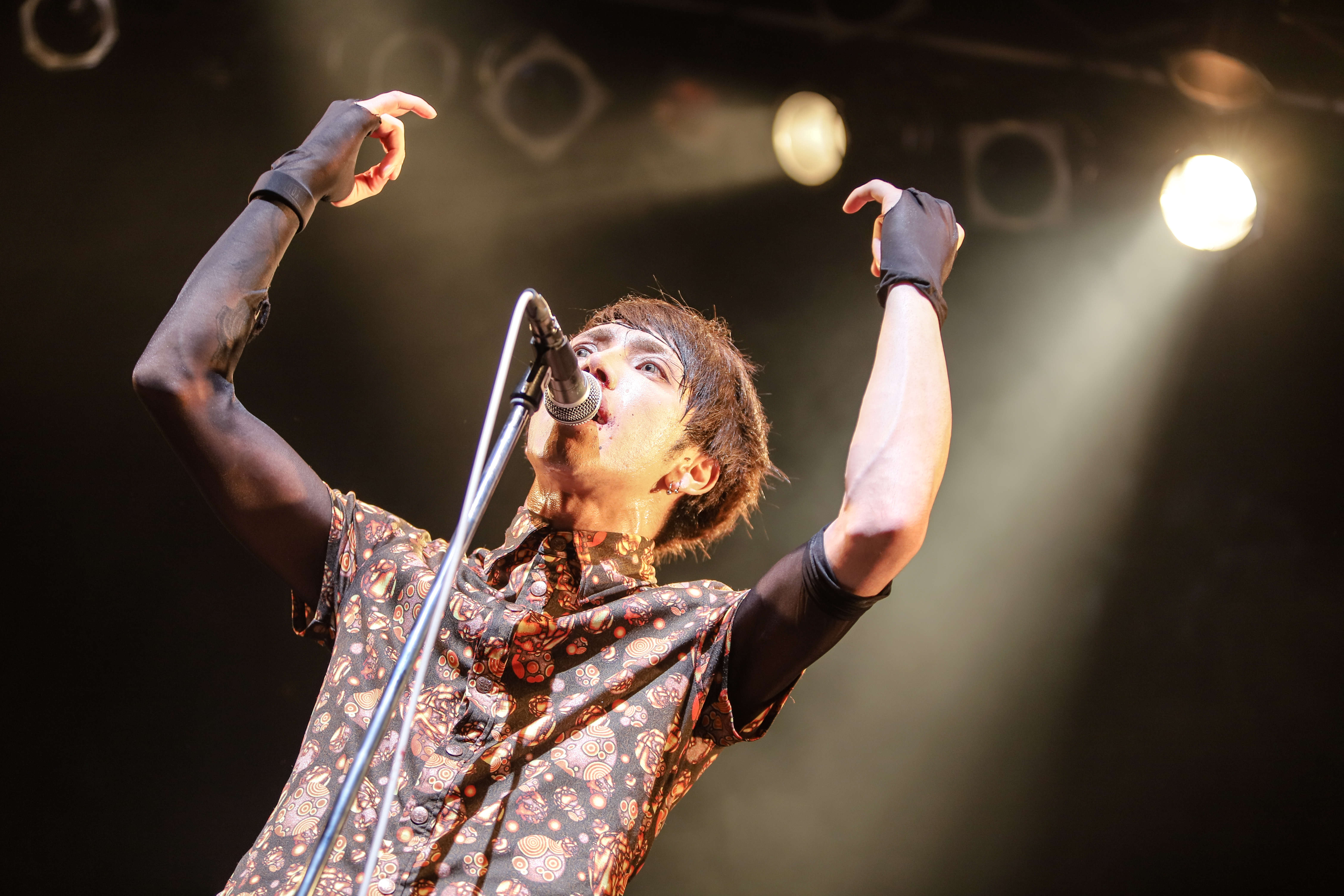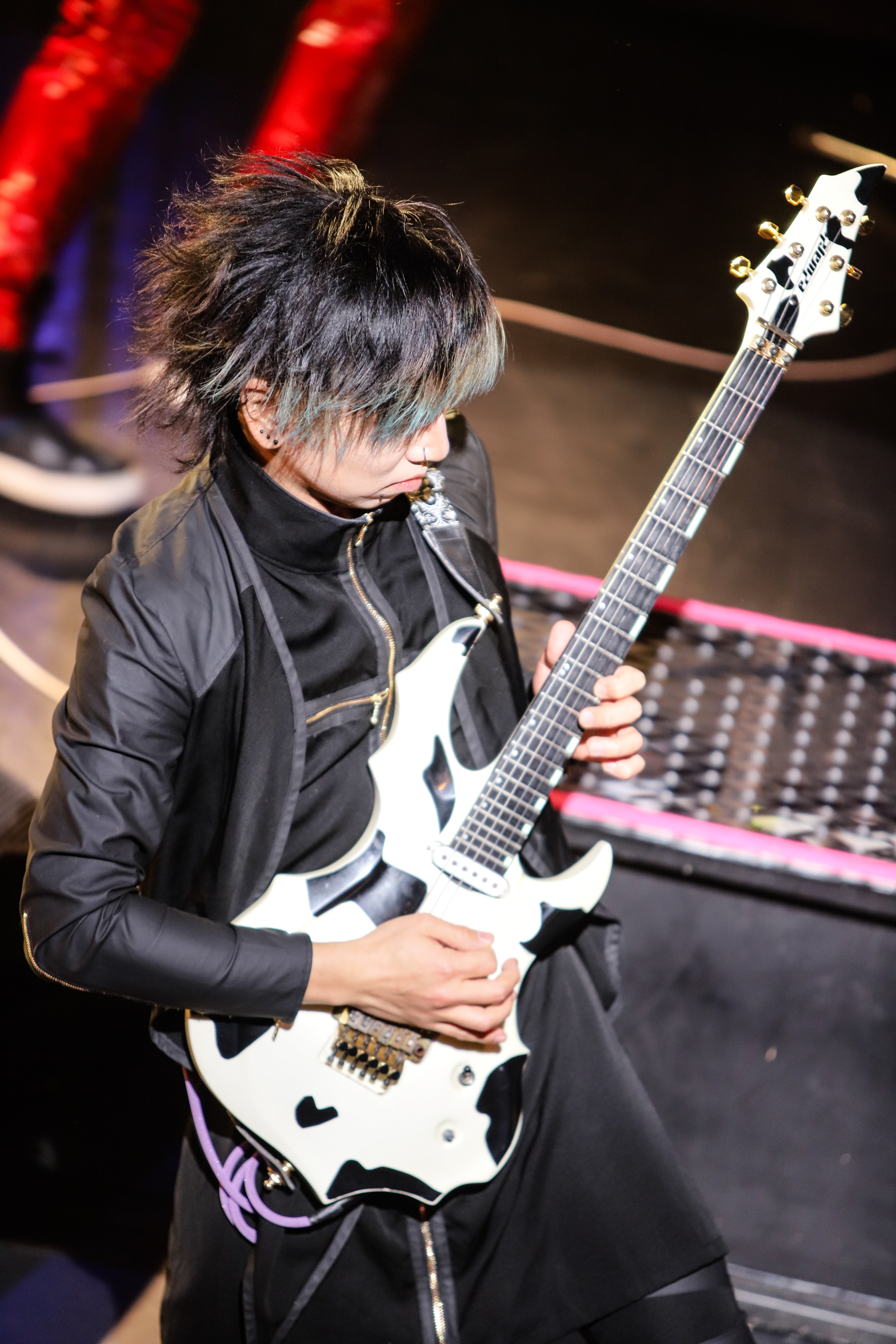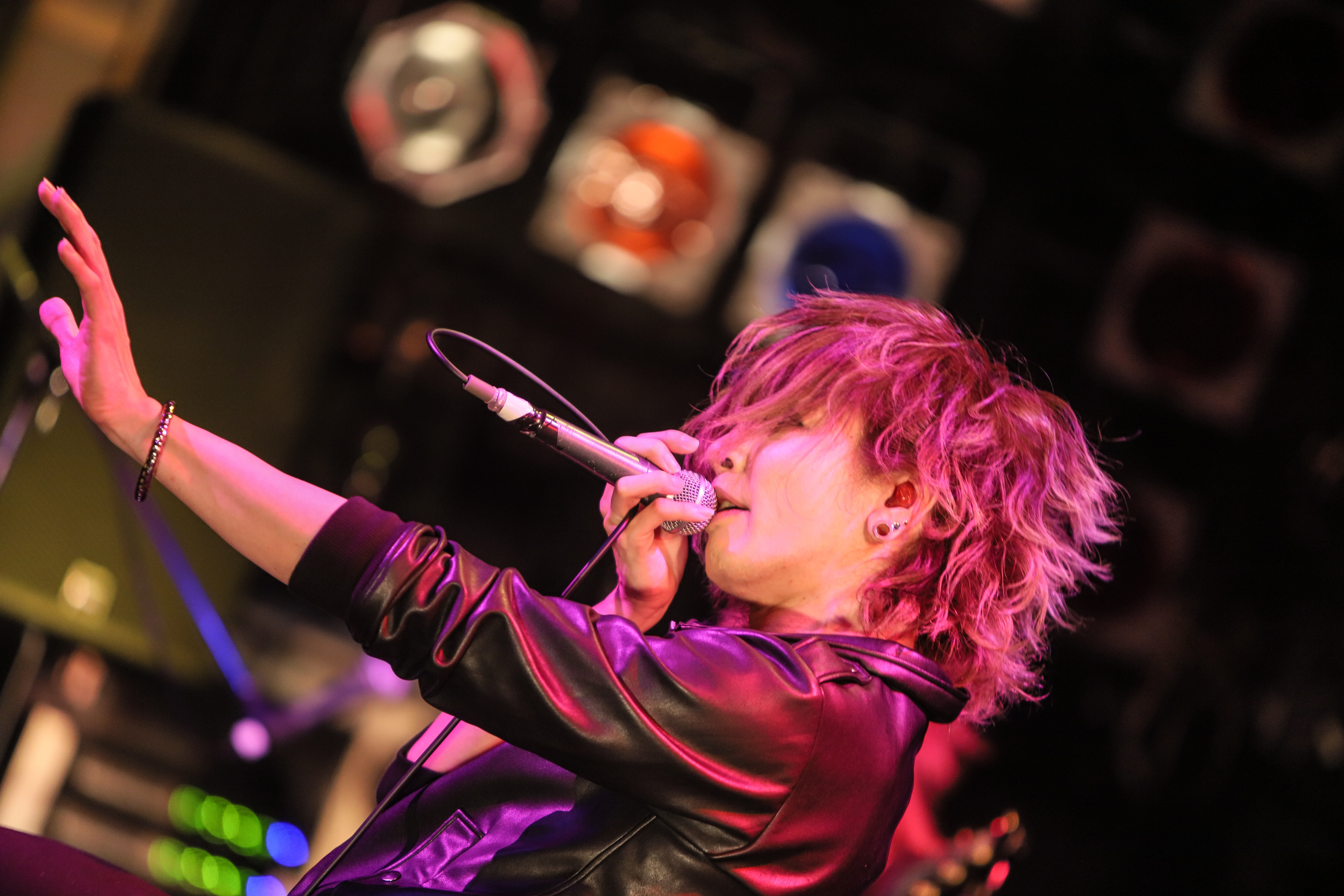 そんな姿も、Kがギターを置いてマイクを手にしたとたんに豹変。『雀羅』の演奏に合わせ身体を激しく折り畳めば、お立ち台に足を乗せ、今にも観客たちへ挑みかからんばかりの姿勢でフロア中の人たちを挑発。演奏陣のデスボイスも背に、Kは毒々しい笑い声も混じえ、激動した演奏の上でけしかけるように歌を突きつけていった。この姿こそ、じつはヴォーカリストKとしての本質?!