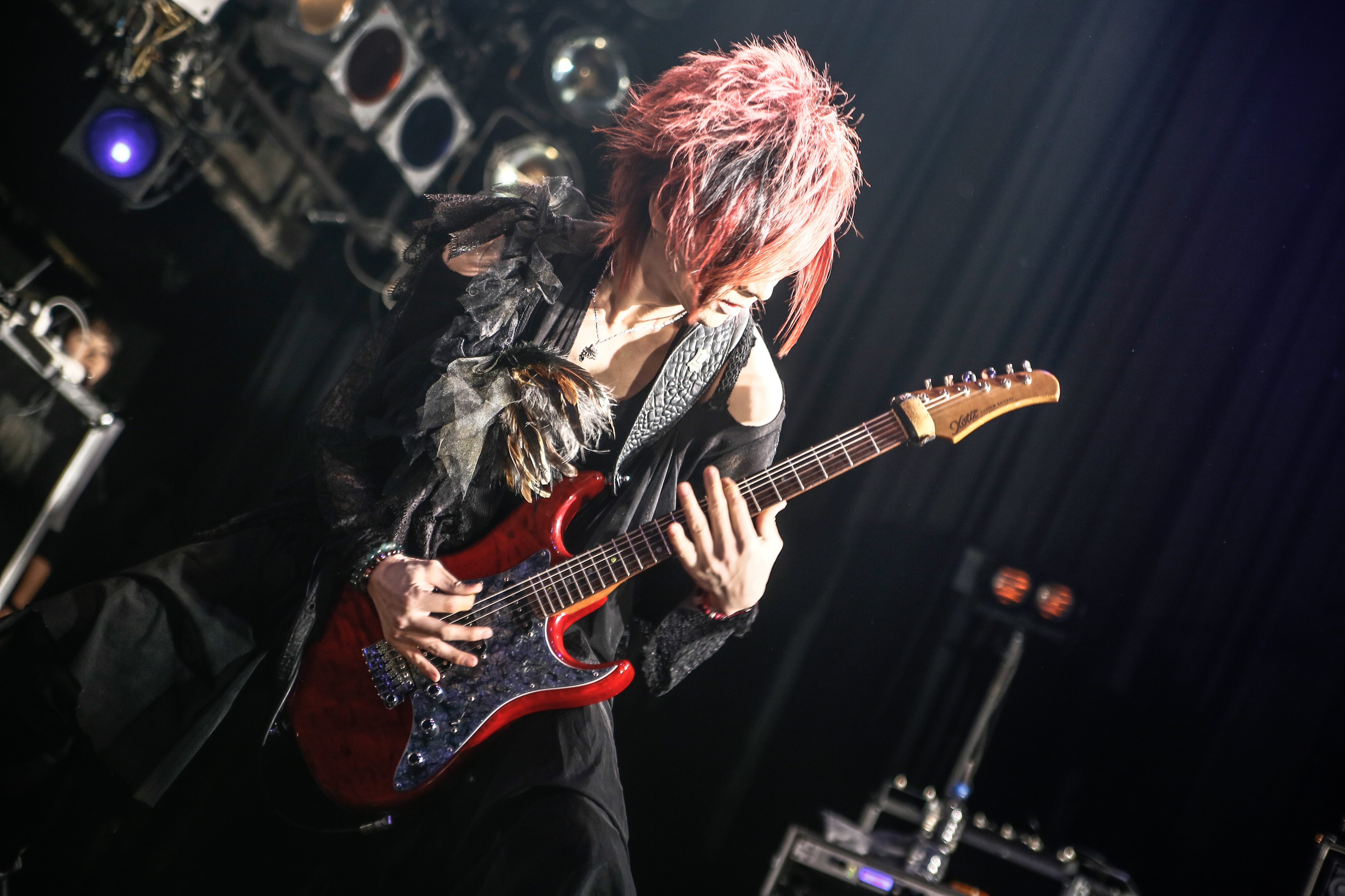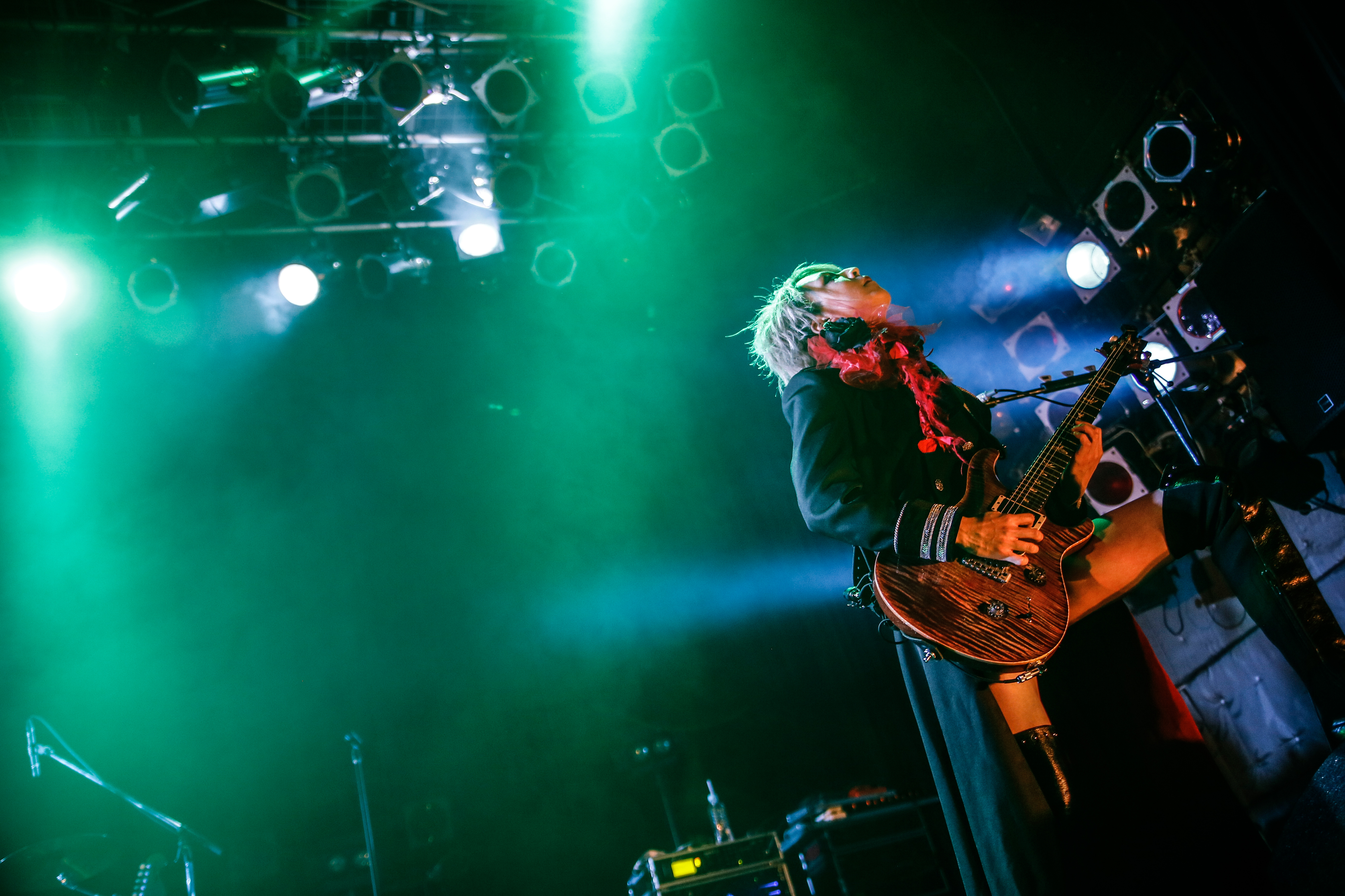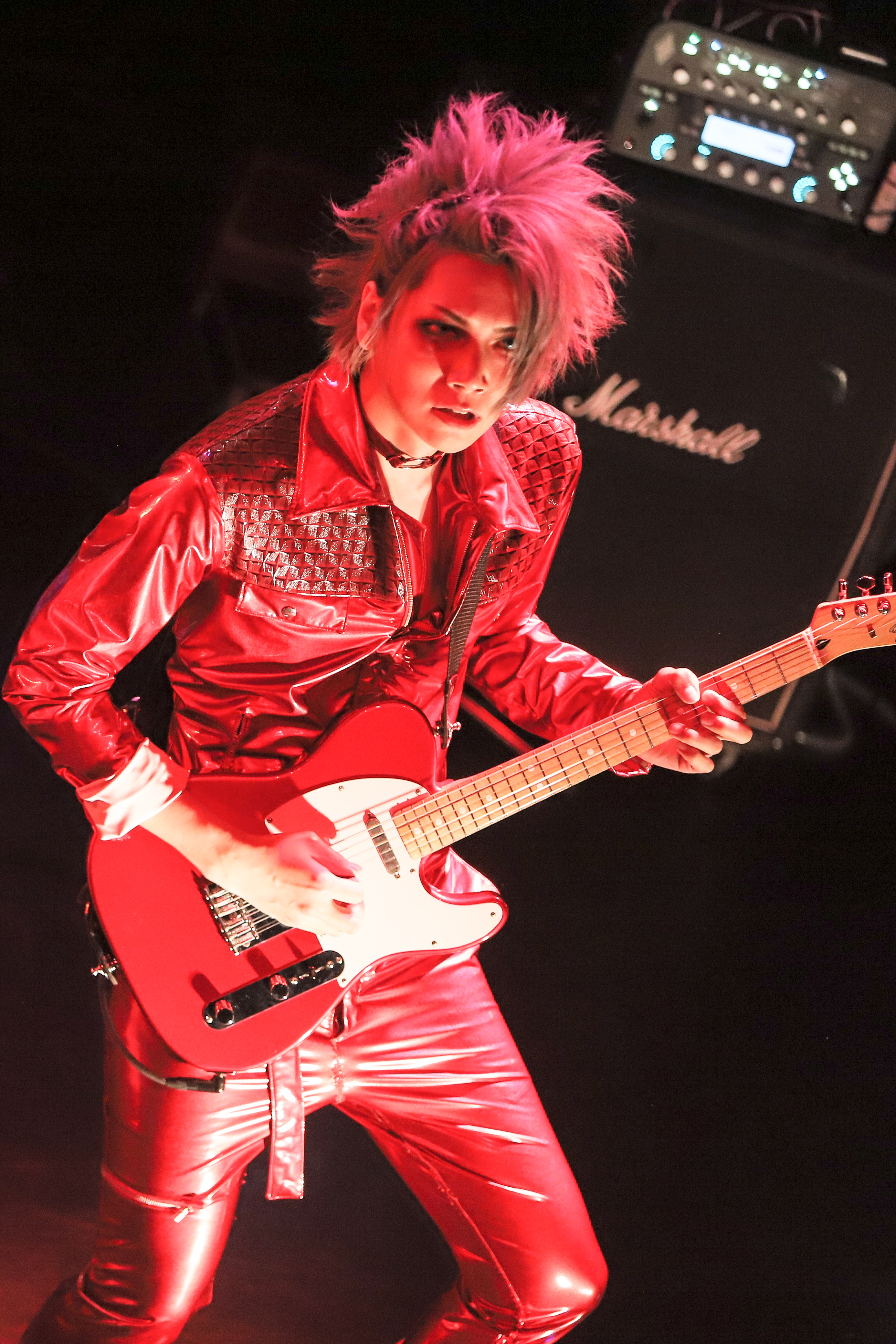 そんな姿も、Kがギターを置いてマイクを手にしたとたんに豹変。『雀羅』の演奏に合わせ身体を激しく折り畳めば、お立ち台に足を乗せ、今にも観客たちへ挑みかからんばかりの姿勢でフロア中の人たちを挑発。演奏陣のデスボイスも背に、Kは毒々しい笑い声も混じえ、激動した演奏の上でけしかけるように歌を突きつけていった。この姿こそ、じつはヴォーカリストKとしての本質?!