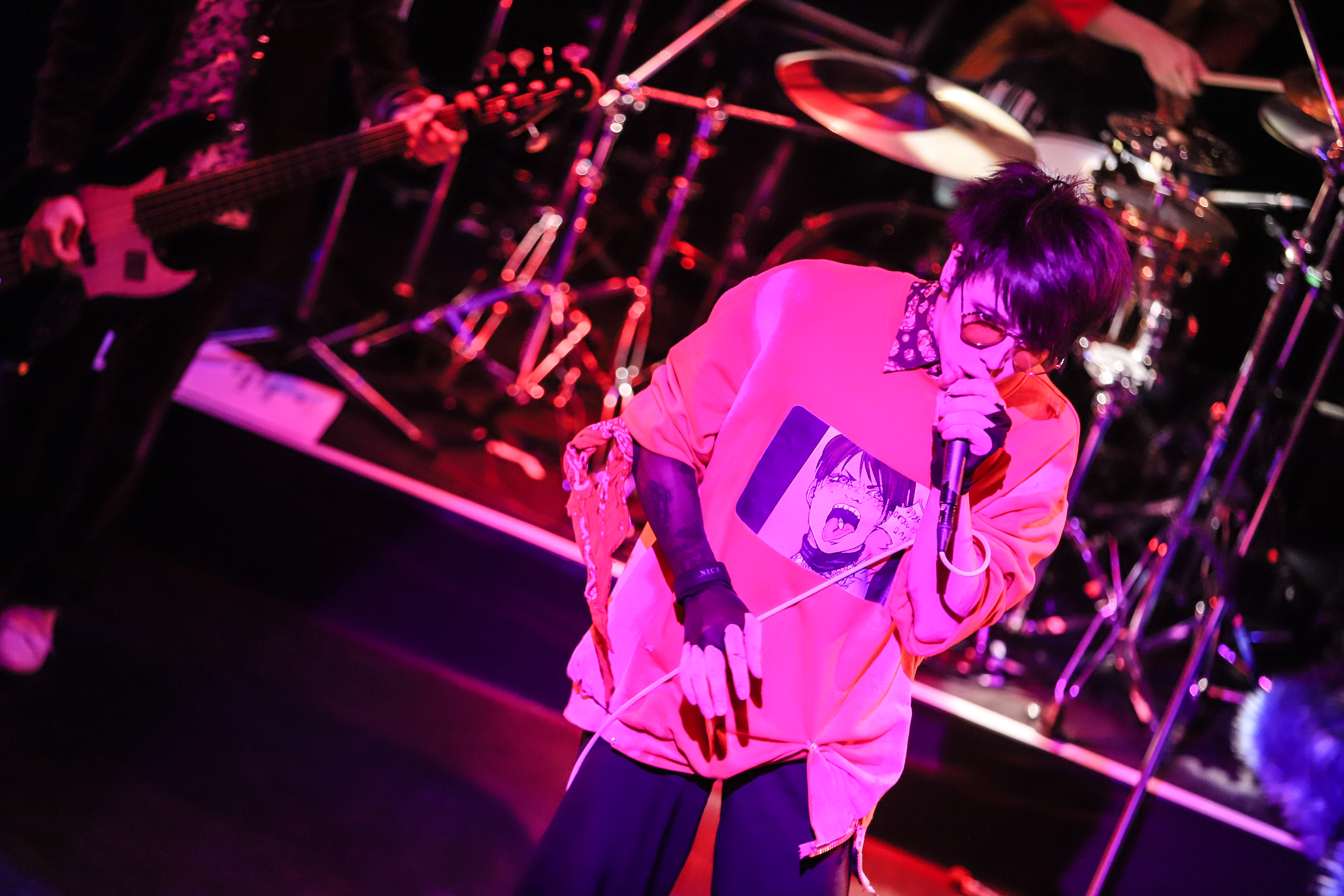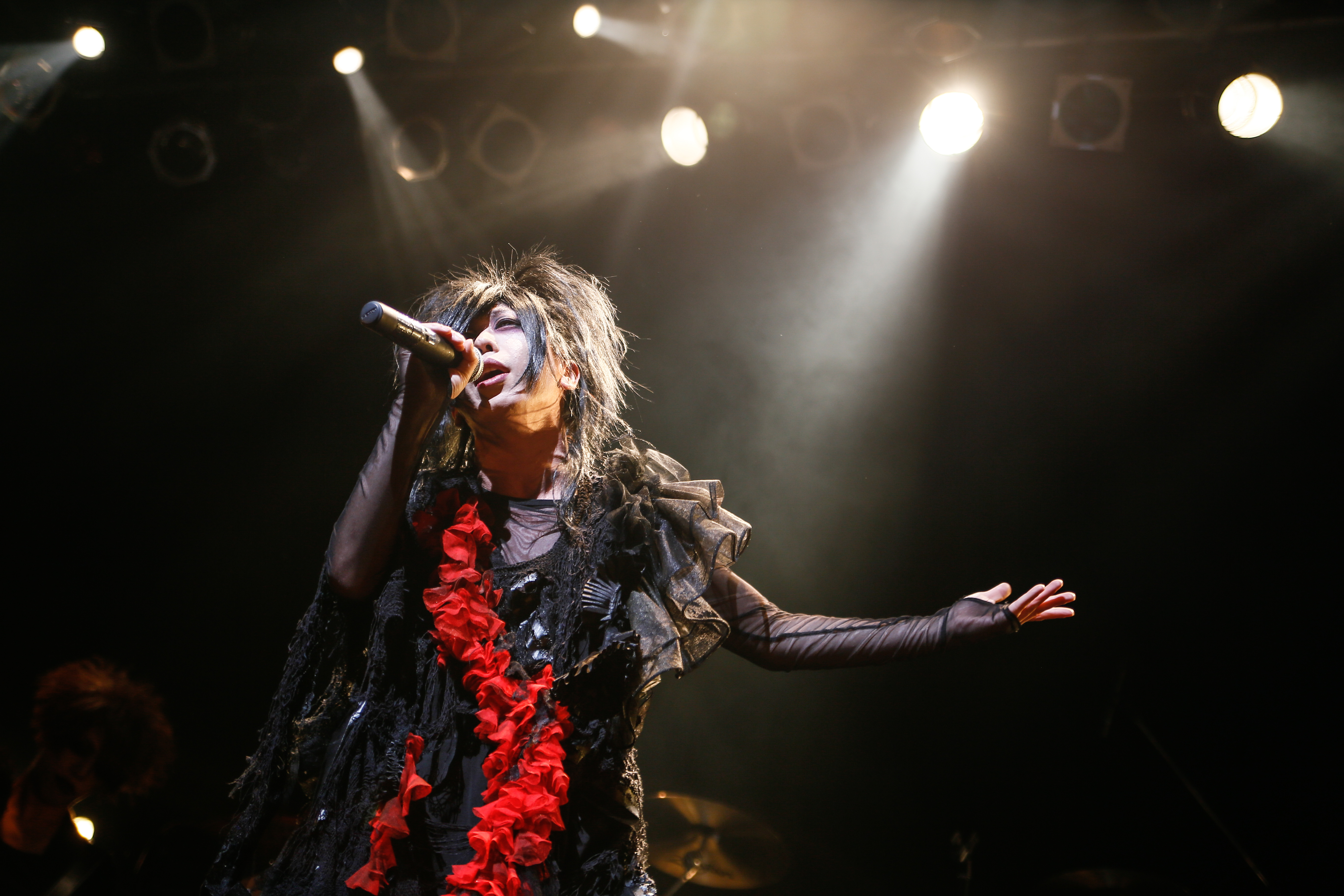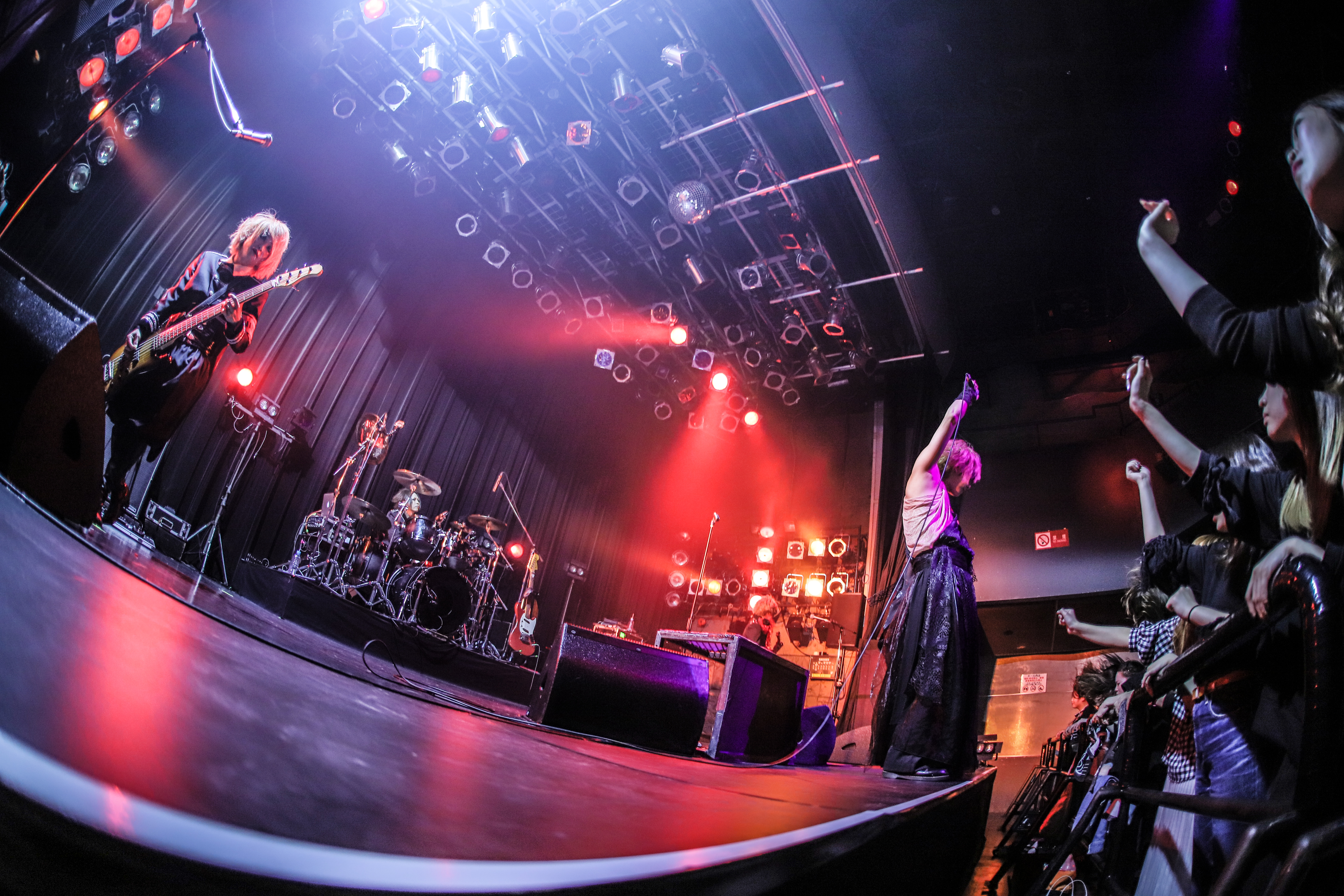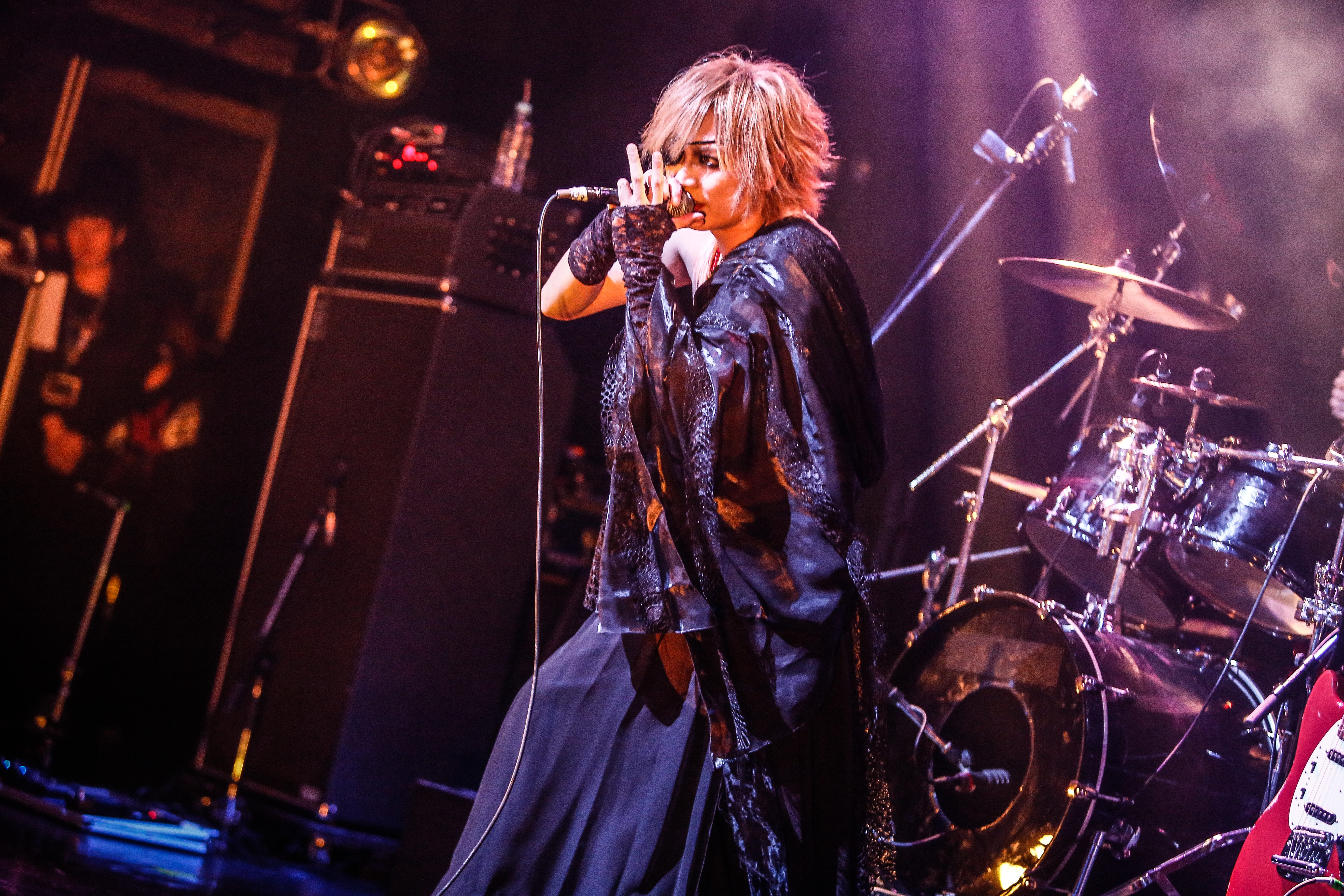 そんな姿も、Kがギターを置いてマイクを手にしたとたんに豹変。『雀羅』の演奏に合わせ身体を激しく折り畳めば、お立ち台に足を乗せ、今にも観客たちへ挑みかからんばかりの姿勢でフロア中の人たちを挑発。演奏陣のデスボイスも背に、Kは毒々しい笑い声も混じえ、激動した演奏の上でけしかけるように歌を突きつけていった。この姿こそ、じつはヴォーカリストKとしての本質?!