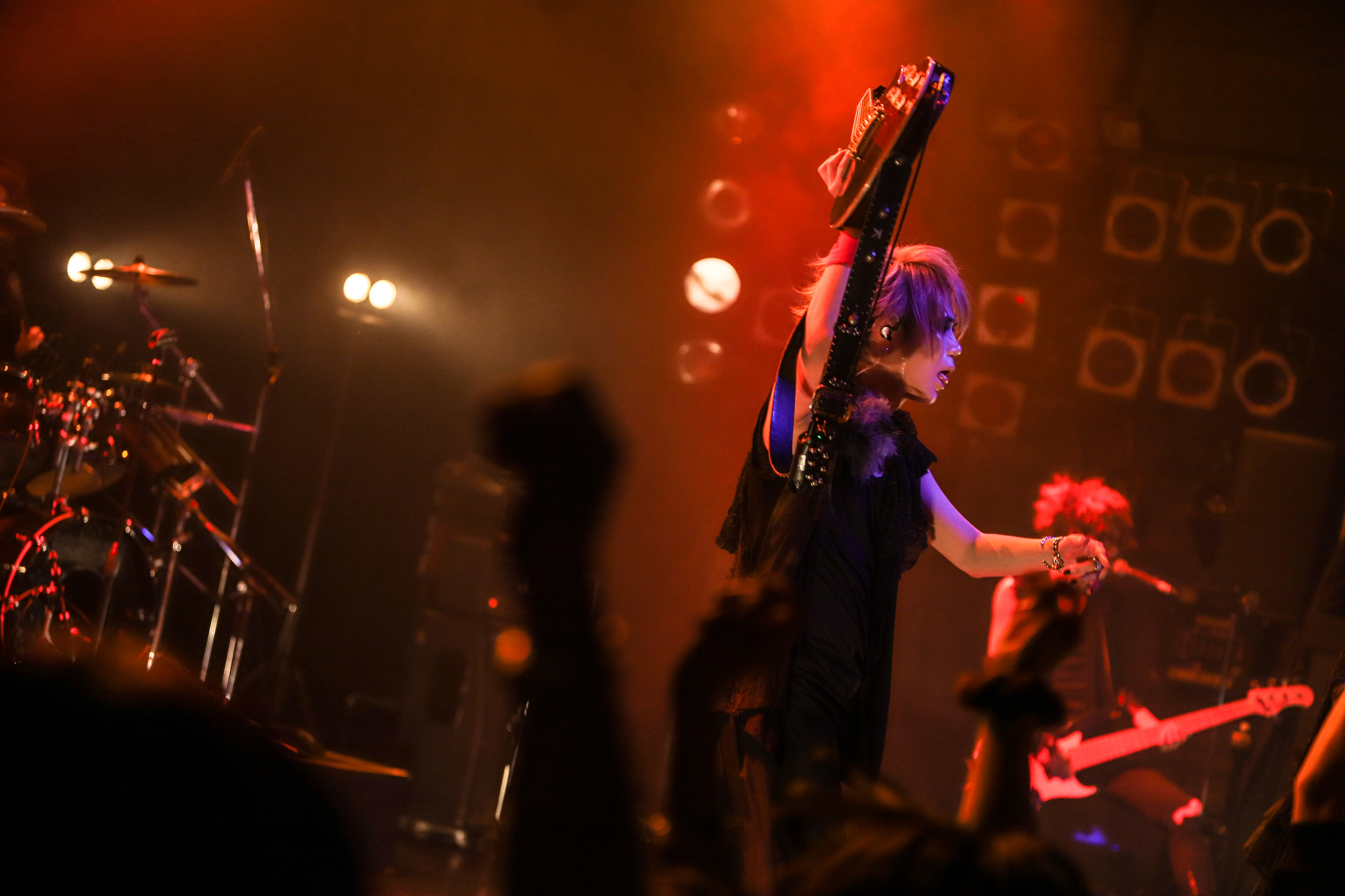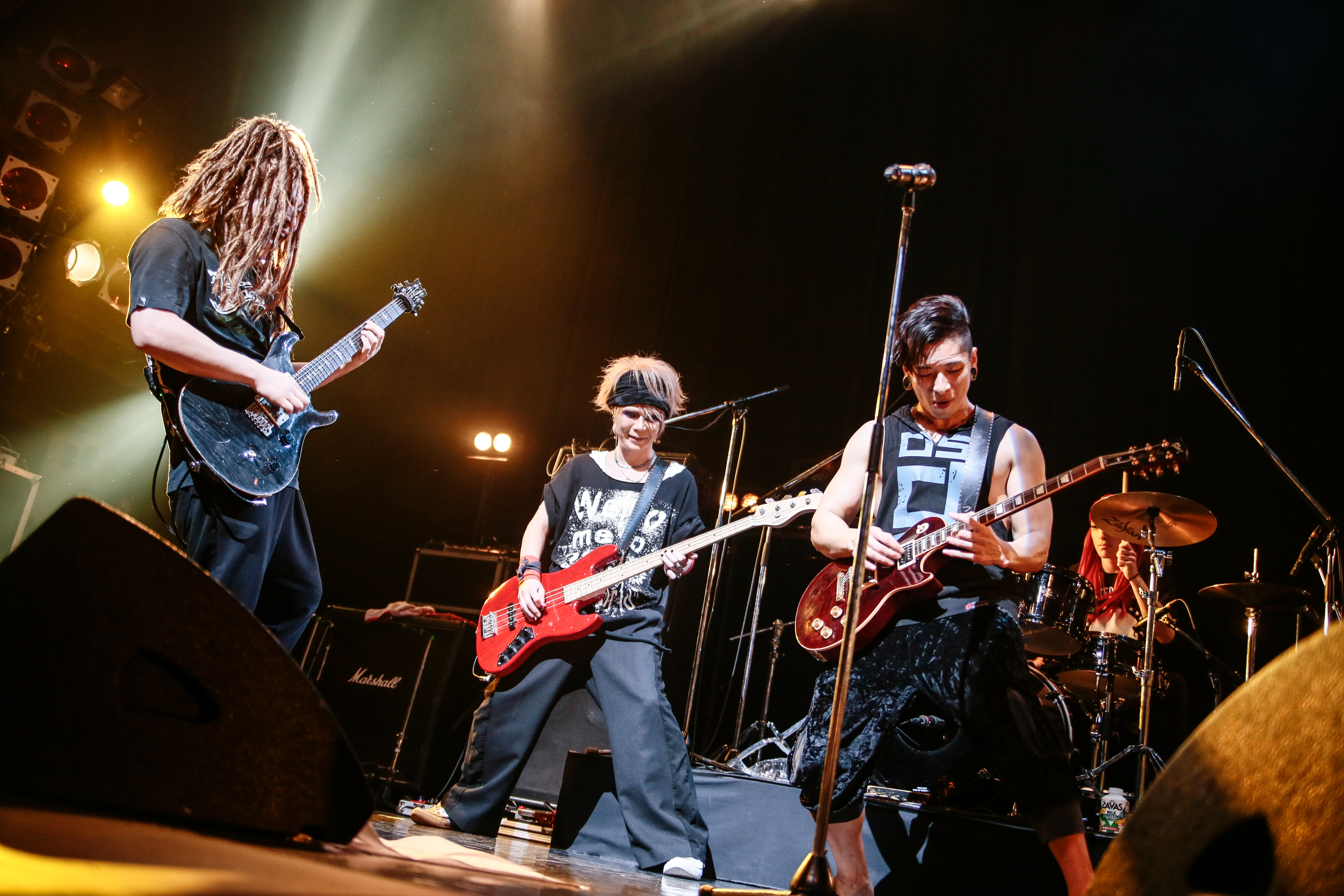 トリ前を飾ったのが、REIGN。これまでに会場へ作りあげていたのとは明らかに異なる、スリリングでラウド、ダークでエスノサイコティックな世界観がこの空間を支配し出した。REIGNは『ゆらり』を奏で、奇しくも魅惑的な物語の中へ、瞬時に観客たちを導いてゆく。唸りを上げるTANOのギター。龍史のベースと和春のドラムが生み出すタイトなビートの上で、郁磨の感情的な歌声が、妖しくも心地好く胸を刺していった。