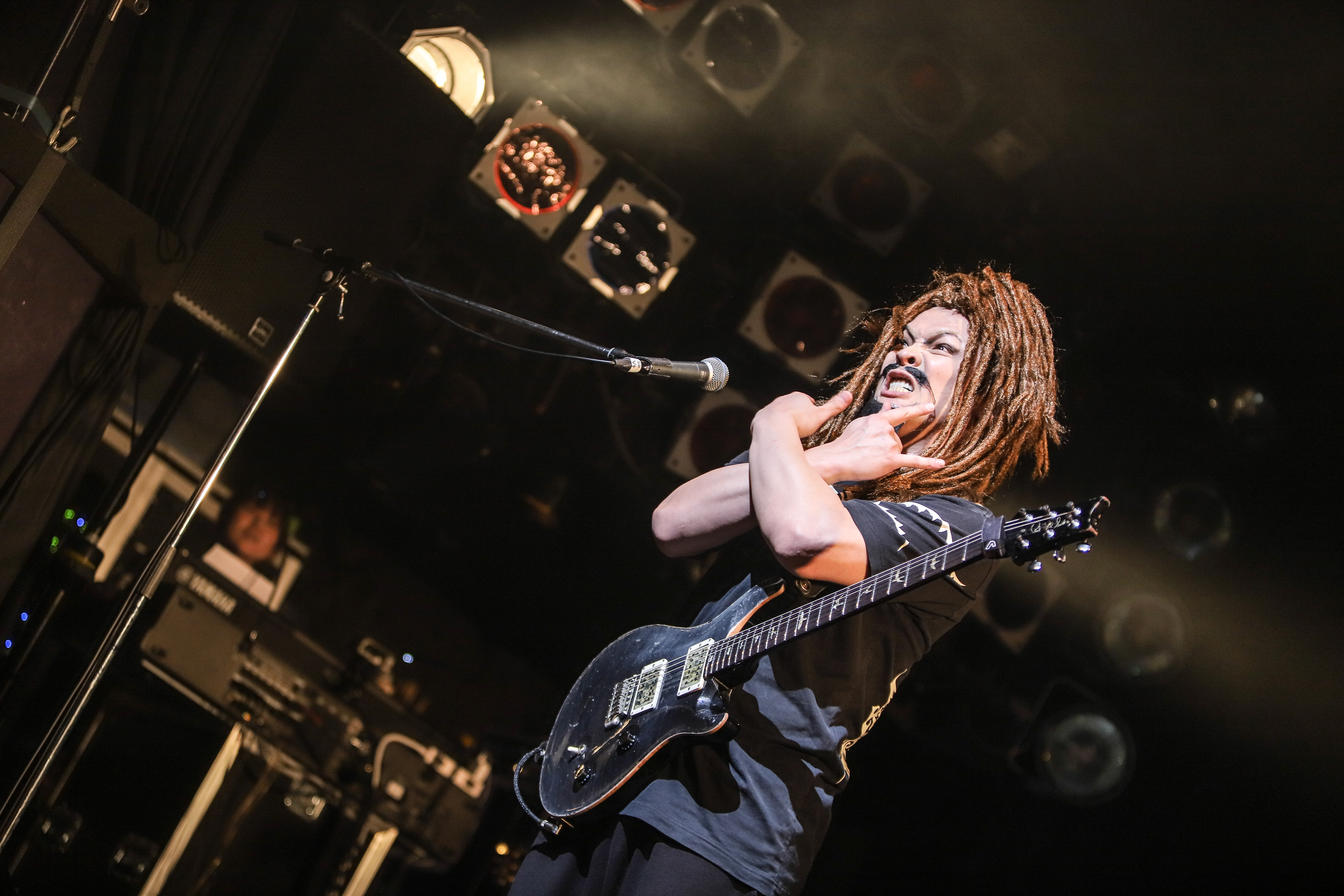 平成マッスルボーイズは、カバー曲を演奏。冒頭を飾ったのが、マキシマムザホルモンの『F』、激しく攻めるハードコアでスクリーモな表情の中へ、ポップでトリッキーな曲調へ転調してゆく様を組み込んだ曲展開も刺激的だ。でも、何が刺激的って、ギターの祐弥がマキシマムザホルモンのマキシマムザ亮君のコスプレ姿で登場していたこともこのバンドの面白さ。