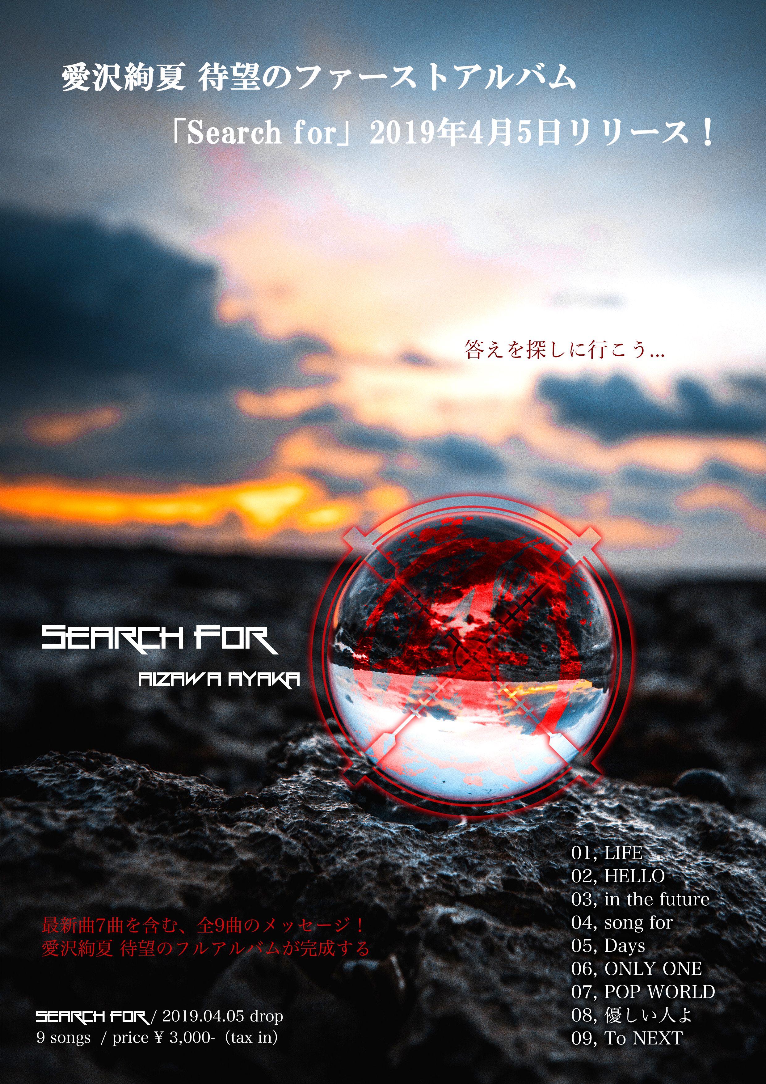 「アルバムのタイトルが『Searh for』。直訳すると「探す」。わたし自身、音楽活動をしながら自分のスタイルを探し続けてきましたし、今も探しています。そんな中、少しですが自分らしさが見定められだした。だったら、その答えをもっと見定めようと作ったのがアルバム『Searh for』でした。最初こそ、自分らしいスタイルを探す制作だったのが、何時しか、自分の音楽に触れることでみんなにも「幼い頃、心に秘めていた純粋な気持ちを思い出すなど、忘れかけていた大切な想いを見つけてもらえたらな」という感情を持って新曲たちを作っている自分がいました。わたしもそうだし、みんなにも心の中に埋もれている大切な想いを、この作品をきっかけに改めて見つけ出して欲しいなと思っています」