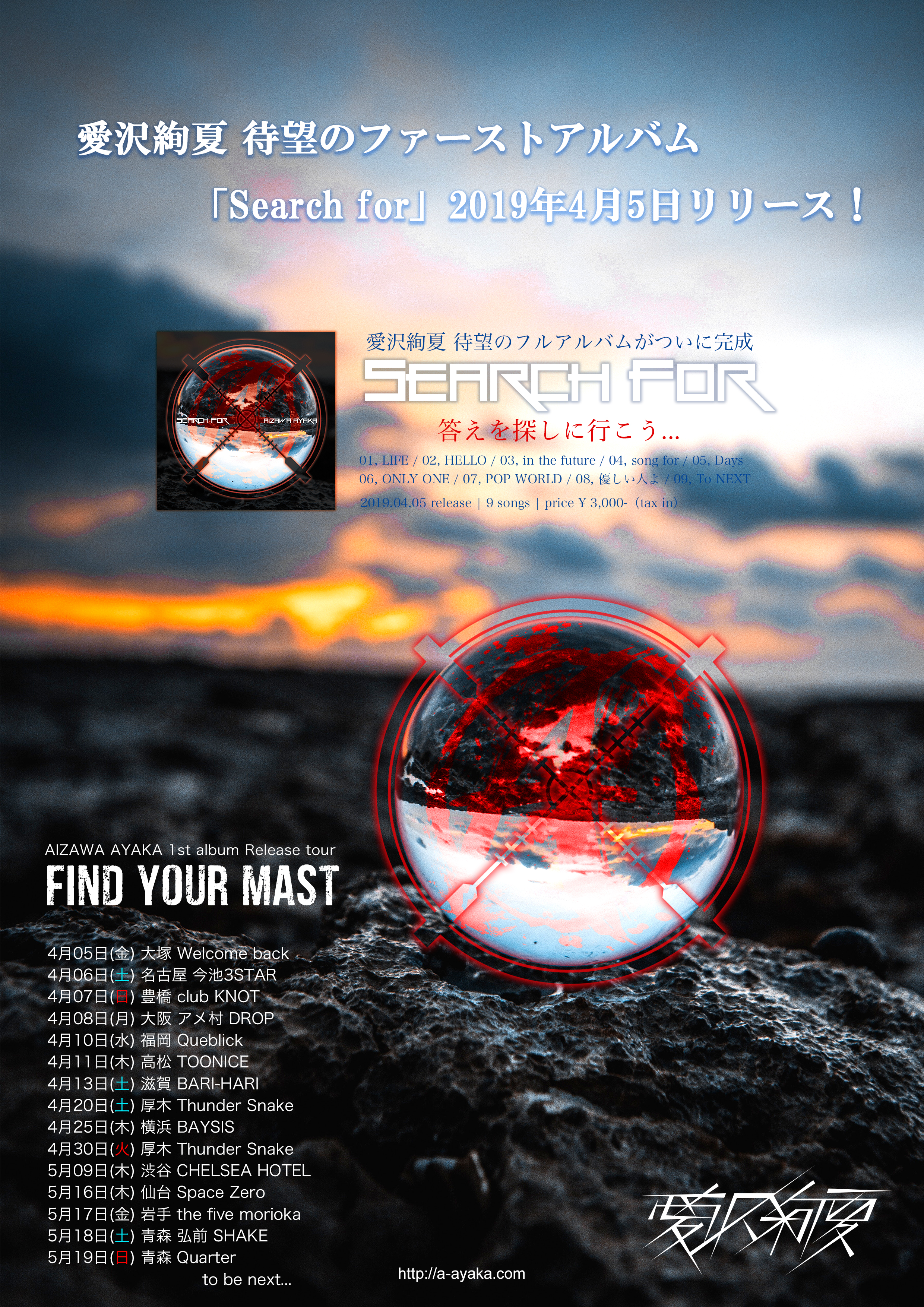 「今回は初めて行く場所も多いように、また、新たな始まりの一歩目を記せる大事なツアーになります。これまでの東名阪仙から、こうやって少しずつですけど行ける場所を増やせたのは嬉しいこと。まして、愛沢絢夏としての全国ツアーは今回が初のように、まだまだ”Searh for”な状態だと思います。1本1本のライブ経験を大切に重ねながら無事ツアーのファイナルを終えたときに、どんな愛沢絢夏となっているのか。そこは、自分でも期待しているところです」。