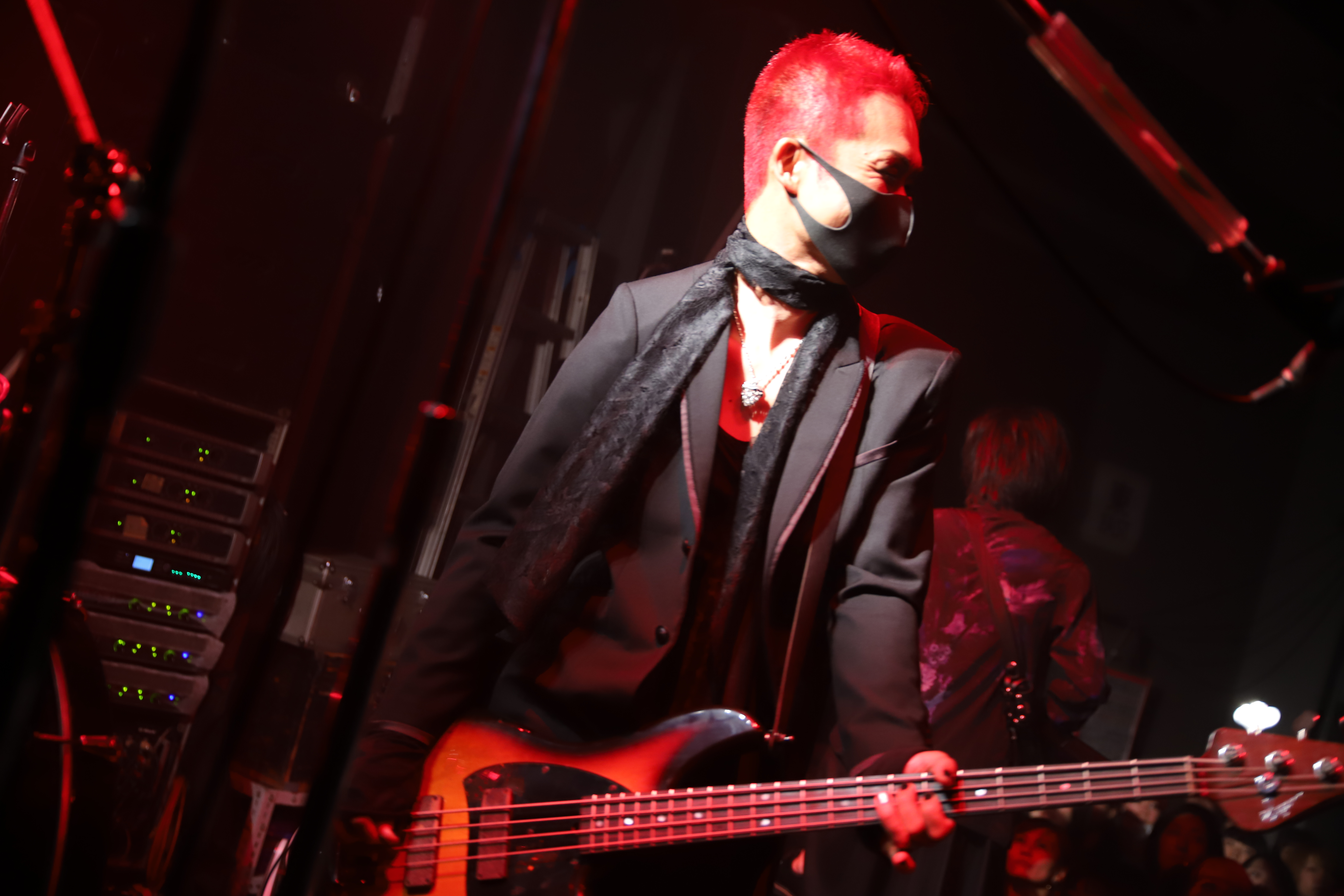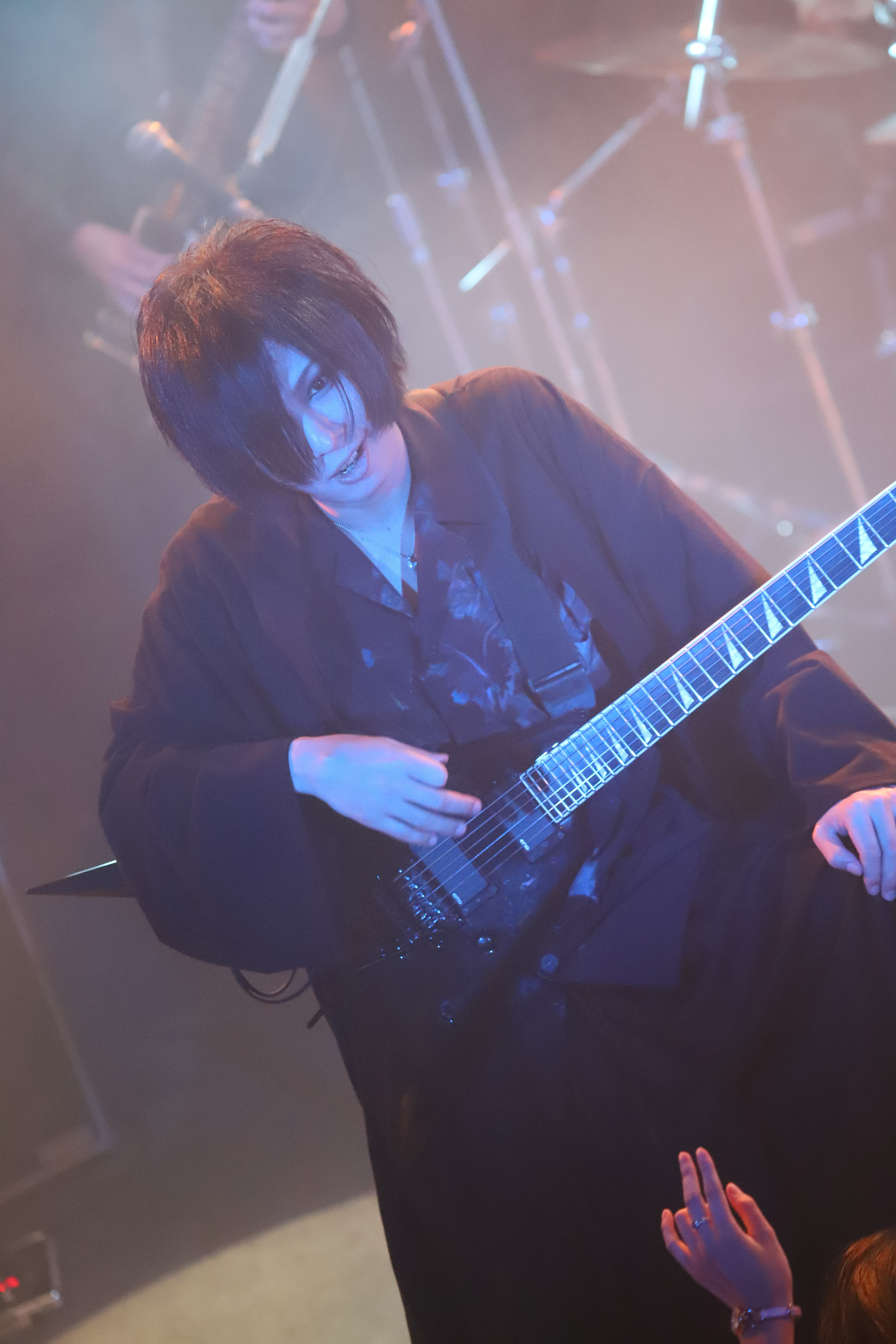 まだまだ始まったばかりのバンドのように持ち歌は限られている。アンコールでは、観客たちがとくにはまりそうな楽曲たちをふたたび演奏。つかみを持ったサビ歌も印象的、頭振り乱し狂乱の様を描きだした『死考回路』。「論破 論破 論破」「廃論破」の掛け合いが早くも生まれた『「廃論破」』と、体感的な熱狂を与える曲たちをセレクト。さらにSAKUは、歌詞を一つ一つ解説しながら乗り方をレクチャー。ファンたちと一緒に振りを作り上げる作業まで行ったうえで、みたび『死考回路』を、立て続けに『遮断』を演奏。「じゃあ、後は『INSANITY NIGHTMARE』をやって終わろうか」と、スタジオで練習するような様も見せながら演奏した『INSANITY NIGHTMARE』。まさか舞台上で、しかも公開ミーティングという形で振りを考えれば、今後もこの曲をライブで披露してゆくかの会議を行うとは。ここの下りだけで数十分費やしたように、アンコールは完全に公開スタジオ練習状態だ。ベルトの穴を2つくらい緩めたその緩さもNICOLASの魅力にしておこうか。