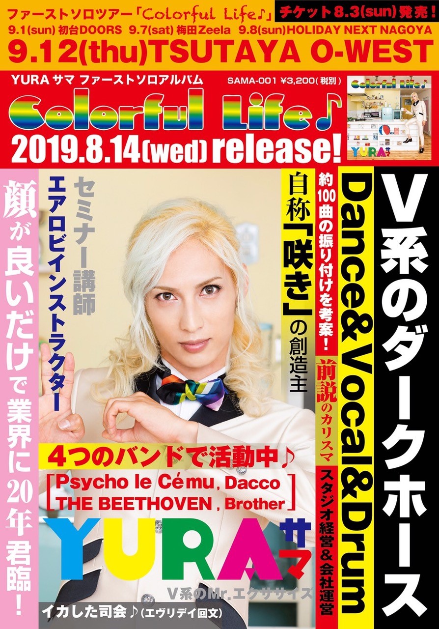 8月14日、YURAサマが40歳の誕生日を前に初のソロアルバム『Colorful Life♪』を発売する。YURAサマいわく、「昔からYURAサマ名義でソロアルバムを出したい」という想いはあったことでした。そのタイミングを見計らっていた中、2019年9月12日に40歳になることから、「今がベストじゃないか」と判断をし、リリースを決めました」とのこと。予定では、20代のうちに「まわりが放っておかずにソロデビュー」を目論んでいたようだが、当時人気沸騰していたPsycho le Cémuが活動休止となり、その夢は一度潰えたことも補足として語っていた。詳しくは、 アルバムの冒頭を飾った『[発信for dear]』を聴いていただきたい。