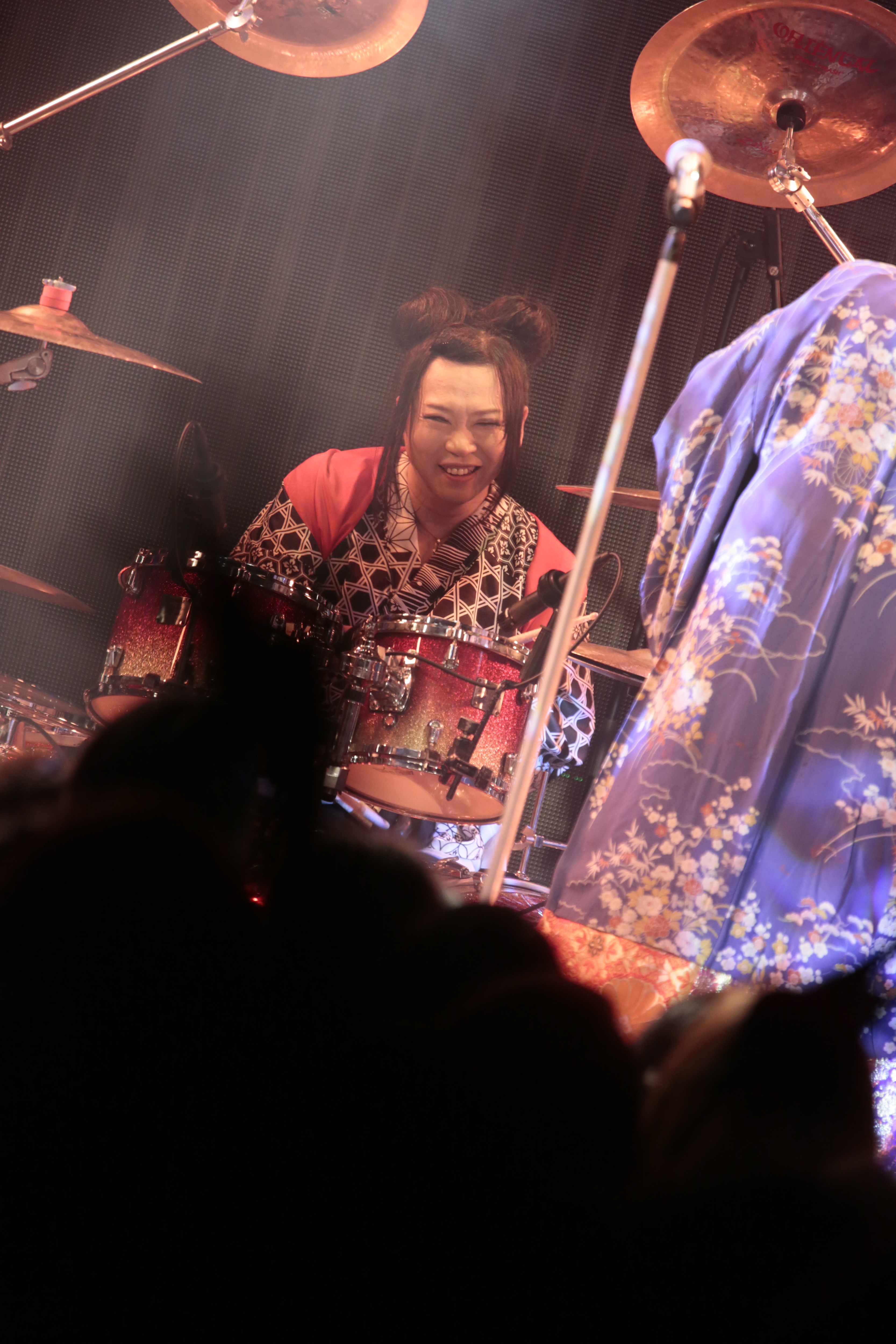 華やかなEDM系の祭りビートに乗せ、メンバーが舞台へ姿を現した。ステージ上の3人とも、祭りの場に相応しい浴衣姿。ライブは、インディーズ時代からステージを彩り続けてきた「Quarter Doll」からスタート。突き刺すようような千聖の激しいギター音に煽られた観客たち。そこへ重なったHAKUEIの「祭りだー!!」の声。ザクザクとした千聖のギターの音が、O-JIROの轟くドラムの音が場内の熱気を掻き回す。ワイルドな演奏の上で、挑むようにHAKUEIが歌声をぶつけてゆく。ド頭からスリリングな演奏が観客たちの荒ぶる気持ちを熱く触発。誰もが天高く拳を突き上げ、舞台上からあふれ出る荒ぶる衝撃をしっかり受け止めていた。