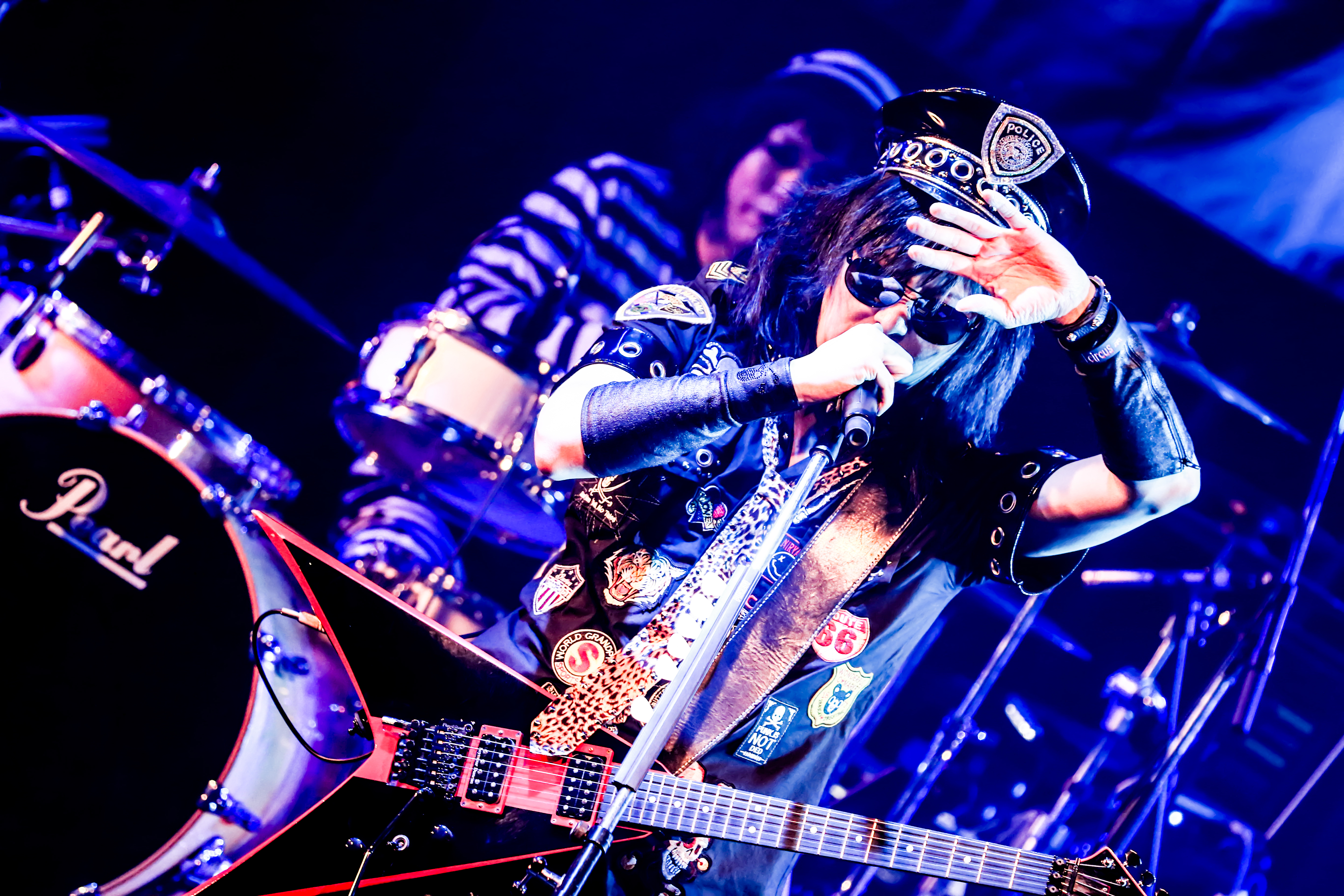囚人服姿のO-JIROのドラムが加わると同時に、楽曲は「Change the World」へギアをシフト。youの掻き鳴らすギターの音色へ後押しされるように、MSTRは心解き放つように歌いだす。とても胸をスカッとさせる、開放的でありながらもスケールあふれる楽曲だ。会場中の人たちも、スタジアムの中で一緒に熱狂してゆく気分を覚えながら、身体中を居抜き続ける熱く攻撃的な演奏と開放的な歌声に満面の笑顔で身を任せていた。