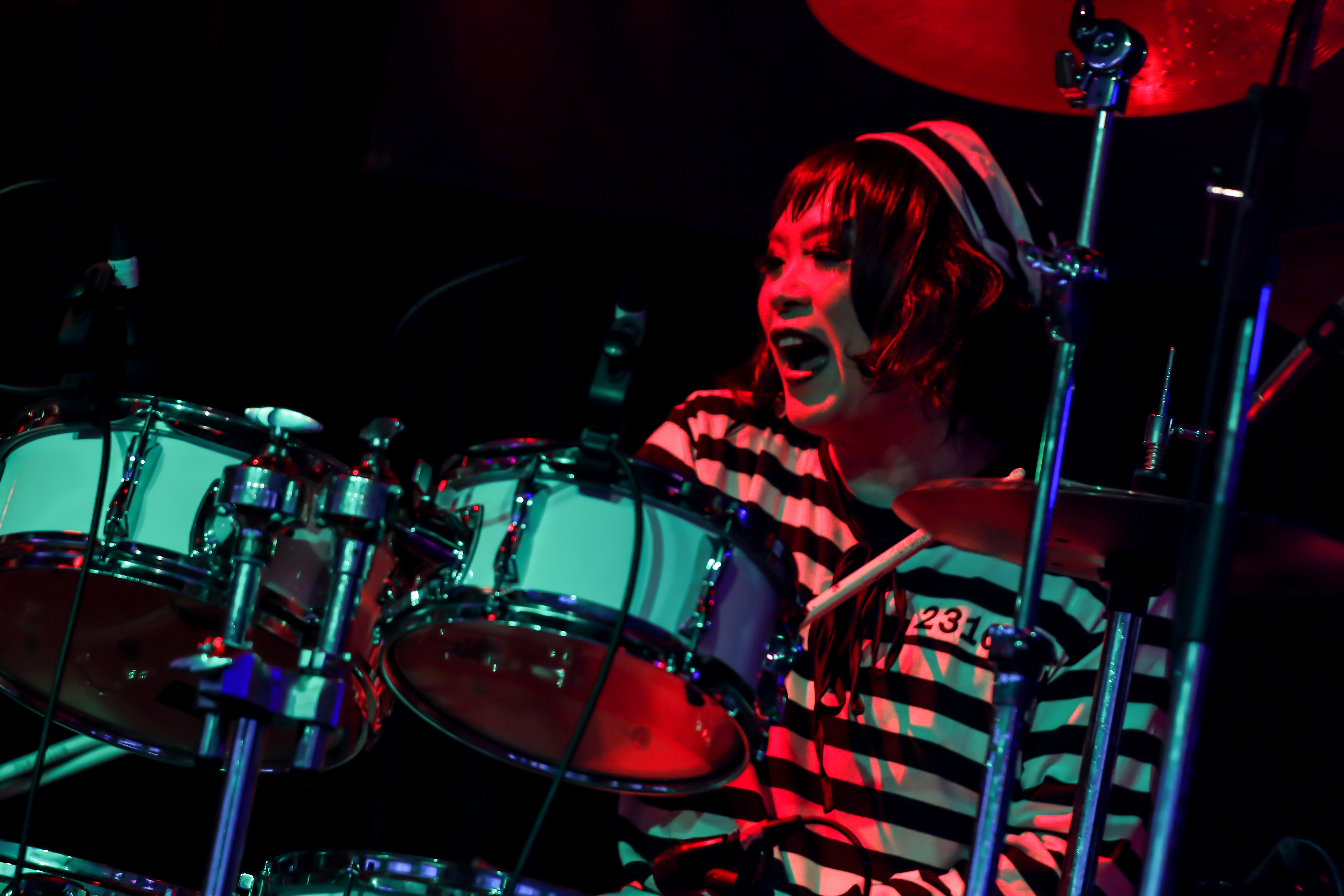 ここからは、何時ものAMBEEKのライブへ。凛々しく、勇壮に「存在証明」をぶち噛ます5人だが、今宵は全員がセーラー戦士たちの姿。観客たちも気持ちを雄々しく…といきたいところだが、つい愛らしい視線を舞台へ送り5人を見つめていたのもご愛嬌。とはいえ、激しく身体を揺らす演奏をぶつけ、フロアへ熱気渦巻く空気を作り上げたところは、さすがだ。