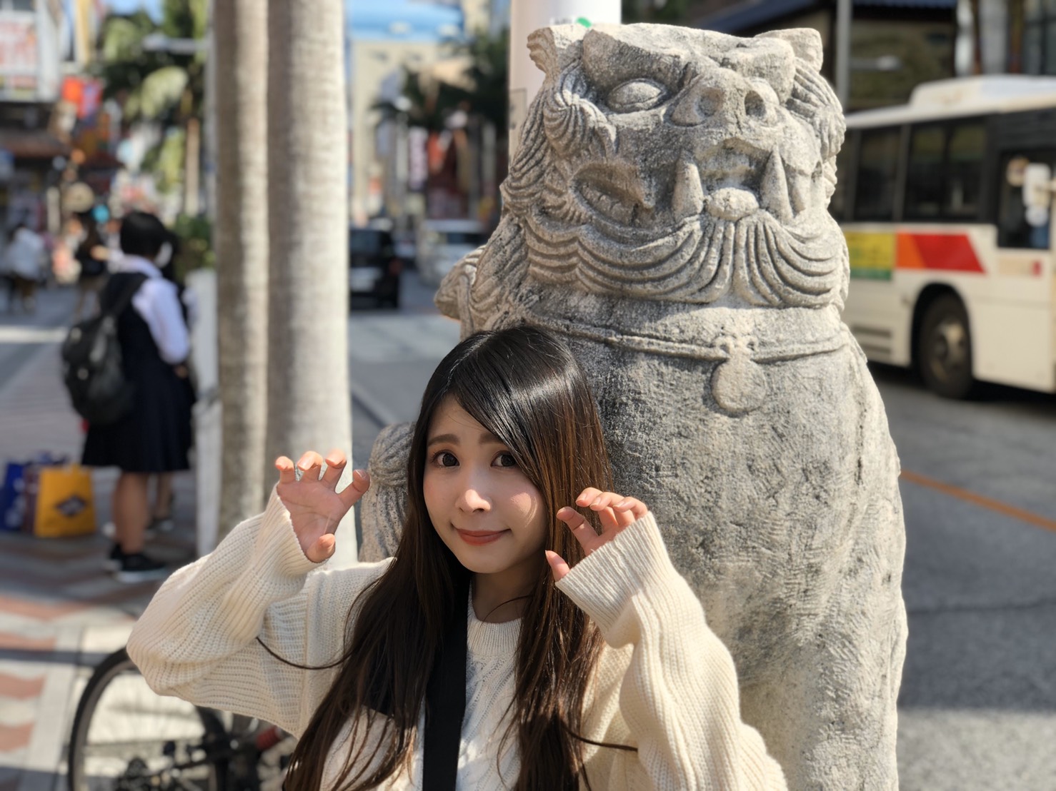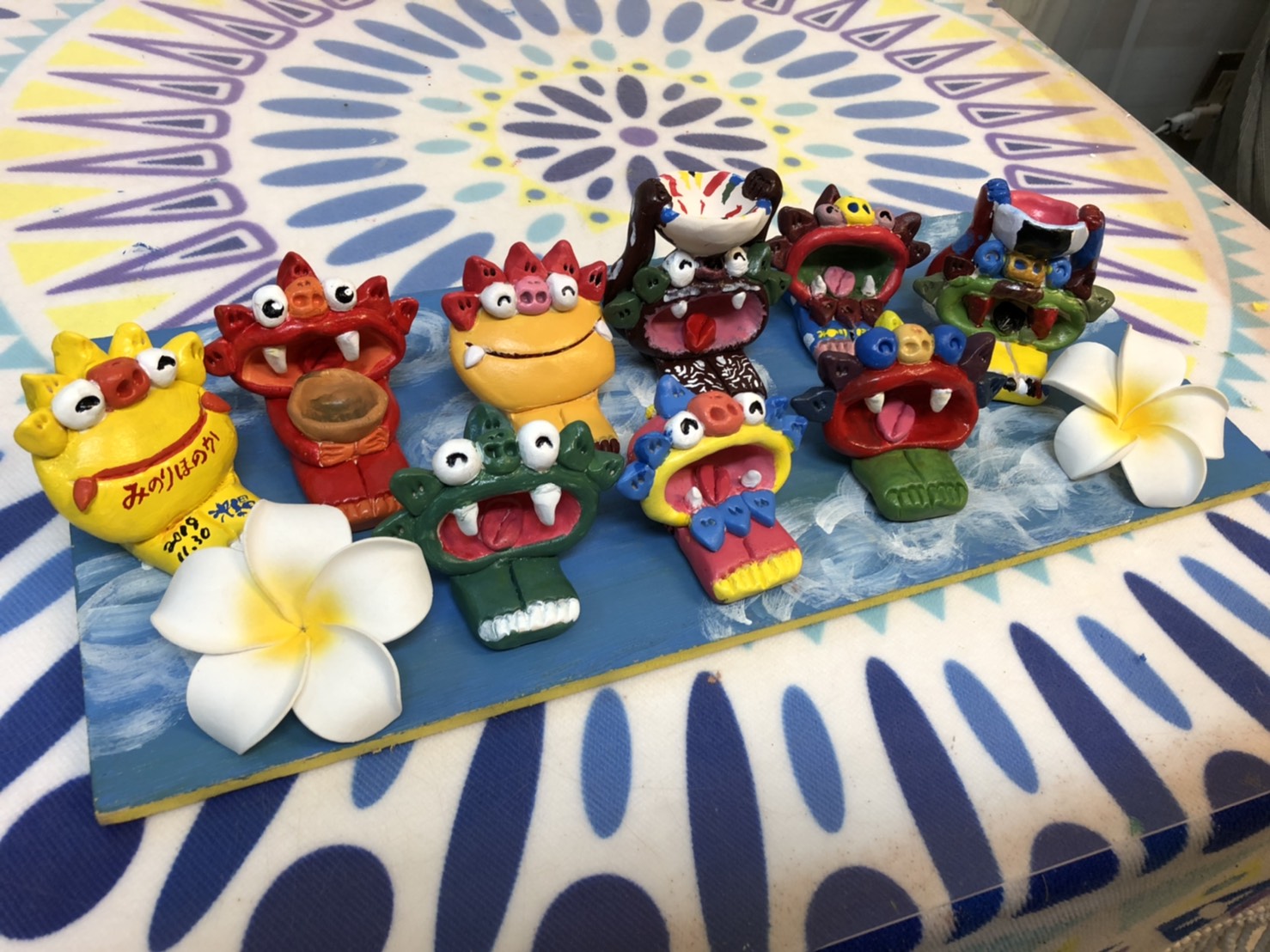 その後、みのりほのかは沖縄まで遠征してくれた愛すべき仲間たちと一緒にオフ会を開催。ライブ後にみのりほのかファンたちが、国際通りに集結。一行は、「シーサーに色を塗る」ことを楽しむ「手作り工房」で色付け体験を行うことに。お店に並んであった素焼きのシーサーへ、各自が自由に色を塗って自分だけのシーサーを作りあげることが、この工房で体験出来る楽しさ。、参加した人たちも個性的な色付けをしていたことから、みのりほのか自身が一人一人の作品を見ながら、つねに刺激を受け続けていた。それもあったのか、 みのりほのかはピカソを降臨させ、時間ギリギリまで色付けしながらシーサーを描きあげていた。オフ会参加者の方のプロ職人並の腕前には、みのりほのかも感嘆の声を上げていたほどだ。