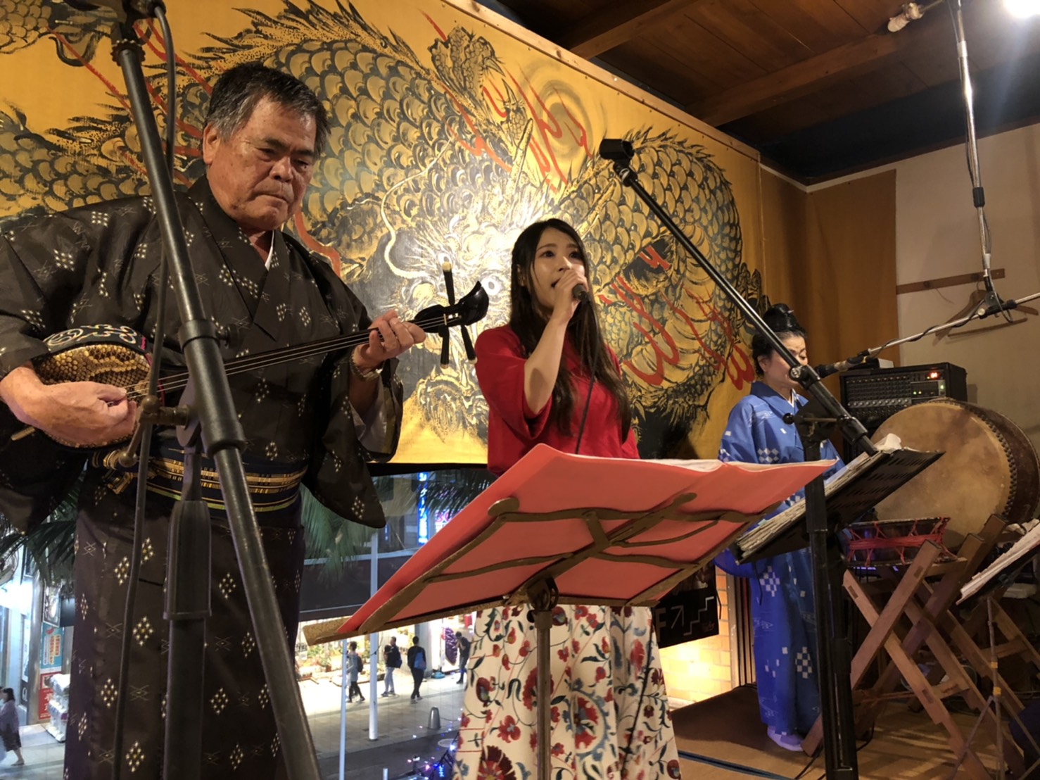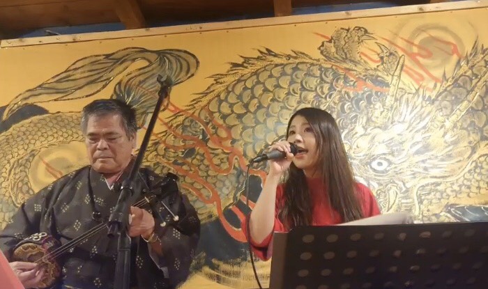 その後、みんなで国際通りを散策しながら、沖縄民謡を楽しめる食事処へ。そこは、30分ごとに沖縄民謡ライブを生で味わえる場。まずは、うっちん茶を頼んだみのりほのかを囲んで乾杯へ。先に伝えておきますが、彼女は一切呑んでいません。彼女は、沖縄遠征へ参加してくれた勇者たちと一緒に、この日の行動を振り返りながら和気あいあいと会話を繰り広げてゆく。みんなと楽しい宴を続けてゆく中、生演奏の時間へ。そこで、嬉しいサプライズが…。みのりほのか一行が、「すいっ、すいっ」とつねに楽しげに合いの手を入れていたことや、たまたま結婚したばかりのカップルがお店に来店していたことから、演奏者の方が「誰か「涙そうそう」を歌いませんか?」と呼びかけたところ、ファンたちの推薦もあり、みのりほのかがステージに立ち、奏者の演奏に合わせ「涙そうそう」を歌うことに。時々歌詞カードもちら見しながらとはいえ、彼女は堂々と「涙そうそう」を歌いあげ、お客さんたちから拍手喝采を浴びていた。