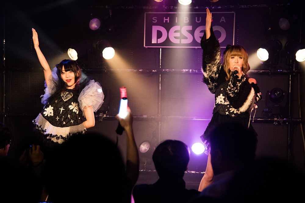 現在、二人という最小単位で活動をしている病ンドル。MCの緩~い感じも”らしい”じゃない。その緩さから一変、激しくダークな装いを持った「evil」で二人は、吐き捨てるような歌声を魅力に、観客たちを雄々しく煽りだす。女性の心に巣くう悪意な感情を、病ンドルの二人は雄々しく感情的な歌声に変え突きつけてきた。そのキリッとしたステージングに触発され、フロア中から熱した声が飛び交いだす。「さよなら」「いかないでー」の最後のやりとりも印象的だった。