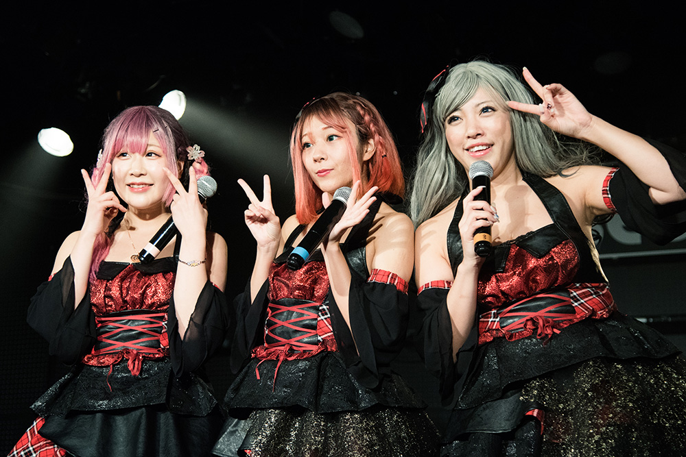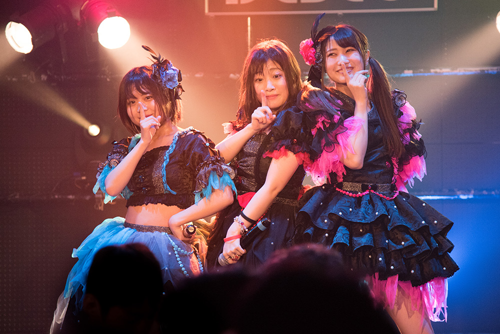 MCでは、シリアスや恰好いいモードを消し思いきり砕けてゆくのも、彼女たちらしさ。続いて披露したのが、愛夢GLTOKYO流のスタイルにカバーした「残酷な天使のテーゼ」。愛らしい歌声を響かせるリオルジャネイヨとオサキーヌ。チャーミングな中に熱を抱いた2人の歌声を、凛々しい声で煽るNEOアリカーベル。その歌声のトライアングルも魅力的だ。単なるカバーではなく、独自なワンカラーに染め上げてゆく手腕こそ愛夢GLTOKYOの持ち味。それにしても、NEOアリカーベルの低音効いた煽り声は迫力満載過ぎる!!!