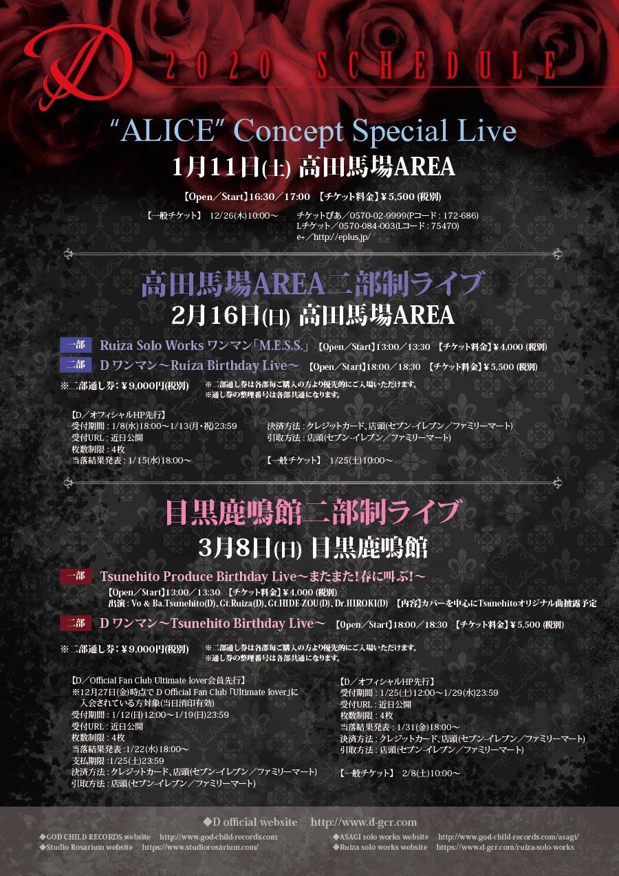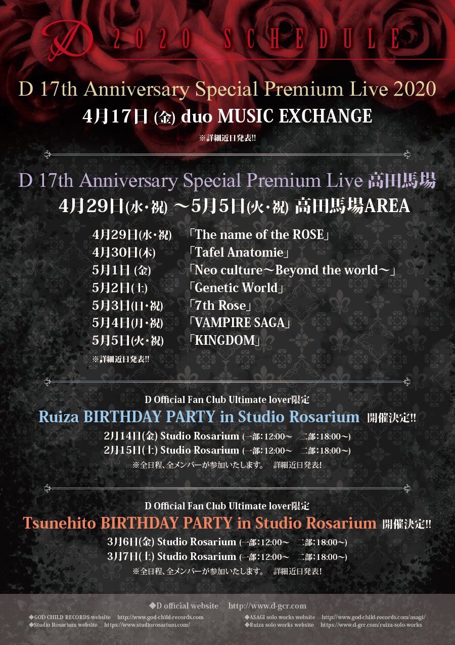 2020年のDは4月17日に結成17周年公演を渋谷duo MUSIC EXCHANGEで行い、ゴールデンウィークにはフルアルバム7枚の楽曲をすべて演奏するコンセプトワンマンライブを高田馬場AREAで7日間行うことも発表した。詳細は、インフォメーションを観て確かめてくれ。