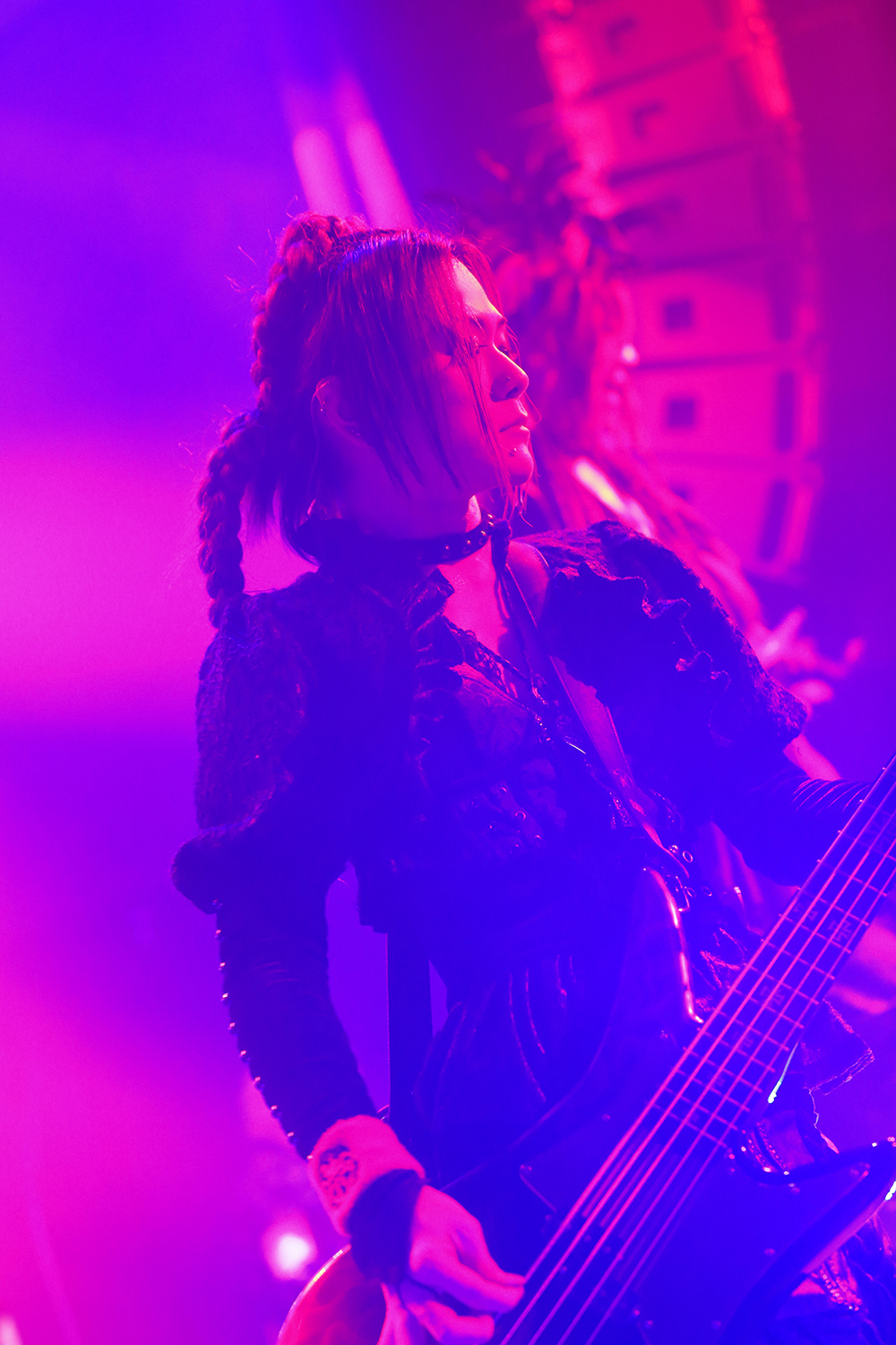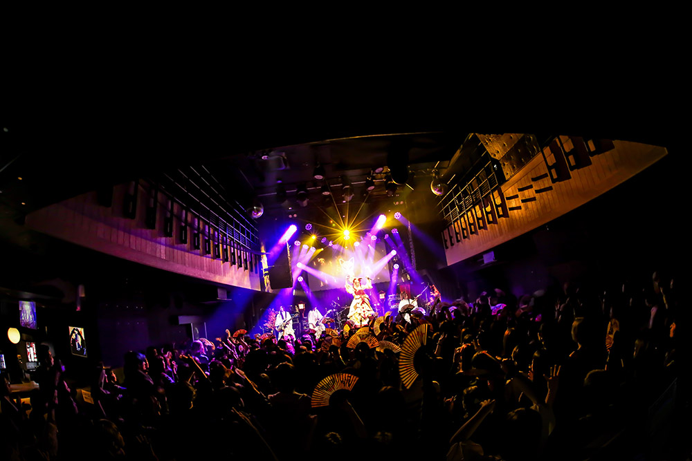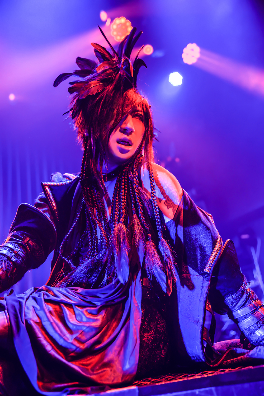 「さぁ、皆のもの、宴じゃ宴じゃ」。手にした扇子を舞い躍らせ、浅葱は「白面金毛九尾の狐火玉」を奏で、この世界へ迷い込んだ人たちを華やかな、いや、熱を放つ宴へ巻き込んでゆく。曲が進むごとに激しさを増す演奏。その熱を抱いたまま観客たちを月の力で惹き付けるように、浅葱は「月界の御子」を歌い上げる。扇子を大きく揺らす浅葱の動きに合わせ、フロア中でも無数の扇子が舞い躍る。重厚な音を背に、想いを捧げるように歌う浅葱。彼の煽りに刺激を受け、ときに絶叫する観客たち。今宵の宴は、艶やかさの中へ間違いなく狂気を抱いている。
