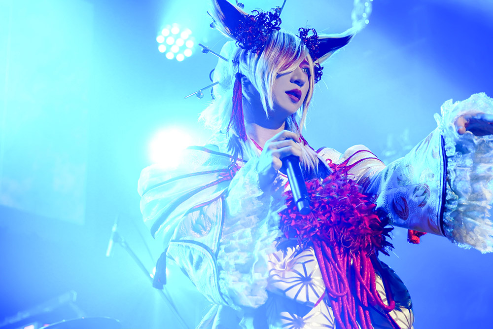 幕開けを飾ったのが、浅葱 (ASAGI Solo Works)。厳かに鳴り響く笙や琴の音。ゆっくりと開いた幕の中から姿を現したのは、妖狐の化身と化した浅葱。彼は、満員の観客たちと妖狐の祝言を挙げようと、艶やかな音色に乗せ「妖狐の嫁入り」を歌いだす。が、途中から妖の本性を現すように高笑いを上げ、浅葱は荒れ狂う演奏に乗せ観客たちを煽りだした。フロア中の人たちも、変幻する楽曲へ身を委ね、ときに頭を振り乱し、ときに熱い視線を舞台へ向けながら、浅葱の艶やかに舞い狂う色めく九尾の狐の姿へ心を奪われていた。