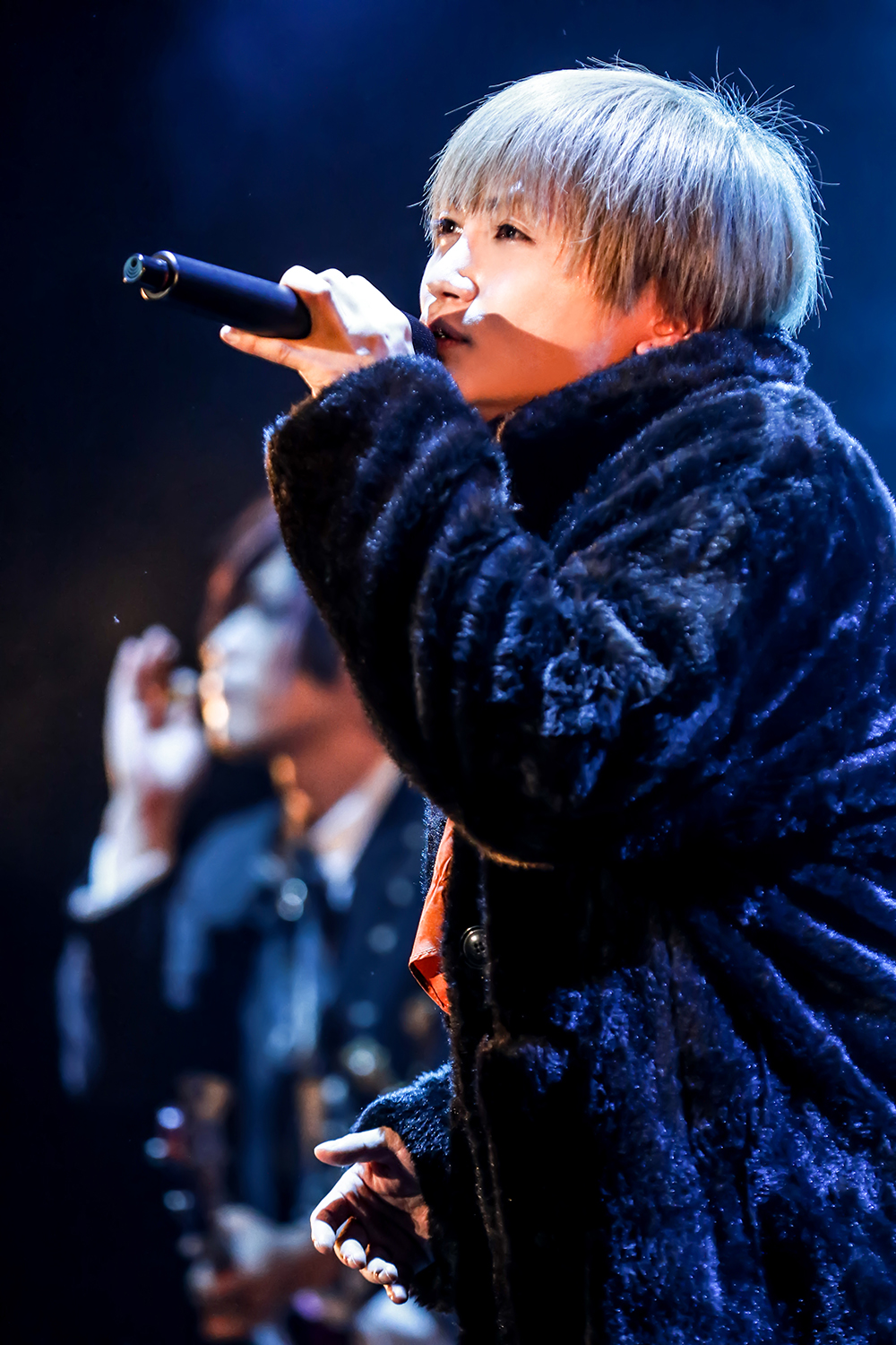 メンバーに続き、黒のゴージャスなファーコートをまとい、手を振りながらステージに現れたみく。「今日は集まってくれてありがとう! 楽しんで帰ってくださいね。僕も楽しんで歌います!」とイントロで笑顔を見せた待望の1曲目は、アンティック-珈琲店-の「Spring Snow」だ。マイクスタンドに手を添え、ソリッドなバンドサウンドに負けない歌声で健在ぶりを最初から見せつけた彼、1年ぶりにステージに立つその姿、耳に届く声に、どうしたってグっときてしまう。