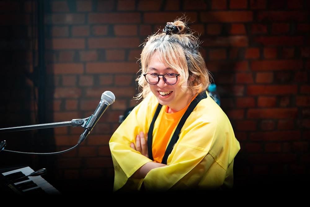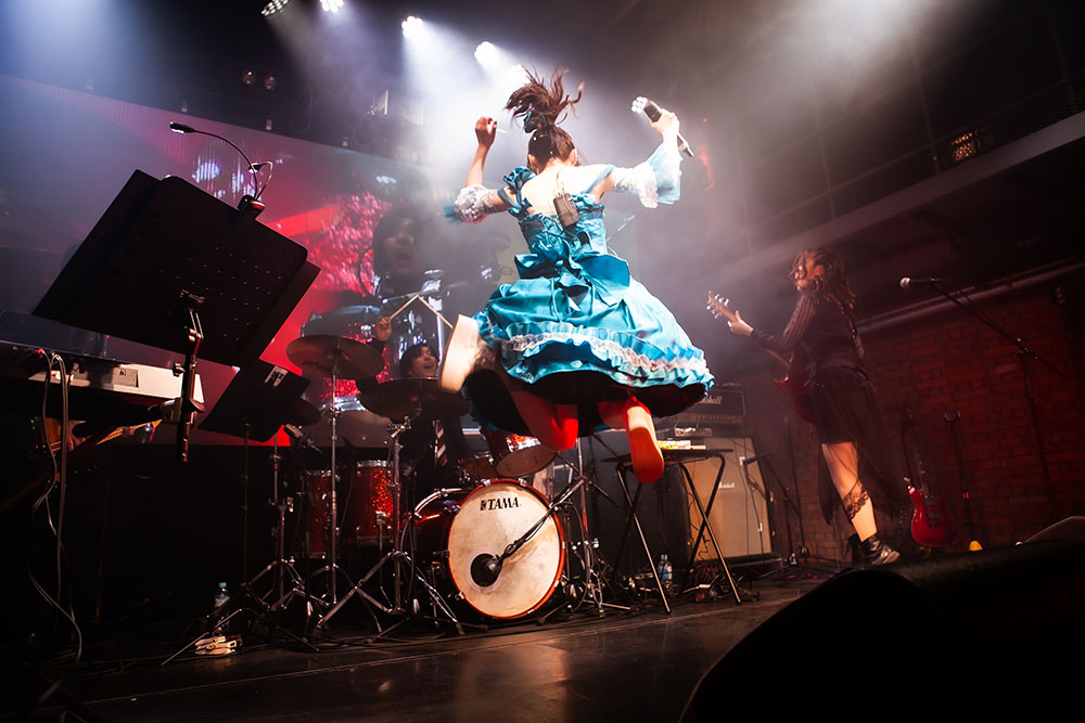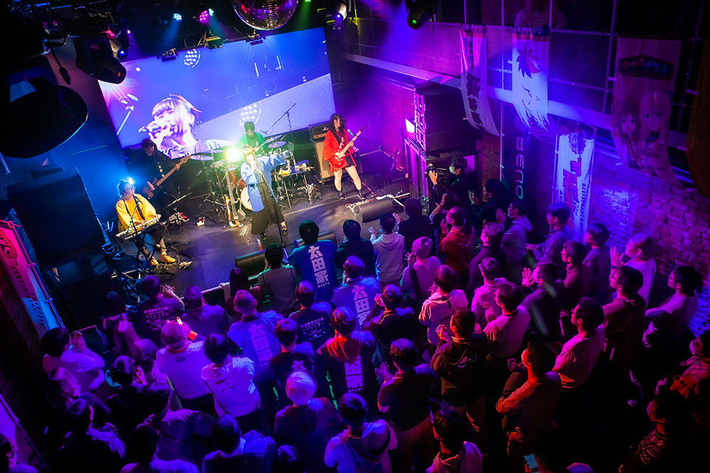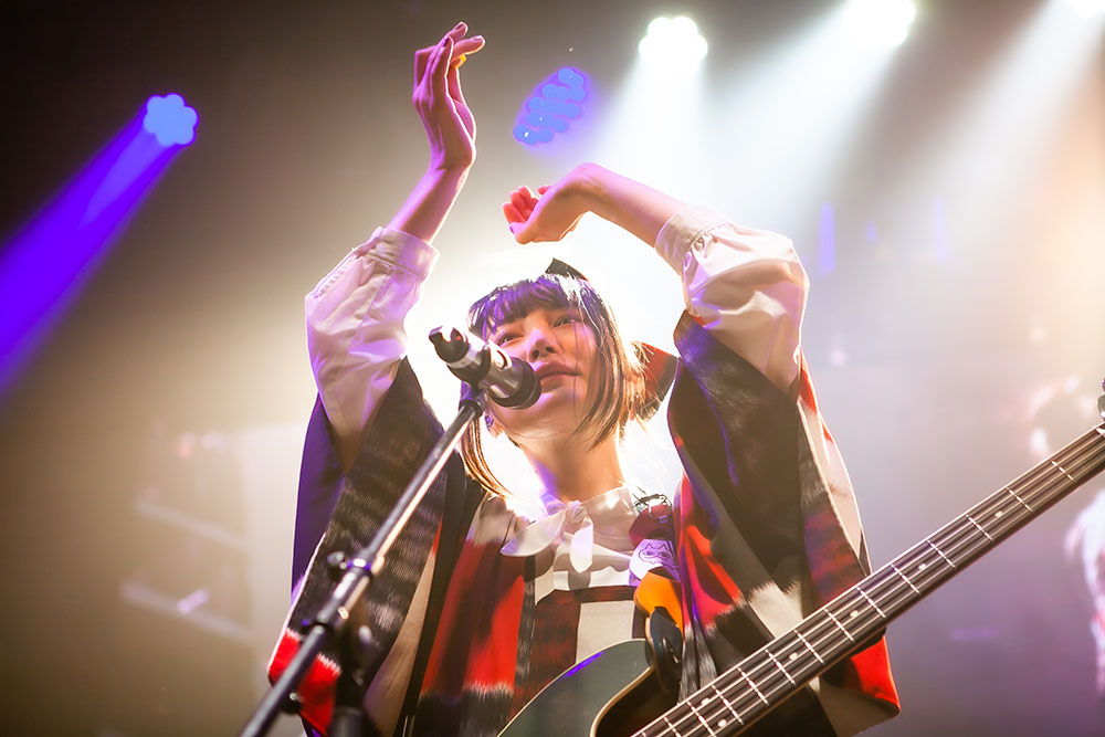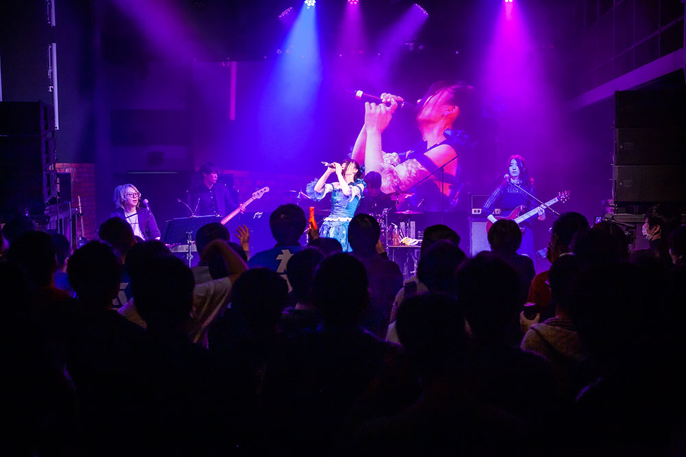 ライブは、「手と手 手と手」「手と手をかざす」と、太田彩華の掲げた手へ向けフロア中から無数の手がステージに向けられる「はじまりの手」からスタート。とても明るく華やかな楽曲なのも魅力的だ。前半は、胸を熱くするポップチューン「宵山で散って咲き誇れ」や跳ねたビートにのって楽しくスウィングするパーティナンバー「全員カンパイ PartyNight」など、触れたとたんに心を無邪気に解き放つポップソングを連投。フロア中の人たちも大きく手を振り上げ、ときに歌の掛け合いも行ないながら、気持ちが騒ぐまま笑顔ではしゃぎ続けていた。