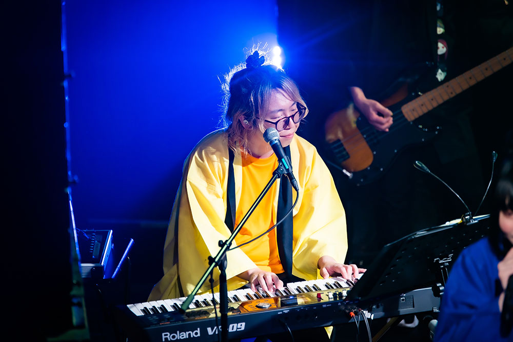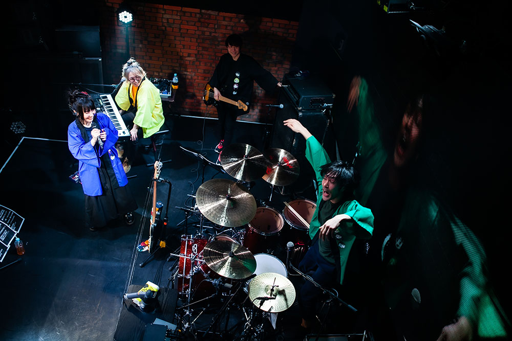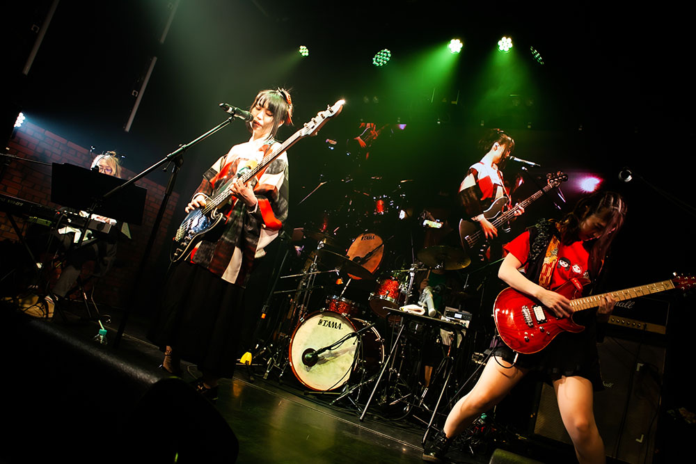 4月で活動から間もなく1年を迎えるのが、「文学的青春パンクバンド」を標榜する太田家。ライブは、その言葉に相応しい淡い青春の心模様を、愛しい人への想いを乞い求めるように歌う「星明かりのメロディ」からスタート。勢いよく駆けだした演奏と歌声が、感情の昂りに合わせどんどん熱を上げてゆく。かつて「青春パンク」という言葉が流行った頃に注目を集めていたバンドたちが歌っていたような、青臭くて不器用な、だけど必死で、とても前向きな心模様を太田家は届けてゆく。あのときから燻り続けていた青春パンクという名の叫びを、太田家は今の時代の中に甦られた。その泥臭くも真っ直ぐな心の渇きが、熱く胸を揺さぶる。その勢いを、さらに爆発させるように届けた「どうせ僕らは」。とてもエナジーを放熱する楽曲だ。フロア中の人たちが、昂る気持ちのままにメンバーらと熱い声を交わしあうのも納得だ。