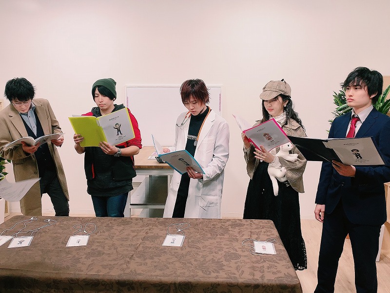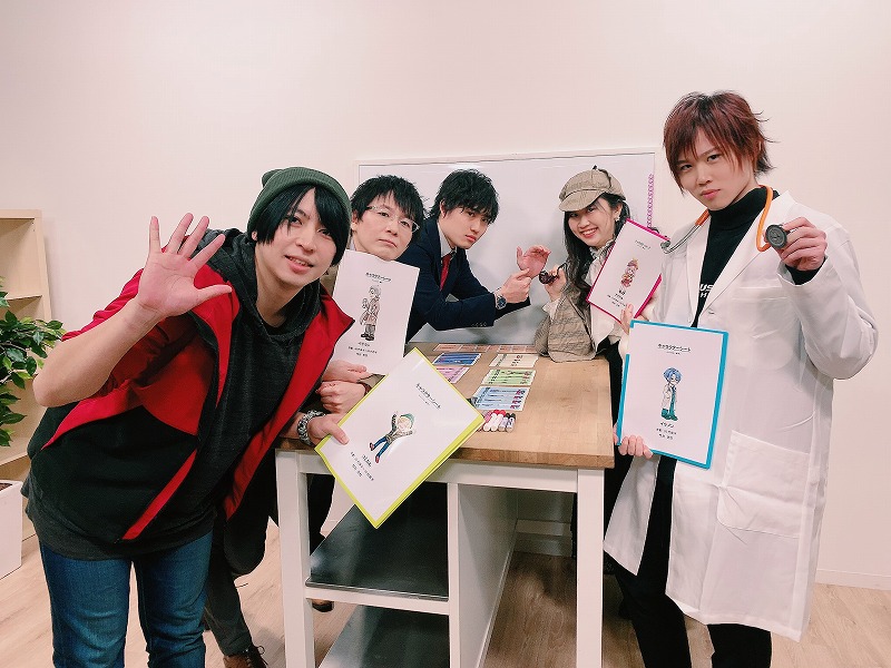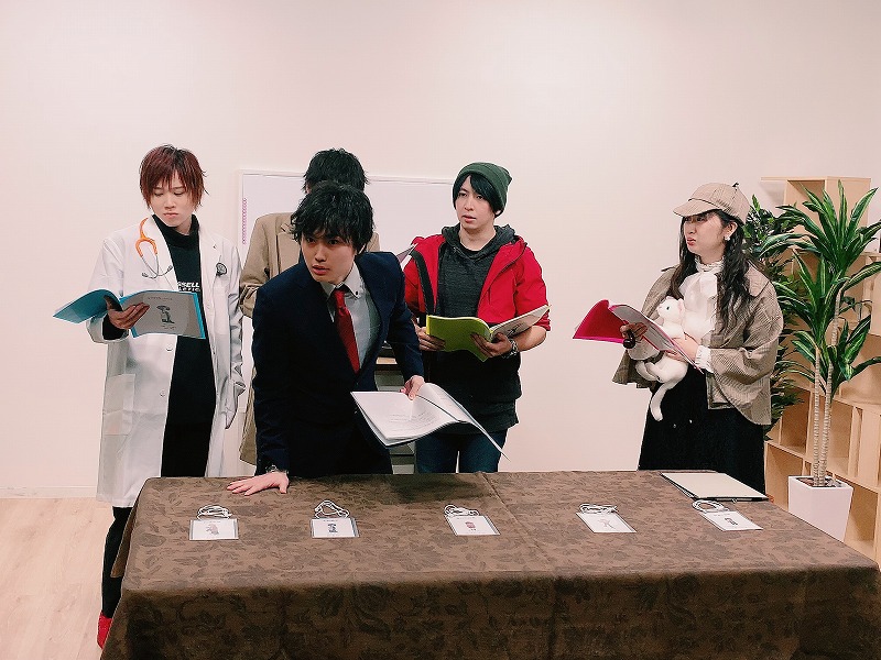 まずは、各自が自己紹介。登場するのが、ベテランという名の刑事(田邉安彦)、モデル出身のタレントでドラマでは医者役で登場しているイケメン(小松昌平)、探偵助手のアイドル(金村明日香)、若手芸人であり情報屋のコミカル(相合谷由馬)、誘拐された主演俳優HEROのマネージャー(野津山幸宏)の5人。