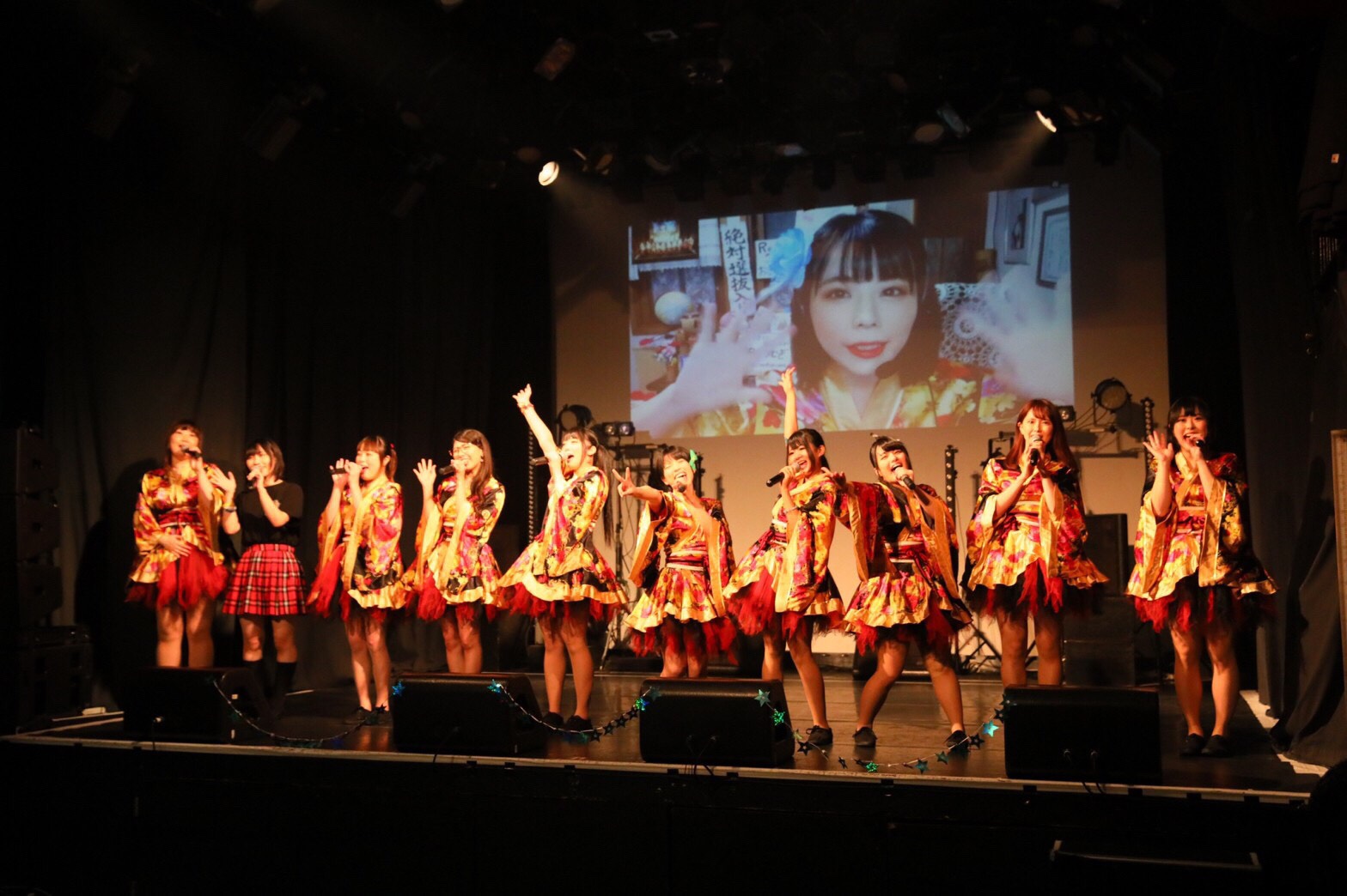 お馴染み、メンバー紹介の映像を受け、ライブは「夢幻華」から幕を開けた。華やかで雅な音色へ導かれるように、メンバーたちが妖艶に歌い舞い踊る。今宵の主役であり歌姫の佐々木千咲子を舞台の中心に据え、當銘菜々や熊野はるが彼女に寄り添う形のもと、艶やかな装いを持って燃えこれ学園のライブは一夜の物語を描きだした。