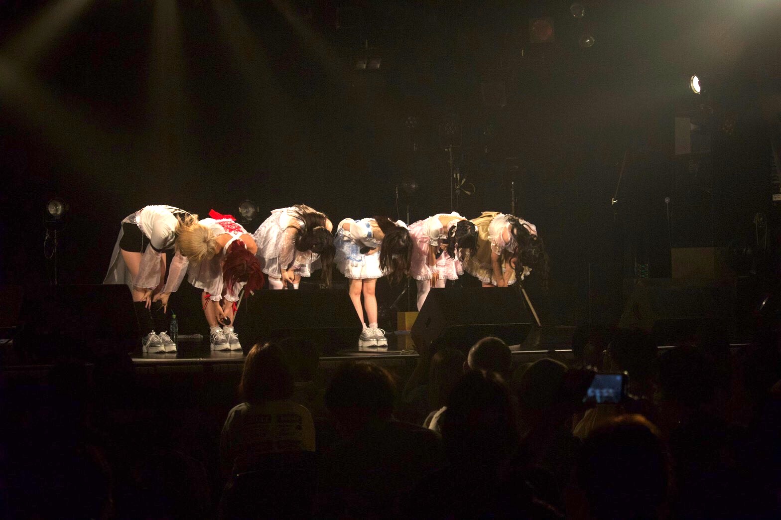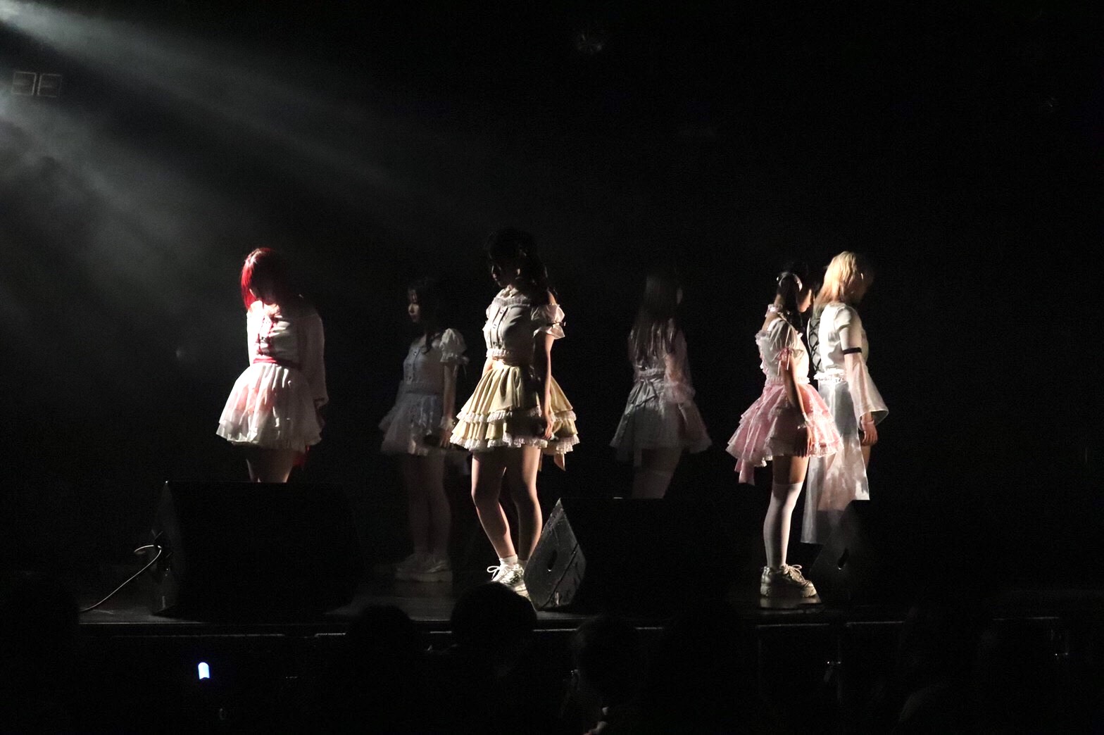 始まりの楽曲を歌い終わり、メンバーもちょっとひと安心。でも「今日はありがとうございました。6人でこれから頑張っていきます」と、始まったばかりなのに、リーダーの眠ありさが緊張のあまりエンディングのような発言をしてしまう。リラックスしてそうで、意外に緊張している様が発言の間に間から伝わってきたのも、デビューライブらしい風景だ。