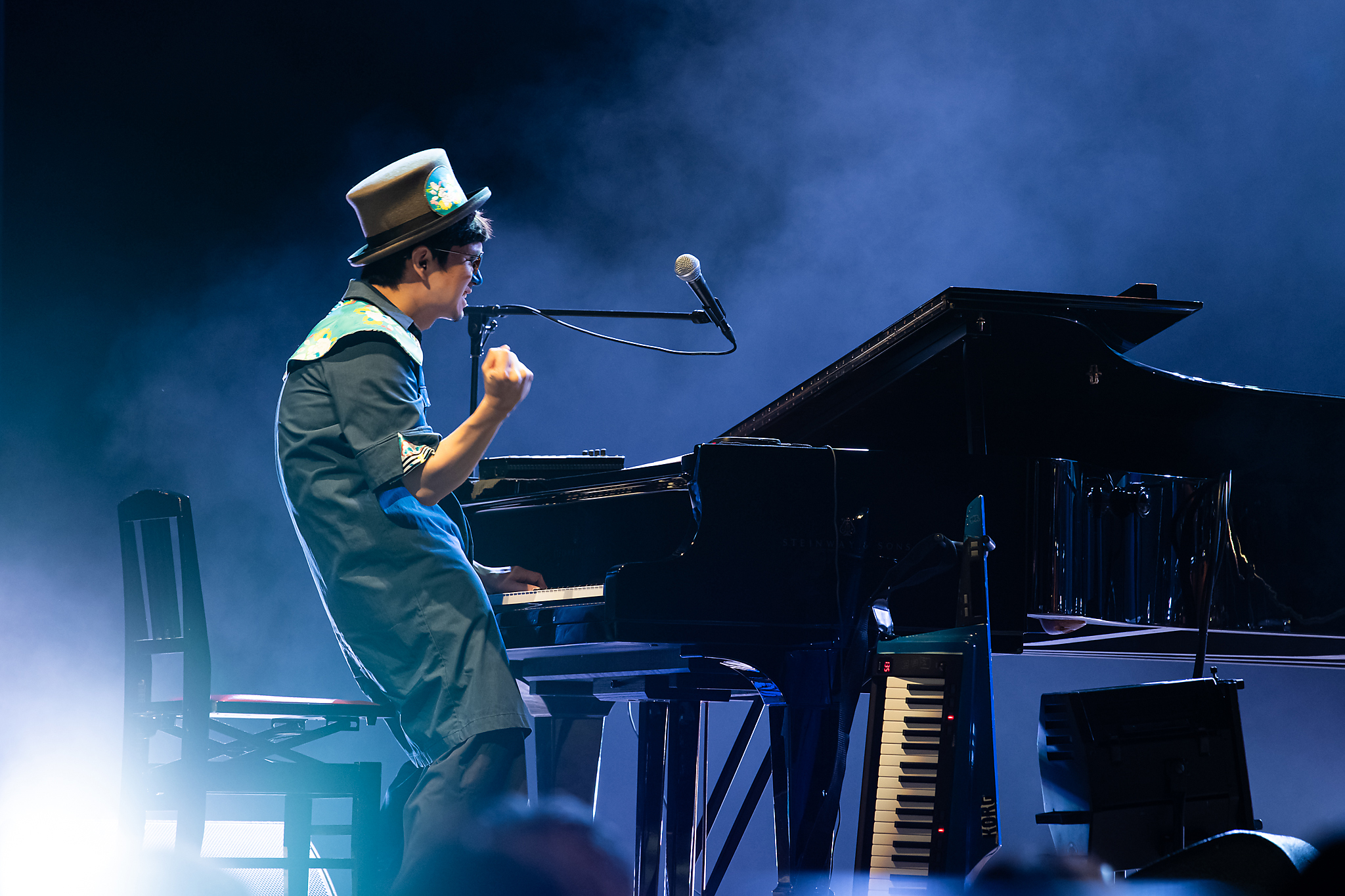 会場は入場制限を設け、混雑した状況を生まないよう工夫をしながら開演。ステージにメンバーが登場すると満場の拍手が湧きおこり、本年5月にリリースされた「負けるなチャンプ」がいきなり館内のボルーテージをあげる。さらに元旦にリリースされた「New Design」のイントロが流れる。デストーションがかかった独特のメロディが響くと、どんな夜になるのかというワクワク感が客席から伝わった。続く「情動」はピアノとドラム、ベースが熱く絡み合う演奏で会場を神秘的な雰囲気で包み込んだ。