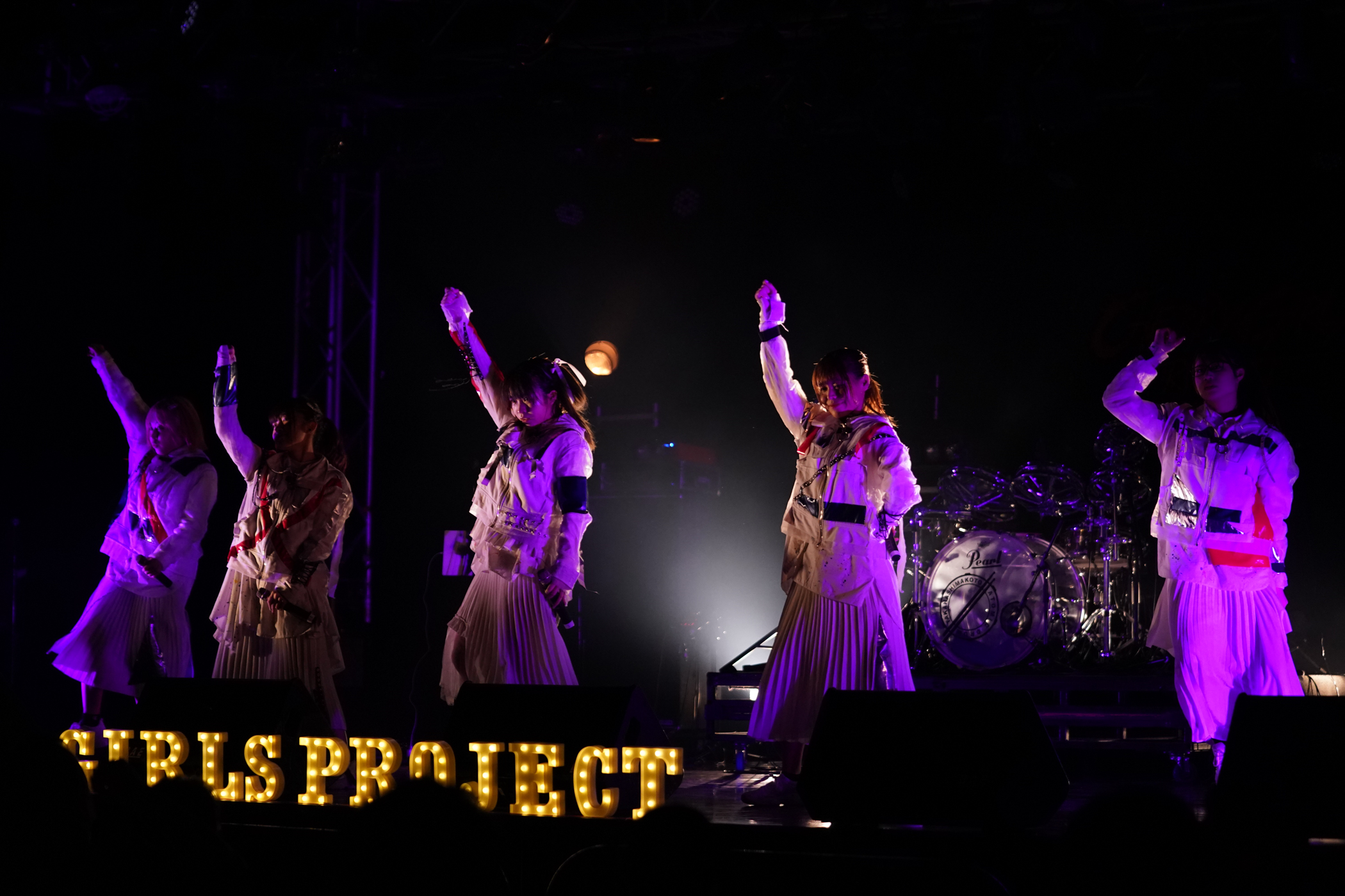 最初にぶつけたのが、「アンチエーター」。バーストした激しく唸る演奏を背に、5人は凛々しい表情で。でも、背中を力強く押す演奏をバネに、彼女たちは何時も以上に凛々しさを増した歌声とパフォーマンスを観客たちへぶつけてきた。時々、がなるように歌っていたように、何時も以上に気合いと気迫が漲っている。彼女たち自身も、圧の強いバンドの演奏と戦っていた。いや、その迫力さえ糧にしながら、自分たちの身体を通し感情を増幅しながら歌い躍っていた。