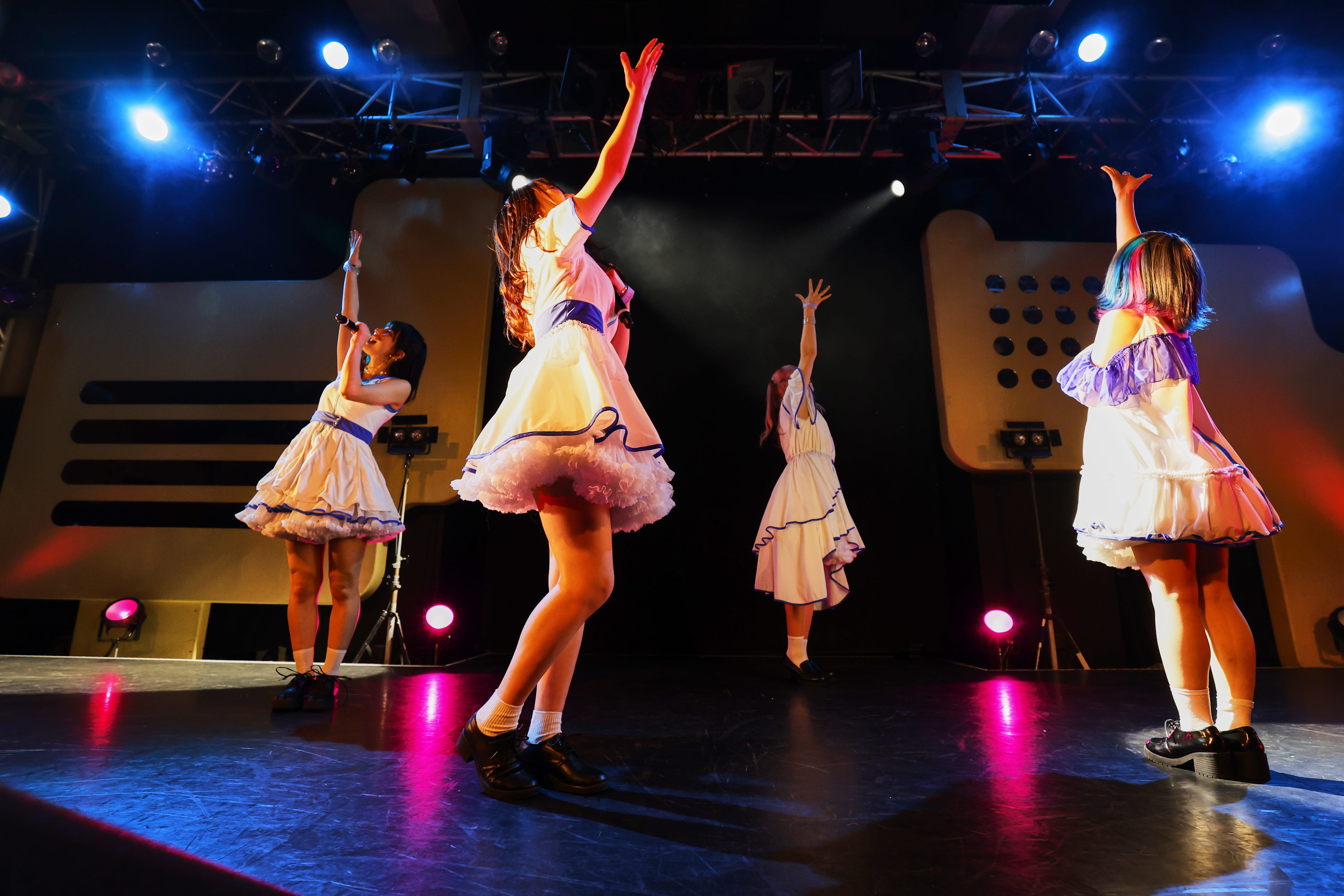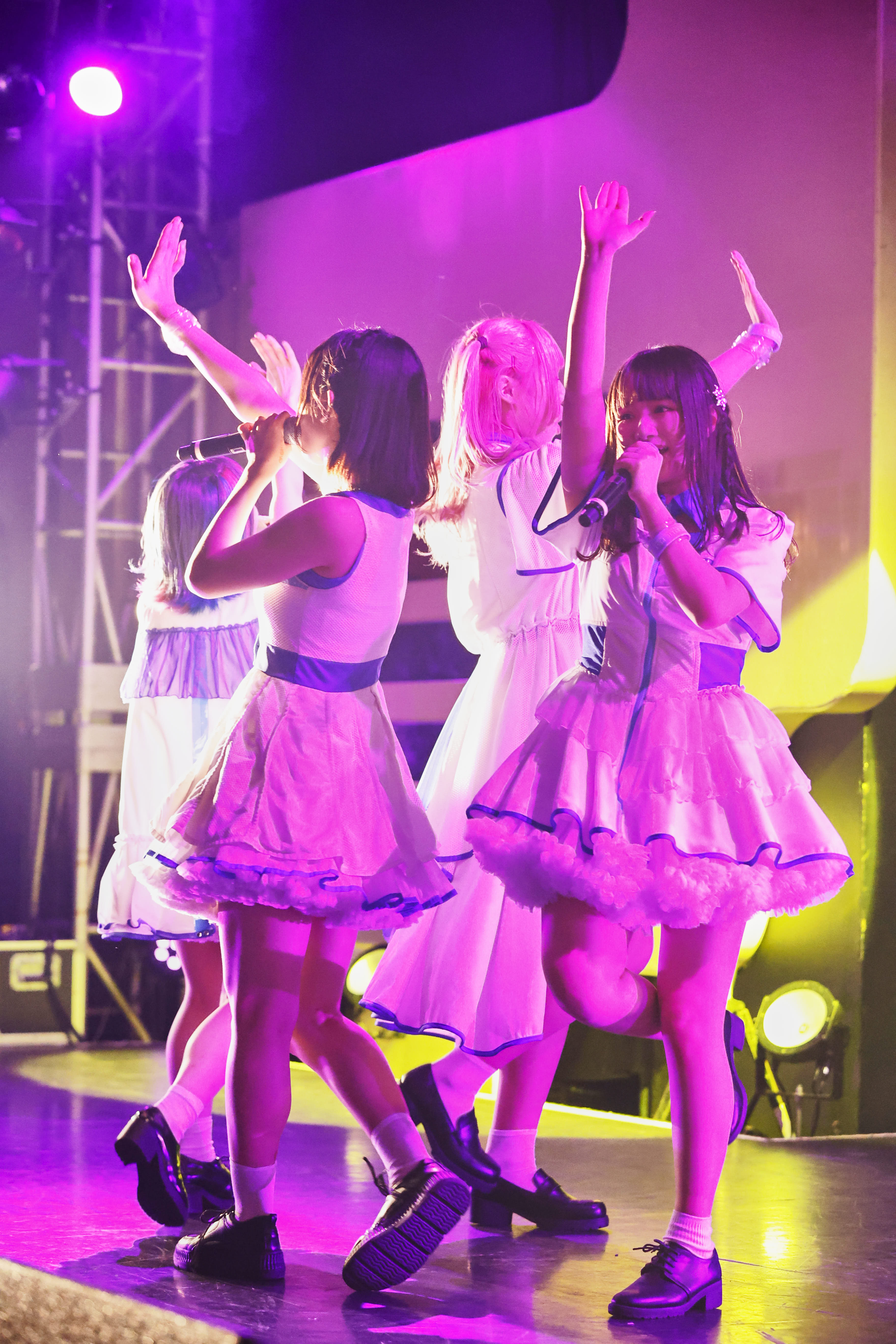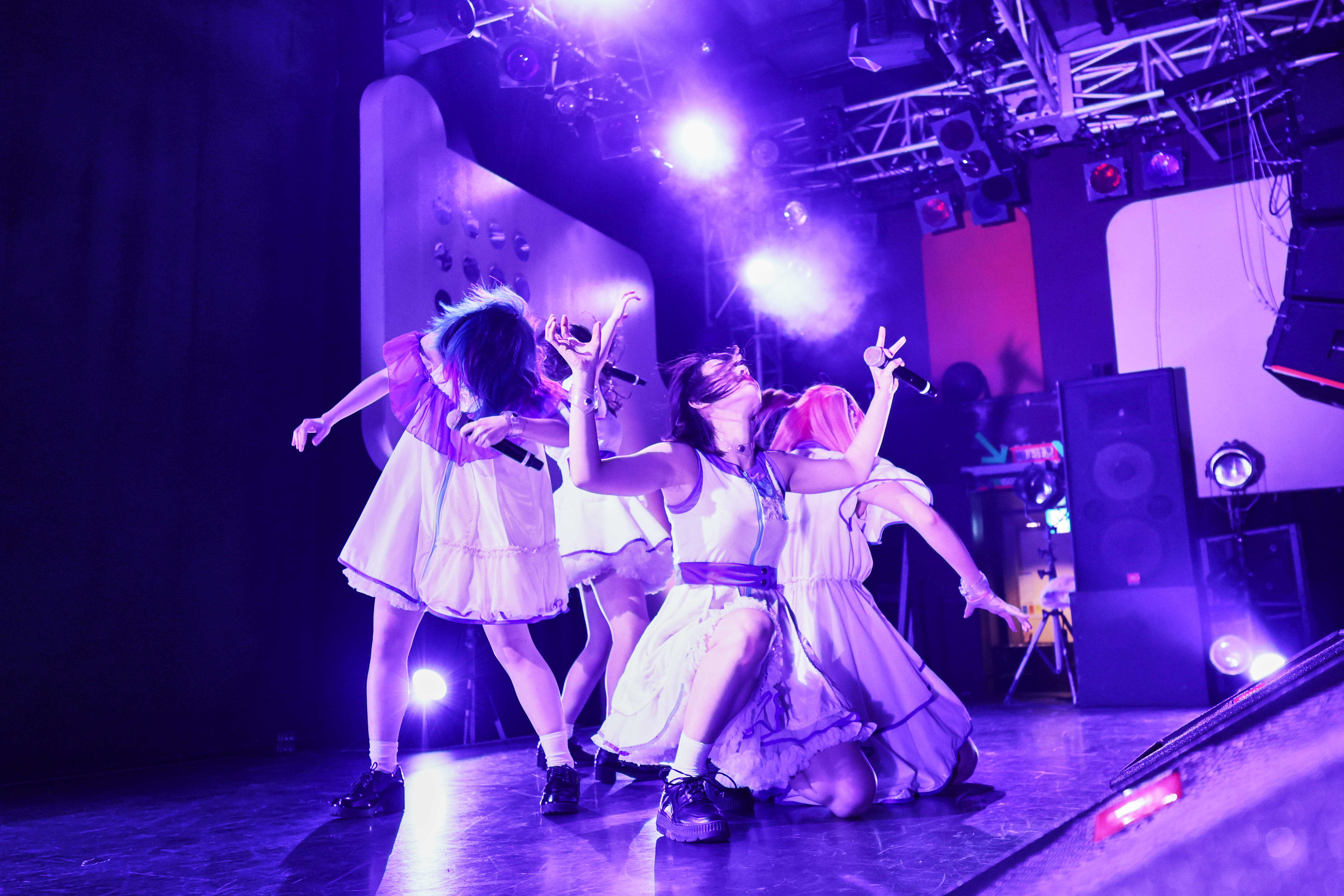 ライブは、訪れた人たちを銀河空間に現れたダンスホールへ招き入れるように「微レ存ガール」からスタート。風を切って走り出すエレクトロなダンスビートへ身を預け、4人は騒ぐ気持ちを解き放つように、無邪気な笑顔で「君はどっちから、わたしあっちから」と歌いながら、舞台の上を軽快に跳ね回る。その姿へ向け、熱い手拍が沸き起こる。さぁ、熱狂へ連れだす舞台は整った。