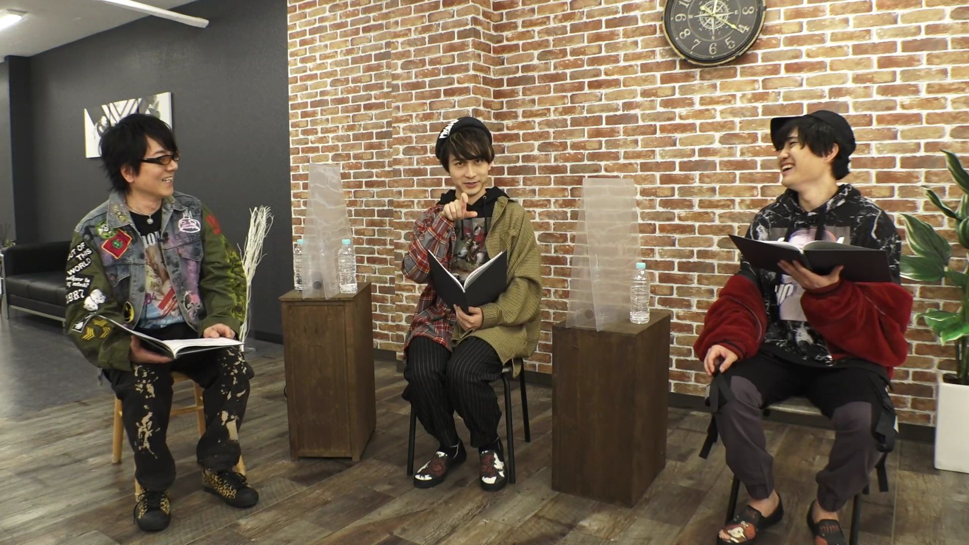 今回3人が身につけたのは、「令和の病みかわ最前線」「あなたも”裏側”の住人に」をコンセプトに、人の「闇」こそが正義となり芸術へと変化できる空間を目指す。そんな美術館のように選りすぐりの個性派アイテムを集めたファッションブランド「東京裏側」」の衣装。それぞれに身につけた衣装を、速水奨・野津山幸宏・中島ヨシキの順番で朗読。