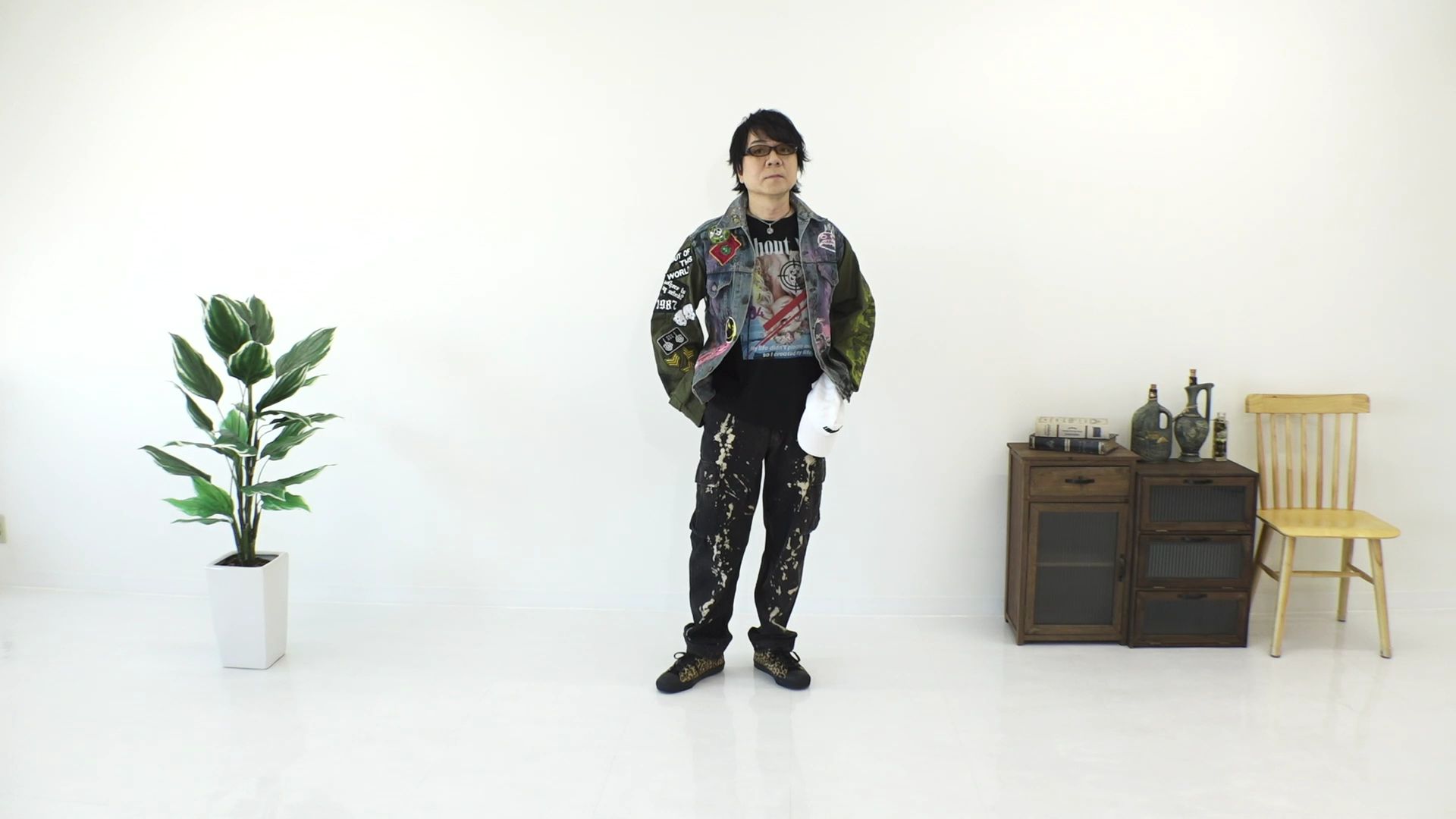 速水奨は、「世界中の子どもたちの落書きの刺繍ワッペングラフィックアートを施し、バックには壮大なアートが描かれ、様々なリメイクを施した世界にひとつだけのアイテム。そんな「VUÅSA(ヴォーサ)」のジャケットをメインに据えて、パンク&ヒップホップなスタイルで登場!」と、身につけた服を、優しい声を魅力に紹介。ラフ&ワイルドな服に身近さを覚えたのも、速水奨の穏やかな語り口調のおかげ?!