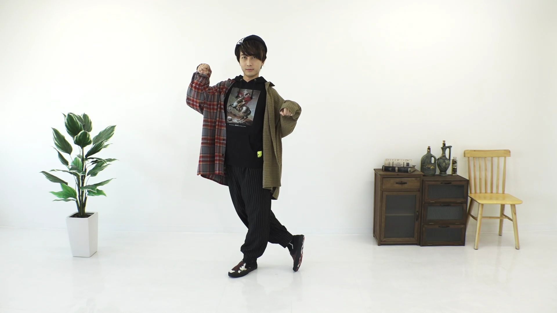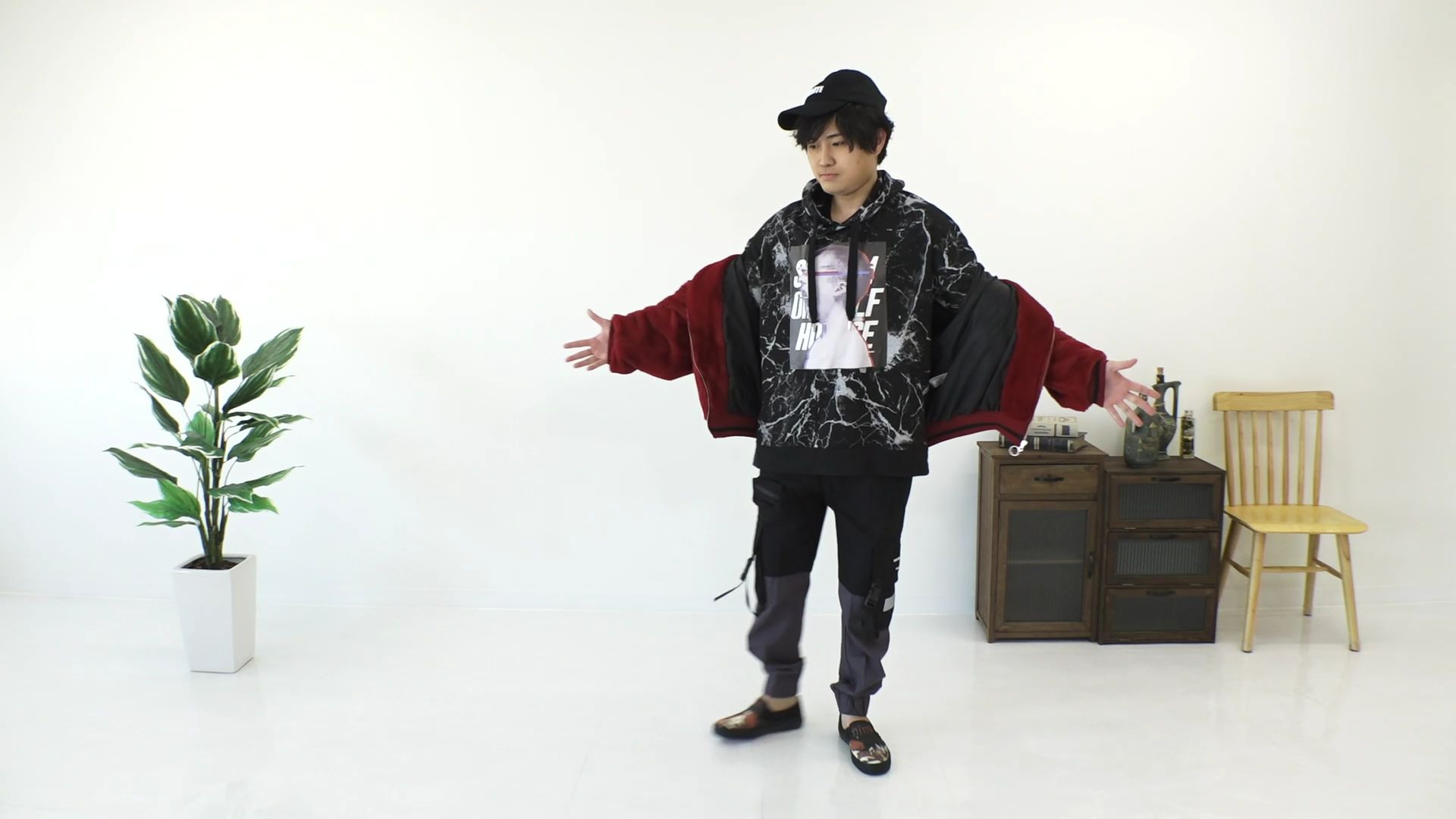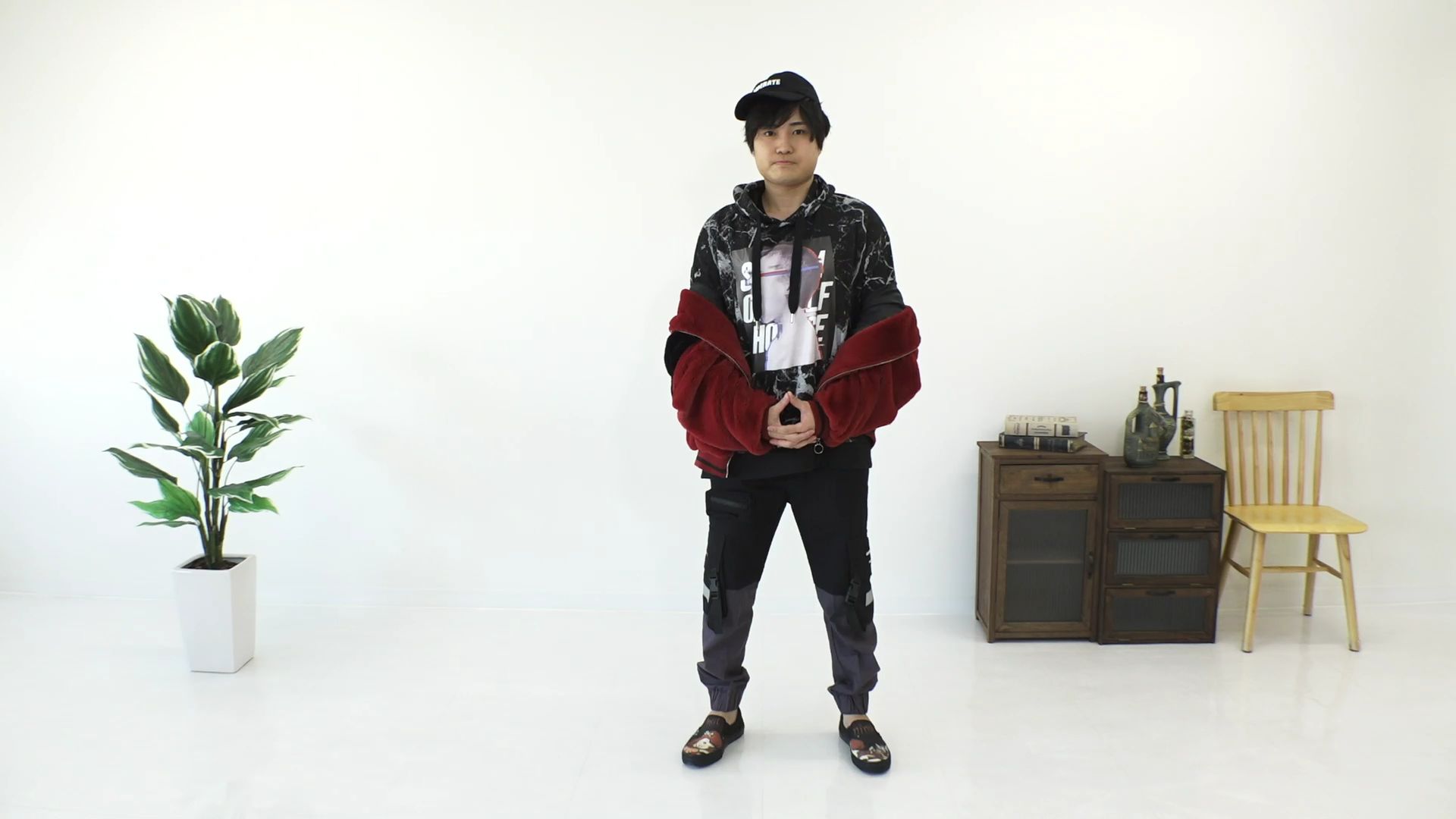 野津山幸宏は、「黒×赤を基調に、ゴシックロック要素も取り入れたストリートスタイル。ファーフードブルゾンは、ビッグシルエットの上に羽織ってもばっちりなサイズ感が嬉しい。袖口や裾の黒ラインが効いて、スポーティーとモードのバランスが絶妙なデザイン性の高いアイテムです」と、身につけた衣装の彩色華やかさと服全体が醸しだすおおらかさを、口調の強い言葉で語りながら伝えてくれた。