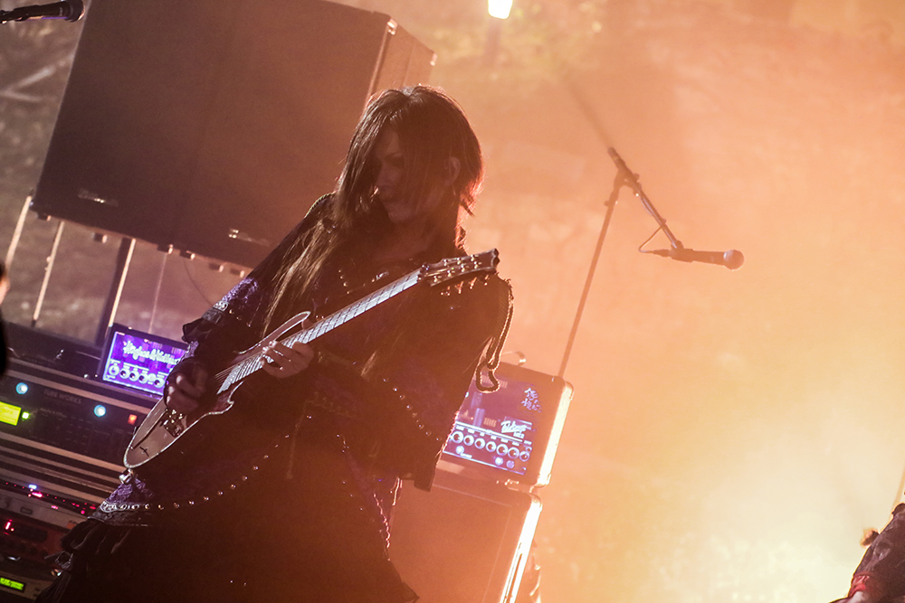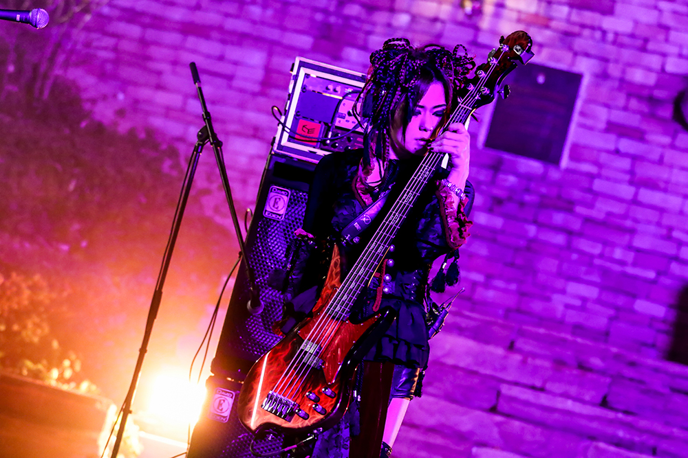 ASAGIの威厳漂う振る舞いと、強い決意の中に儚さも秘めた歌声が響き、Gt.RuizaとGt.HIDE-ZOUによるヘヴィなリフの掛け合い、そしてBa.TsunehitoとDr.HIROKIの大地を揺るがすようなリズムに引き込まれたあとは、「Der König der Dunkelheit」「黒薔薇の騎士」と、ヘヴィなサウンドと歌のメロディアスさの対比が映える楽曲が続く。