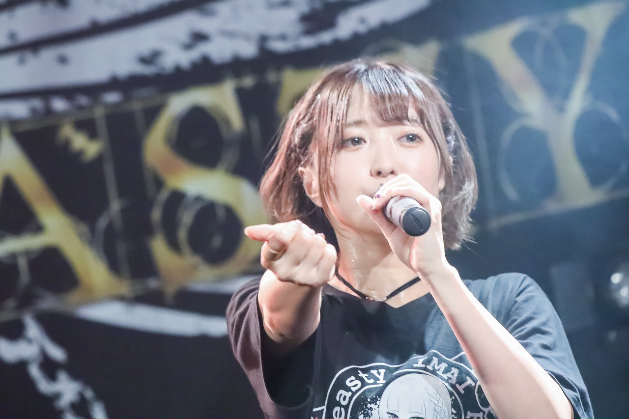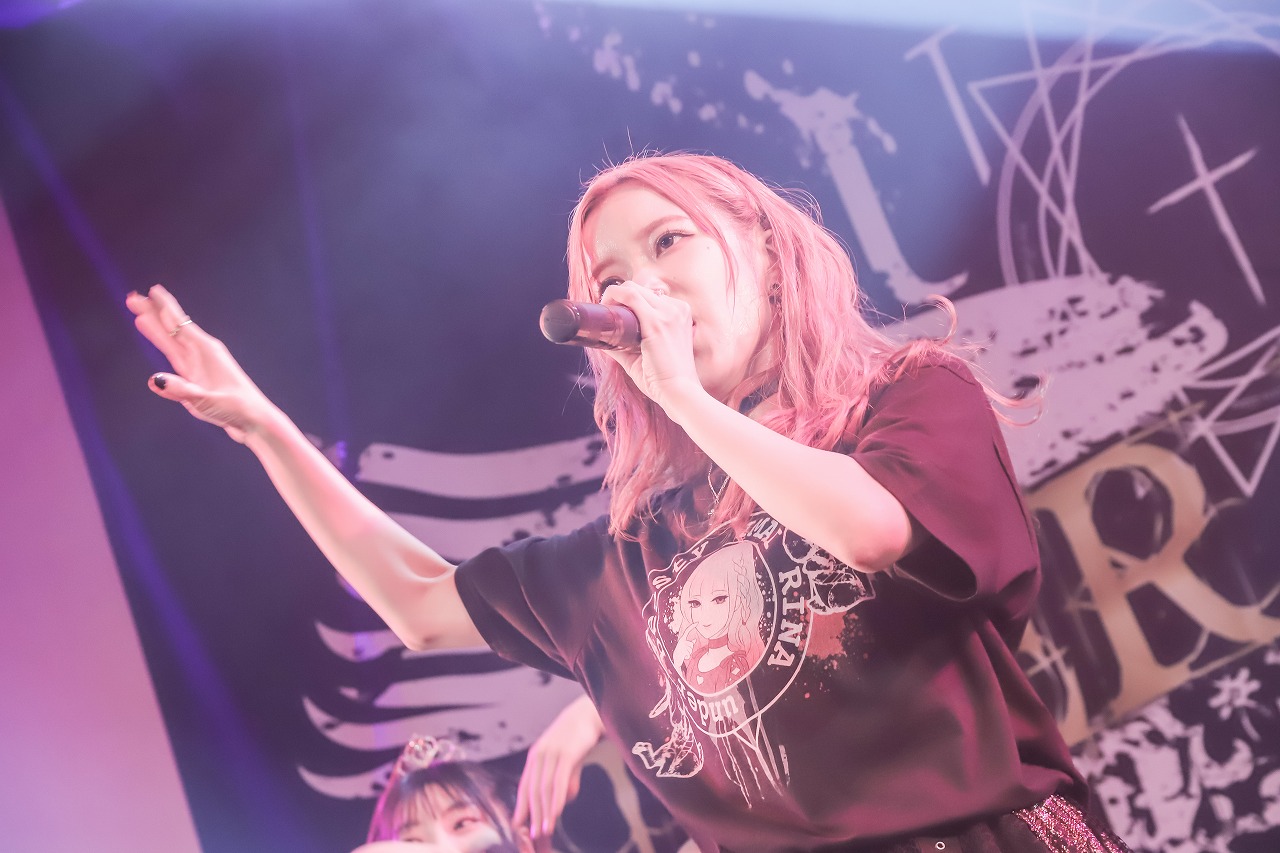 頭を飾ったのが、今年2回目の披露となる新曲の「roll a DICE」。雷鳴のようなバスドラの音も刺激的、轟音が鳴り響くラウドコアな楽曲の上で、メンバーたちが言葉を突き刺すように歌いだす。メタルコアの世界でも十分に勝負できる、爆音が炸裂した熱情ナンバーだ。彼女たちは、観客らへ挑むような姿勢で歌っていた。その姿は、闘いへ挑む高貴な女神たちのよう。超高速な爆音楽曲とは裏腹に、5人は流れるような美しいパフォーマンスも見せてゆく、そのギャップが、激しいライブへ印象深い彩りを与えていった。