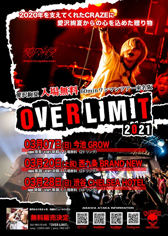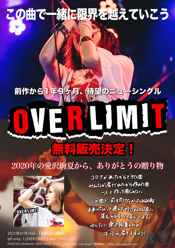 愛沢絢夏は、1月16日(土)に新しいシングル「OVER LIMIT」を発売する。いや、発売という言葉は違うな。希望する人たちに無料で配布する。3月には、東名阪を舞台に限定60分の無料ワンマン公演を行なう。愛沢絢夏のライブを体験している人ならおわかりだろうが、たった60分でも、何時もそこには、互いに気力や体力の限界まで求めあう熱狂が生まれている。