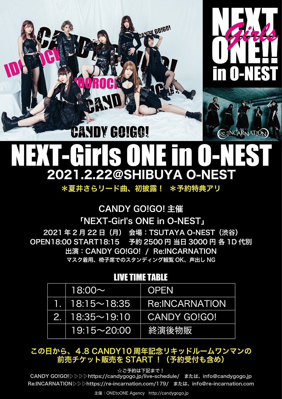対バンにRe:INCARNATIONが登場。ライブでは、夏井さらみずから作詞を担当。さらにリードヴォーカルも担う新曲の「Precious」を披露した、2月22日(月)にTSUTAYA O-NESTで行なわれたCANDY GO! GO!主催公演「NEXT-Girls ONE in O-NEST」。ここからは、当日の模様をお伝えしたい。