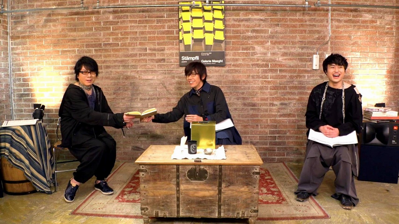 前回の配信では、それぞれが身につけた衣装の説明文をみずから朗読していたが、今回は、佐藤拓也が速水奨の衣装を。野津山幸宏が佐藤拓也の衣装を。佐藤拓也が速水奨の衣装をと、各々の衣装の説明文を朗読する形で進行。それぞれが、朗読に合わせどんな風にポーズを決めながら服のアピールをしてゆくかも見どころだ。