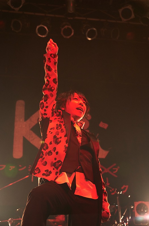 「さぁ、もっといこうか!!」。デジタルサウンドと激しく躍動する生の演奏をミックスしたKra流のダンスロック曲の登場だ。ときにデスボイスも交え、煽るように歌う景夕。サビ歌でも、がなるように歌いながら熱を持った感情をぶつける景夕の姿が舞台にはあった。Kraは「LOST NUMBER」を通し、もっともっと騒ぎたいんだろうと観客たちを挑発してゆく。やはりライブは気持ちを躍動させてこそ。終盤に生まれたシンフォニックなフレーズ。その後に続くラウドな演奏など、1曲の中にKraはドラマチックな展開を描き出していった。その様に触発され、身体が揺れ続ける。
