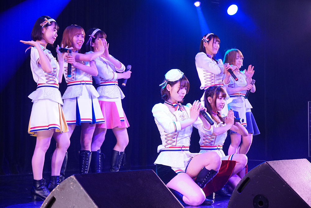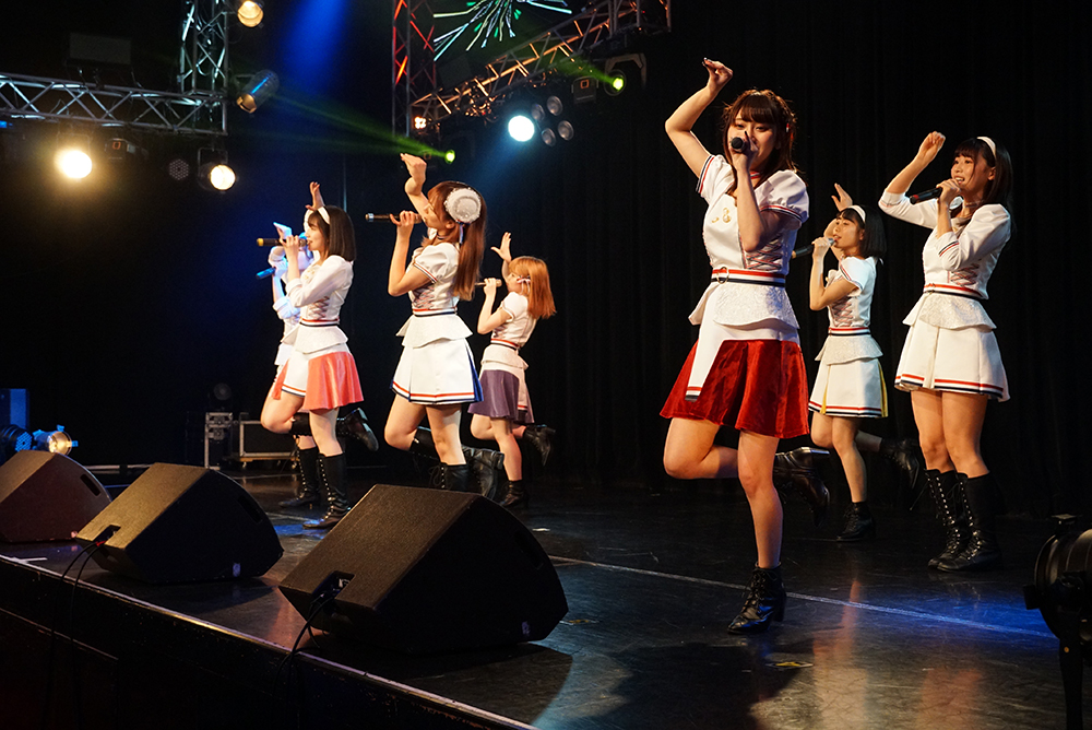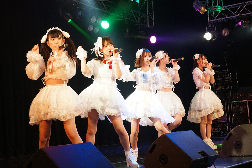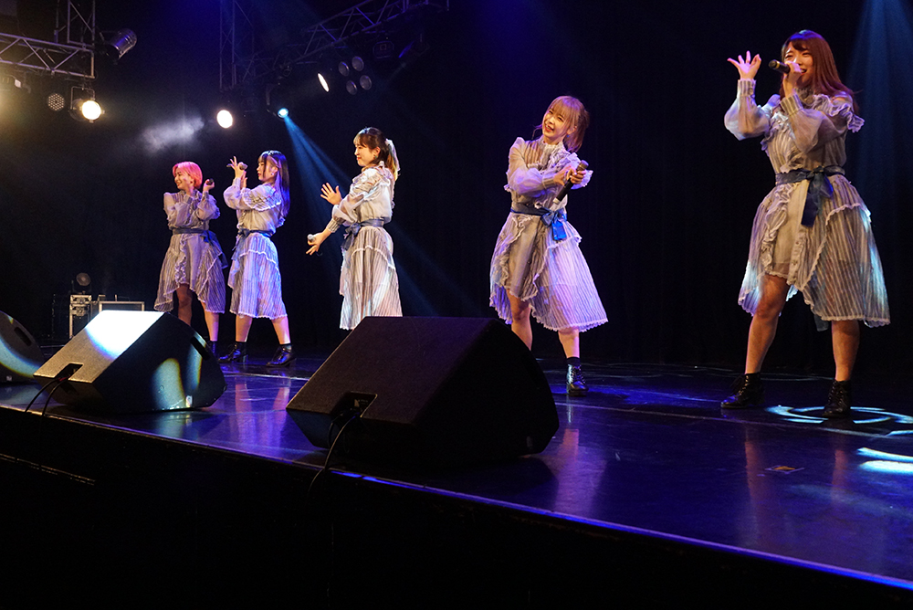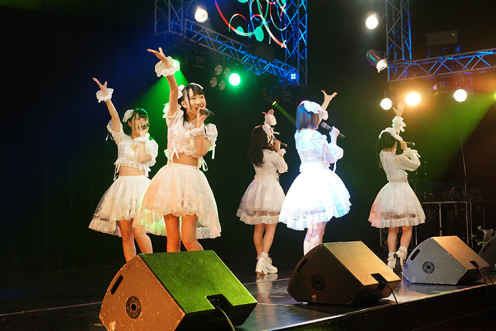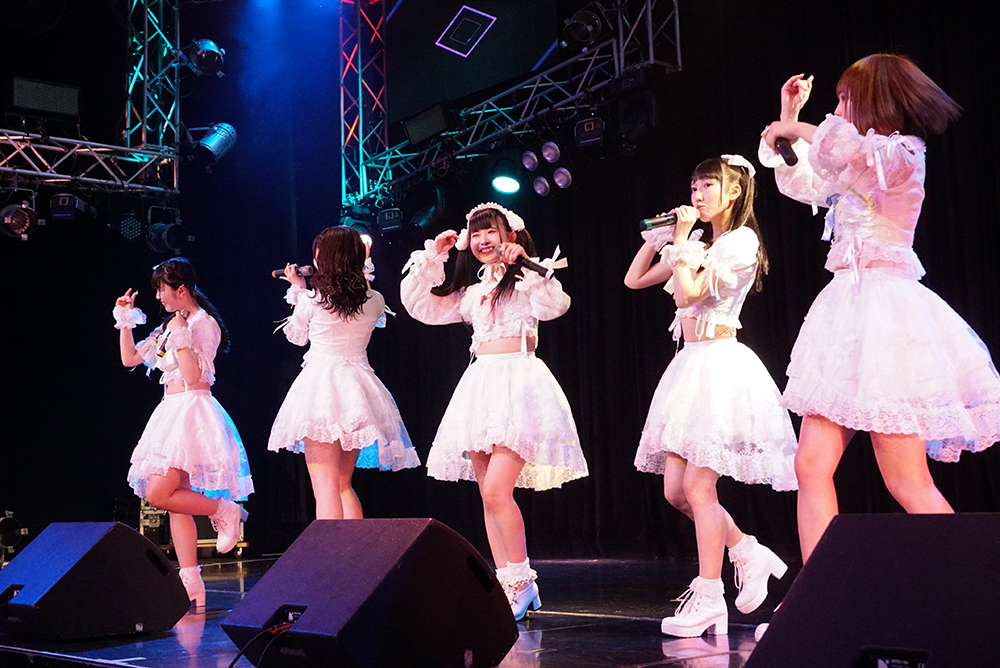 SPP撮影会所属の撮影会モデルにより構成された、ニコニコ♡LOVERS。「夢に見てたような理想綴る物語 わがまますぎる恋をしよう」と夢馳せるように歌う声から、楽曲は「Girlish Fantasy」へ。いきなり冒頭から、キラキラ輝くときめいた乙女の姿を見せてくれたのが嬉しい。舞台の上で無邪気にはしゃぐ5人。「恋せよ乙女」と歌いながら、彼女たち自身が主人公の気持ちと同化し、恋する乙女心を無邪気に楽しんでいた。恋したときの乙女が輝いて見えるように、ときめきを覚えながら歌っているときのニコニコ♡LOVERSの姿もチャーミングに輝いていた。その様はまさに、最強無敵な乙女たちのよう。