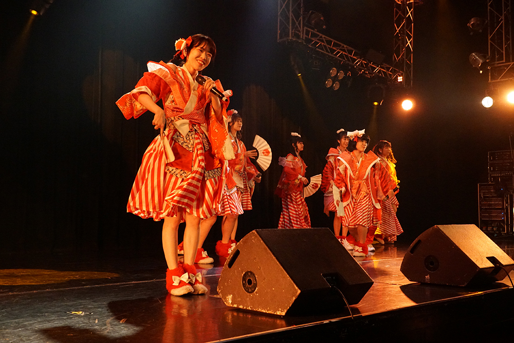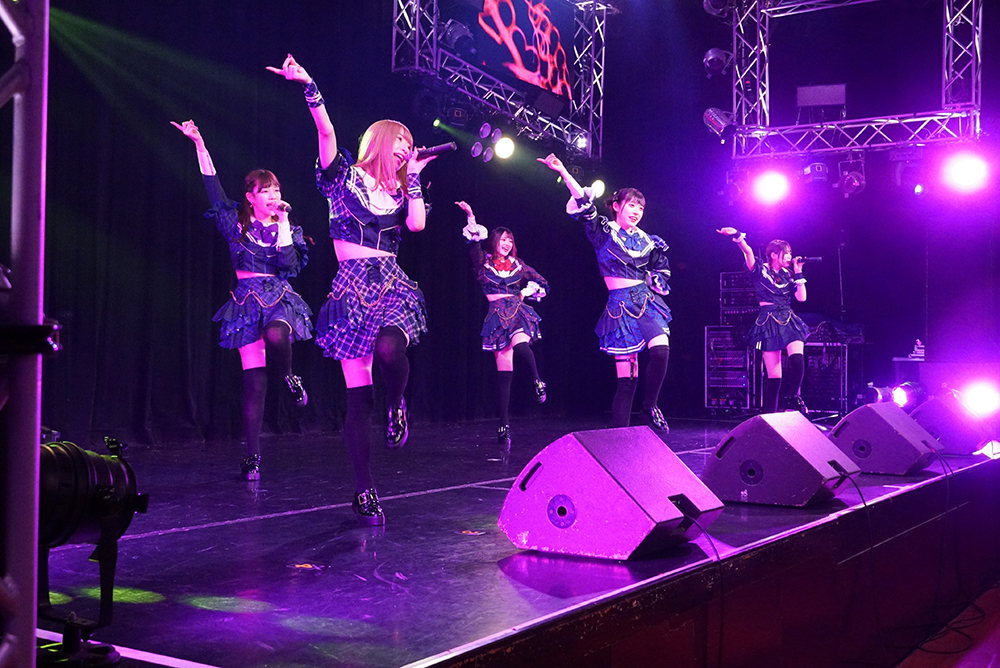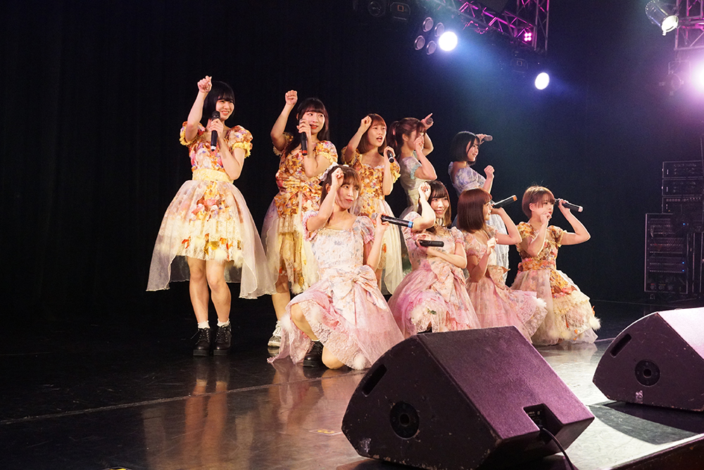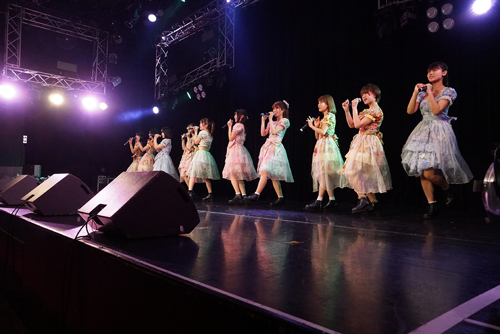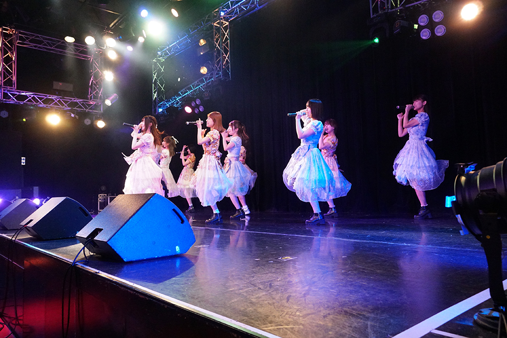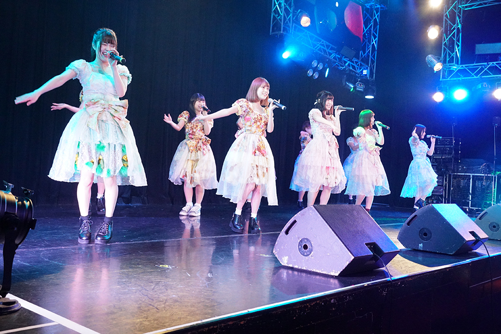 SPP撮影会所属の撮影会モデルにより構成された、ニコニコ♡LOVERS。「夢に見てたような理想綴る物語 わがまますぎる恋をしよう」と夢馳せるように歌う声から、楽曲は「Girlish Fantasy」へ。いきなり冒頭から、キラキラ輝くときめいた乙女の姿を見せてくれたのが嬉しい。舞台の上で無邪気にはしゃぐ5人。「恋せよ乙女」と歌いながら、彼女たち自身が主人公の気持ちと同化し、恋する乙女心を無邪気に楽しんでいた。恋したときの乙女が輝いて見えるように、ときめきを覚えながら歌っているときのニコニコ♡LOVERSの姿もチャーミングに輝いていた。その様はまさに、最強無敵な乙女たちのよう。
