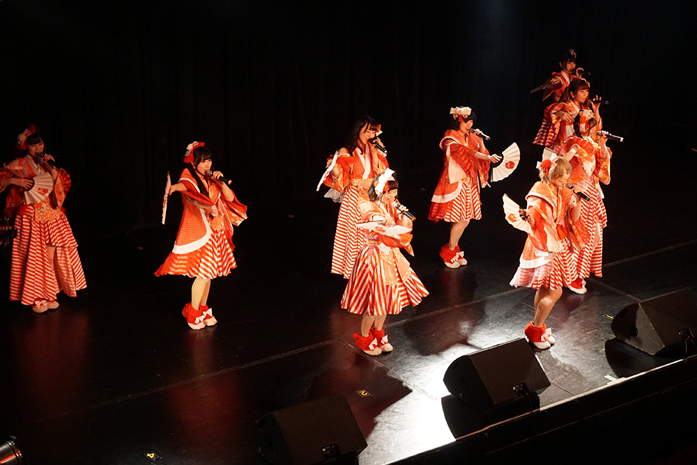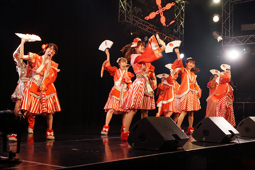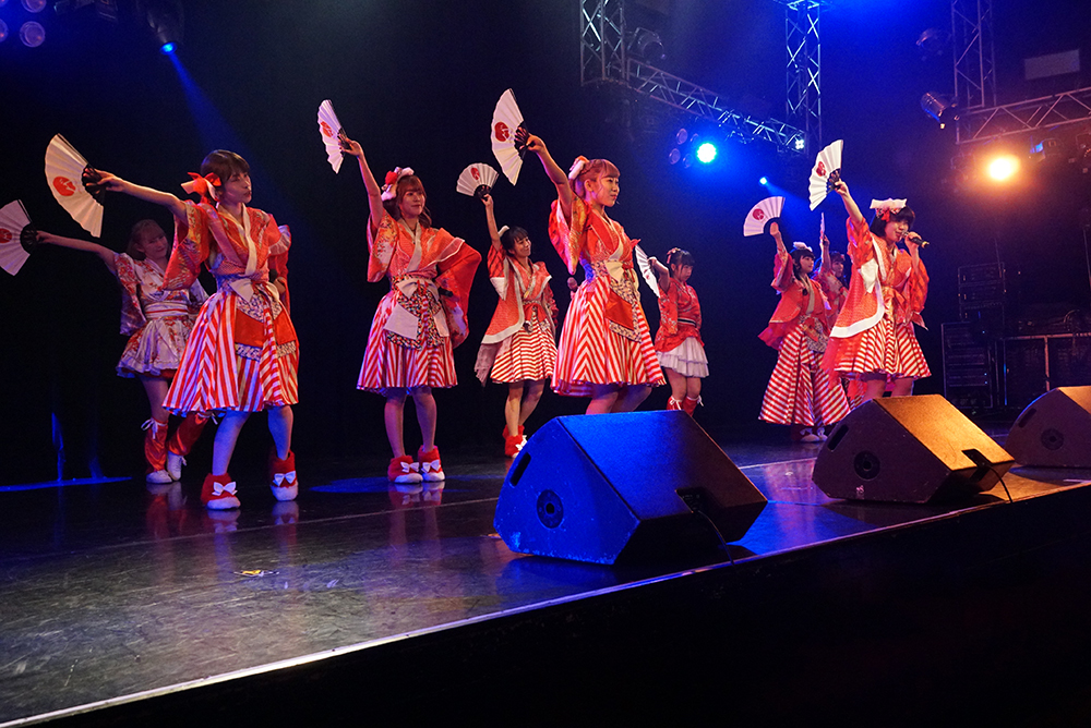 「日本を元気に世界へ発信!47都道府県天下統一アイドル」として活動中のBANZAI JAPAN。この日はメンバー藤崎しおりの誕生日も祝う形で実施。華やかで艶やかな物語を描くように、ライブは「十人十色」からスタート。メンバーたちは手にした扇子を巧みに振りながら、会場の空気を古の桃源郷に塗りかえてゆく。BANZAI JAPANのライブに触れていると愛でたい気分になれるのは、彼女たち自身が晴れた気持ちを持っている人たちだから。大勢のメンバーたちが舞台の上で気持ちを一つに歌い舞う姿は、とても鮮やかで晴々としている。その姿へ、いつの間にか僕らは釘付けになっていた。