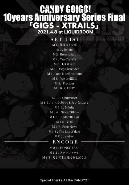 4月8日(木)、恵比寿LIQUIDROOMを舞台に結成10周年記念単独公演「CANDY GO!GO! 10years anniversary Series Final One Man LIVE “GIGS–XTRAILS”」を行なったCANDY GO! GO!。当日の模様を、ここに紹介します。