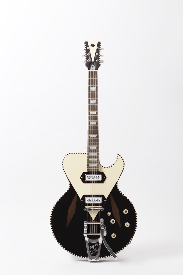 さらにピックガードも個性的な V 字型。これもクラフトマンのオリジナルデザインで愛らしい。ピックアップは 50 年代から GRETSCH(DuoJet)などに使用されていたダイナソニックピ ックアップを模したシングルコイル「TV-JONES」の T-ARMOND を搭載。ウォーミーでありながらシャープで繊細なサウンドを実現。ボディはアルダー素材のソリッドボディ。フラッグシップとなる V1 BLACK は、トリプルピックアップ。セレクターは 5 ポジションのスイッチングに加えプルポットを採用し7色の音色(レインボートーン)を奏でることができる。