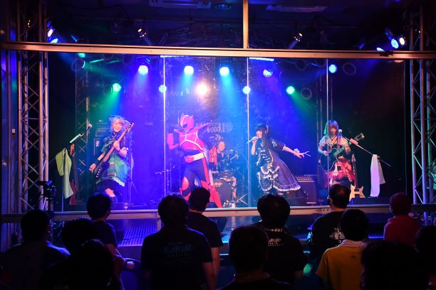ここからは、しばし「ヒーローショー」のコーナーへ。舞台に姿を現したのが邪悪将軍。彼は、観客たちに邪悪レーザーを降り注ぐ。その光を受け、観客たちが倒れ込むように、訪れた人たちも空気を読んで楽しんでいた。さすが、そこは大人な対応だ。観客たちを支配しようとする邪悪将軍から救おうと、3人の正義の使者レディービートル(Empress)が舞台へ登場。壮絶(??)な(茶番のような)バトルが繰り広げられる。邪悪将軍は意外に強く、3人へ邪悪な心を植えつけようとしてゆく。その窮地を救うべく、イズカイザーが登場。イズカイザーは、手にしたハリセンを使って攻撃を仕掛ける。イズカイザーと邪悪将軍は戦いの場をフロアに移し、観客たちの目の前で戦いだす。その様をプロレス中継のように実況解説を入れてゆく演出が、なかなか冴えているじゃない。イズカイザーは正義のヒーローのくせに、椅子を使ったラフプレイや邪悪将軍のマスク剥ぎまでやってしまう。邪悪将軍も、マスクの下にもう一つマスクを付けているところもさすがだ。イズカイザーも邪悪将軍もさまざまなプロレス技を披露。最後は、イズカイザーが3カウントを奪い勝利。というか、いつの間にかバトルがプロレスに変わっていたように、そこがひねりを効かせたバックドロップならぬFullMooNのライブを舞台にしたヒーローショーらしさ。