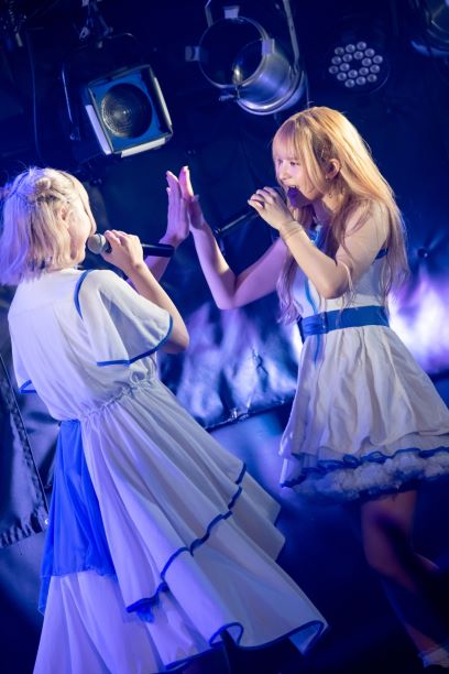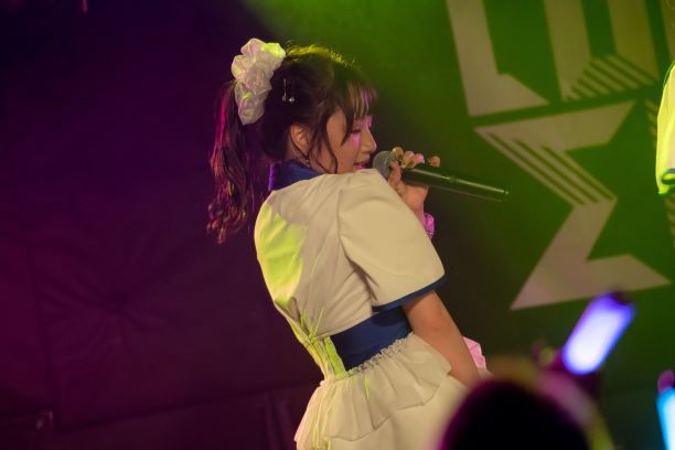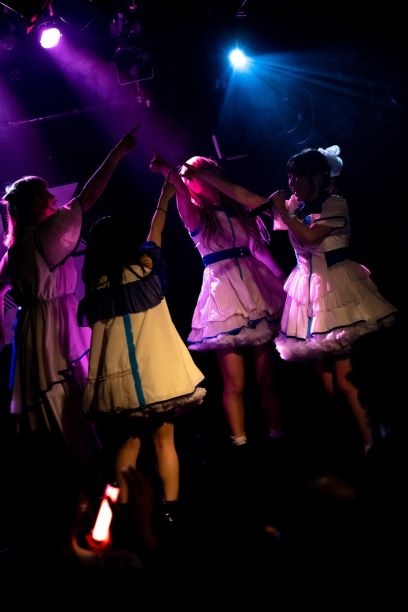 次のブロックは、スタイリッシュでアーバンなお洒落チューンの「微レ存ガール」からスタート。アタックの強い激しいビートとカラフルな音が飛び交う中、彼女たち自身の多色な歌声が、観ている人たちのハートを色鮮やかに染めてゆく。舞台の上、頭上に掲げた手を中心に円を描くようにまわる姿や、手をくるくるまわしながら飛び跳ね歌う姿も、とてもキュートだ。